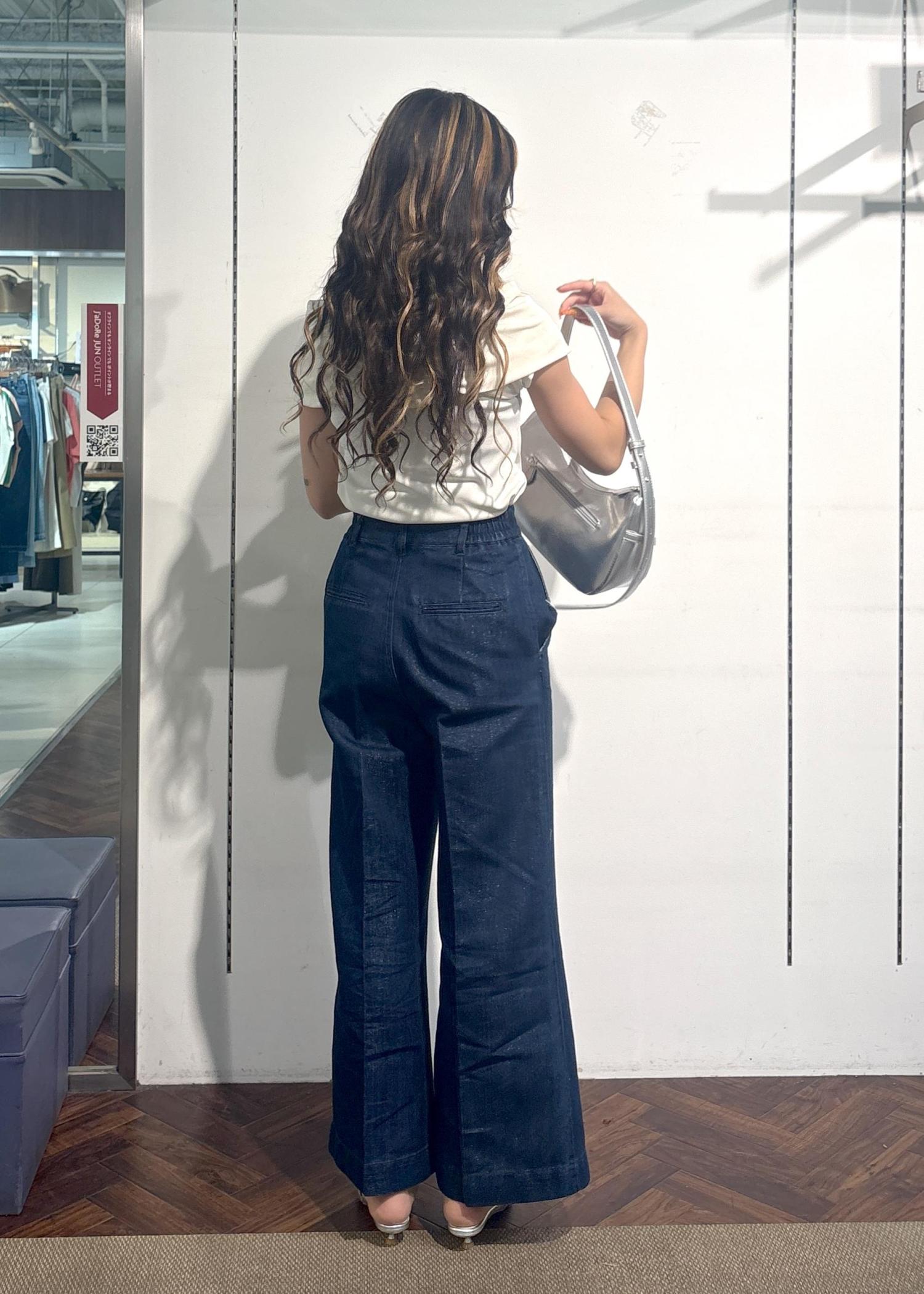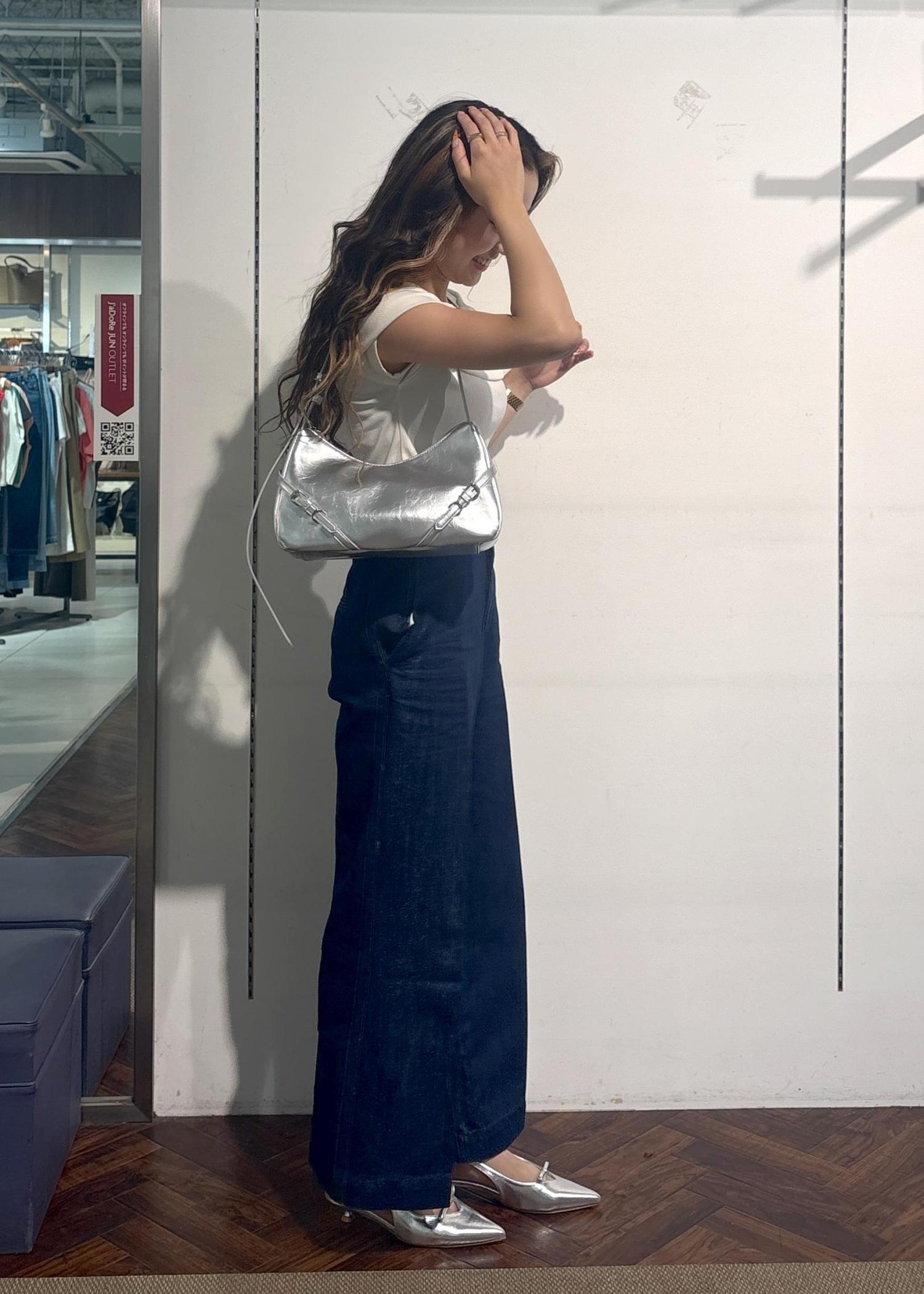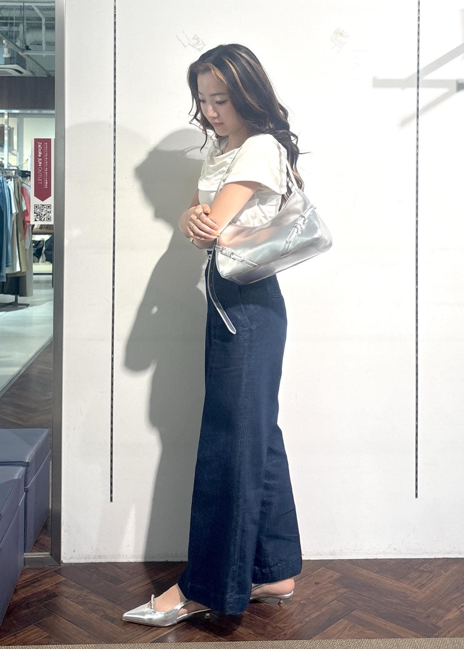 コンパクトで華奢見えこれ一枚で女性らしいスタイリングが完成するトップスにキラっと光る素材が特徴のワイドシルエットデニムを合わせて周りの人からたくさん褒められる事間違いなしのコーデです!