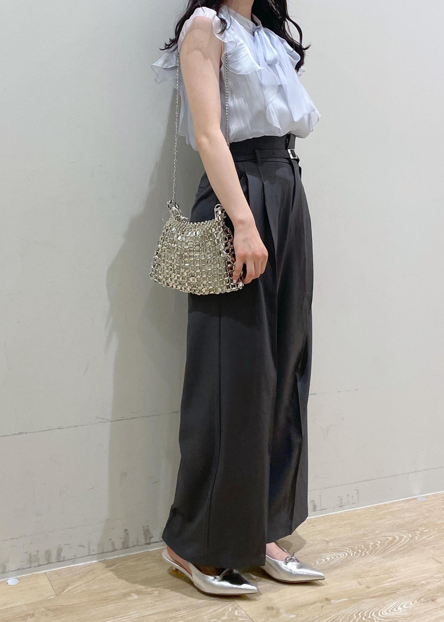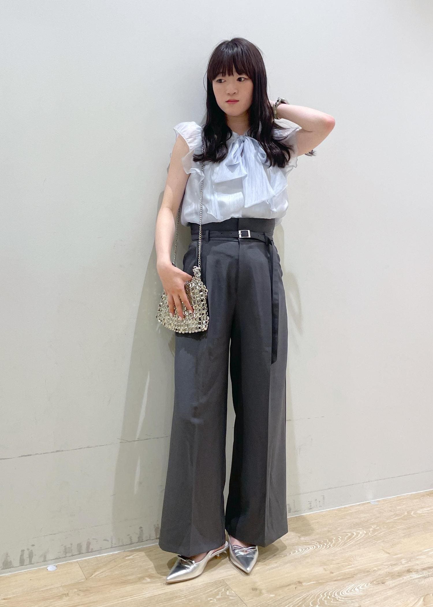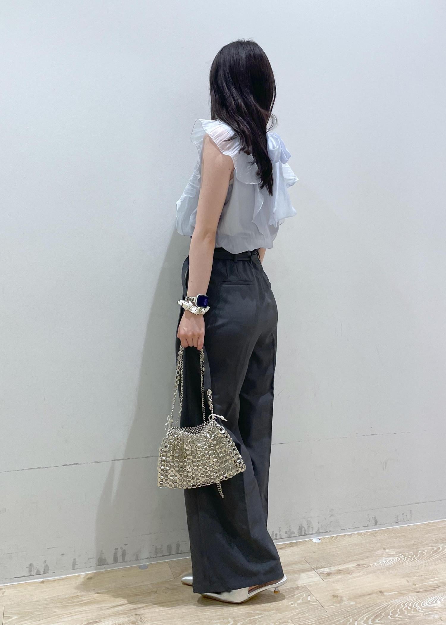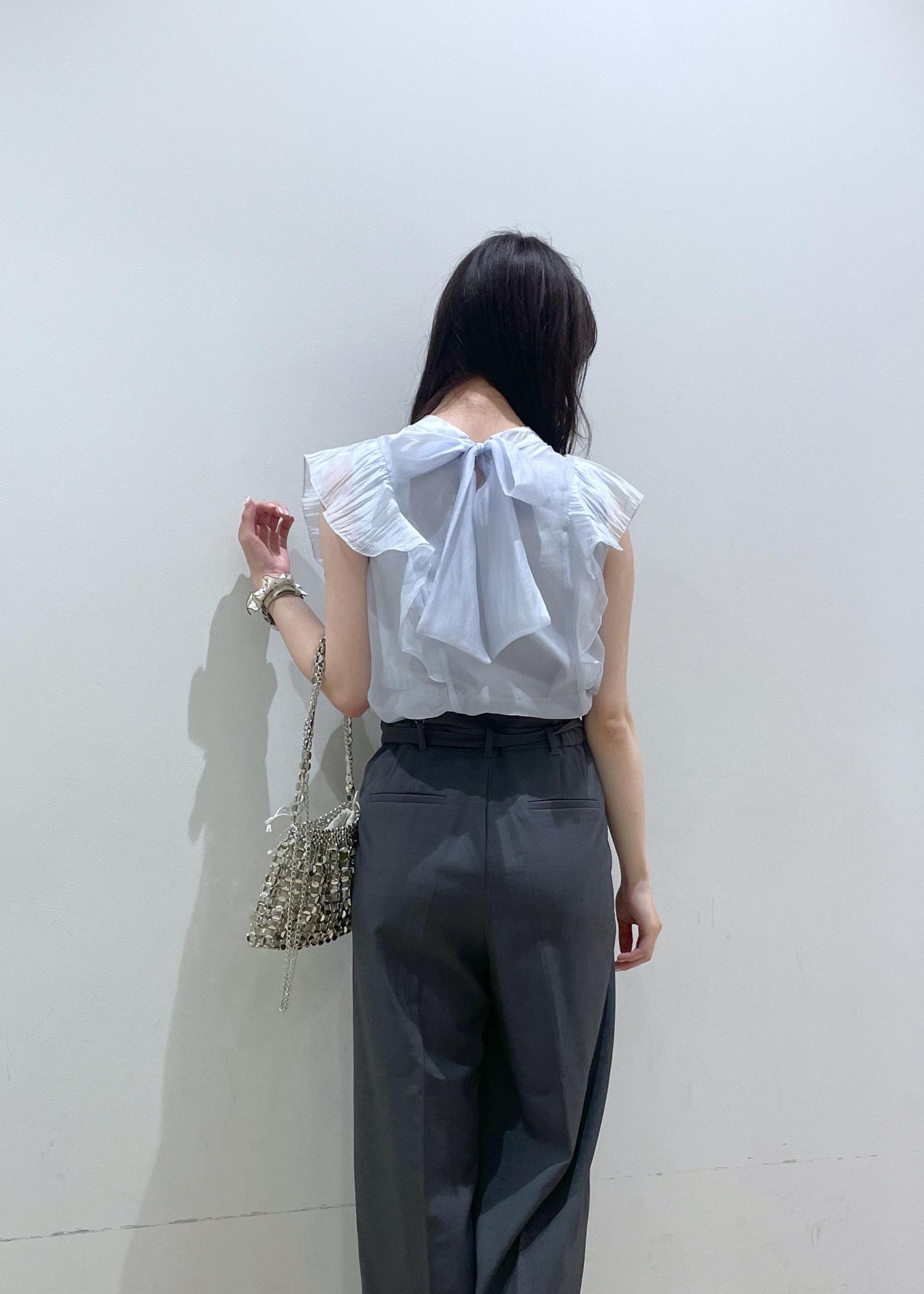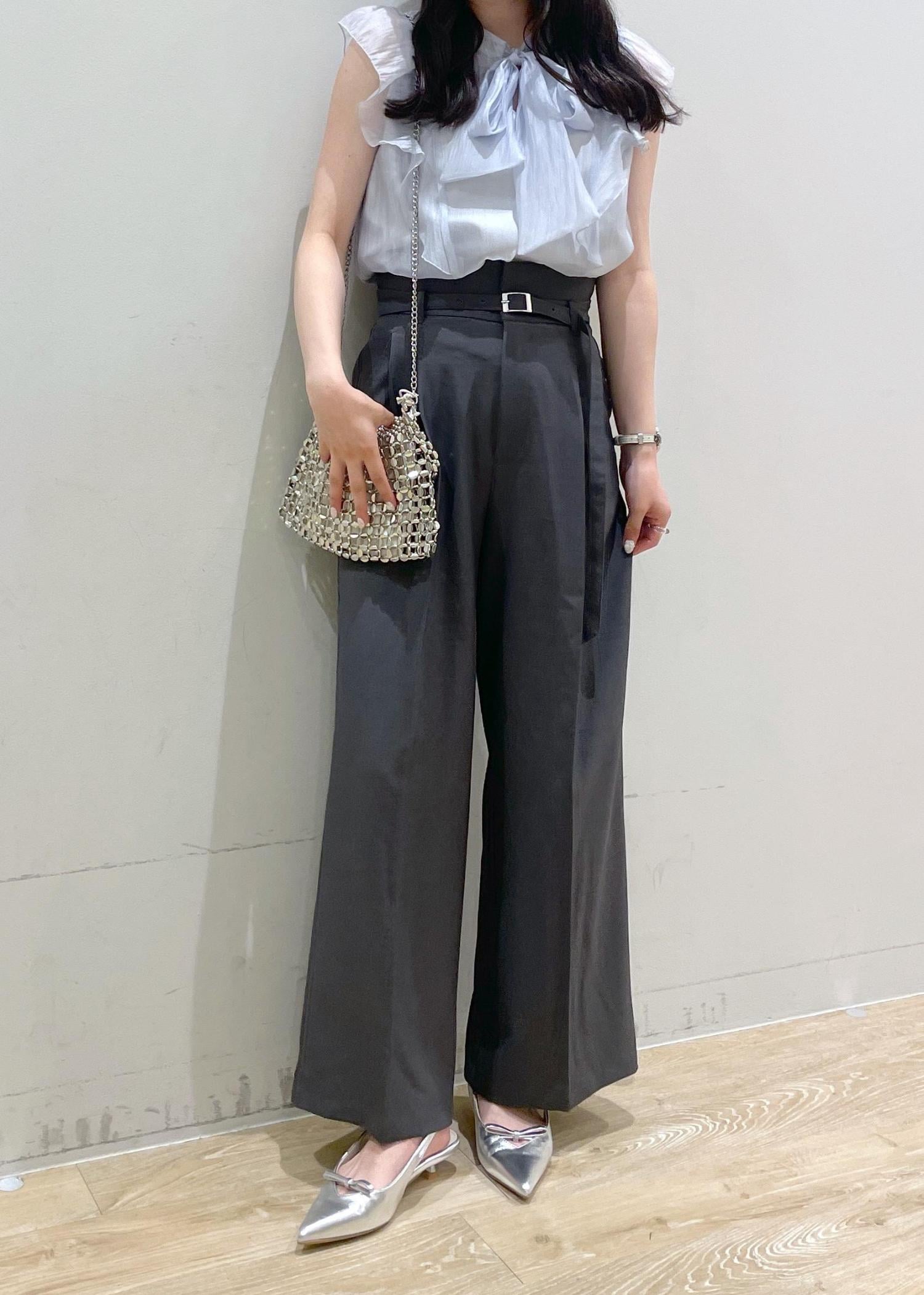 大きなリボンがかわいい甘めなブラウスを、スラックスでバランスを取り、普段使いしやすいスタイリングにしてみました!