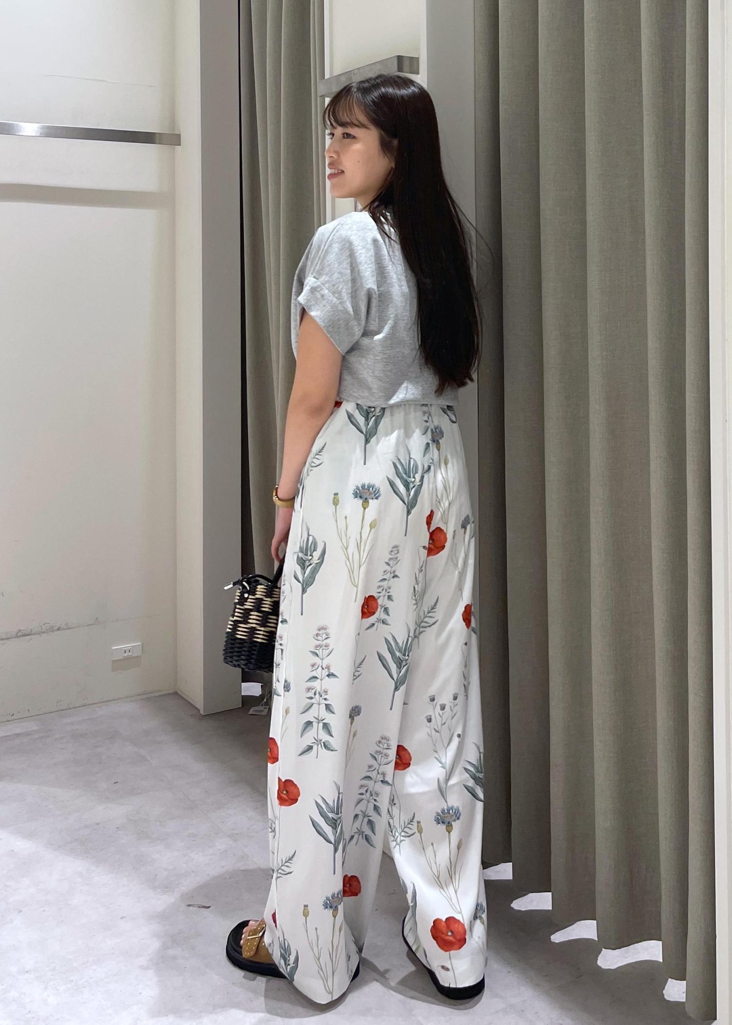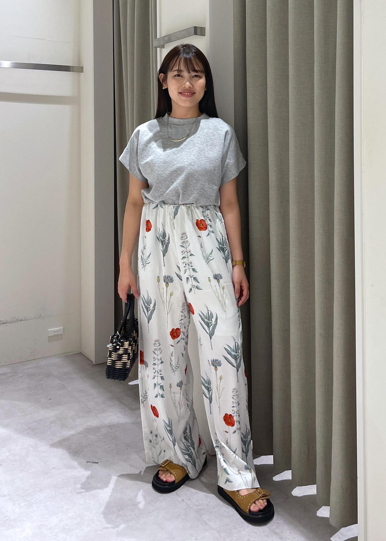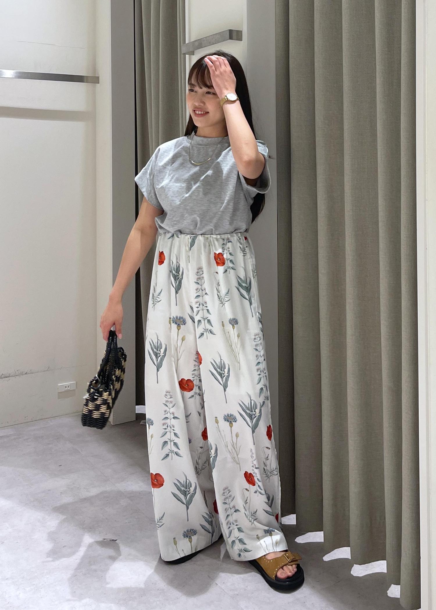 お花が綺麗なプリントのパンツにグレーのカットソー合わせで