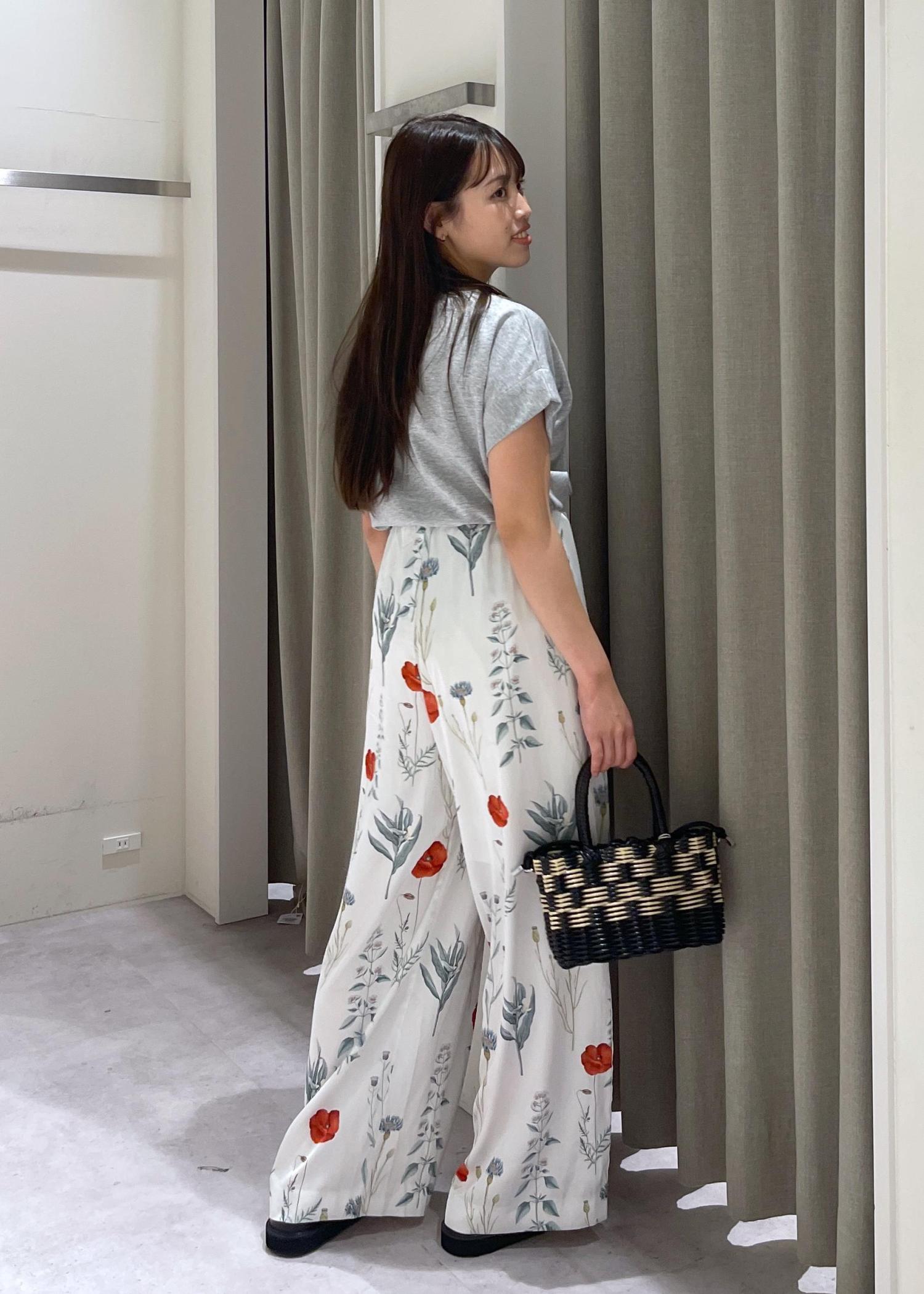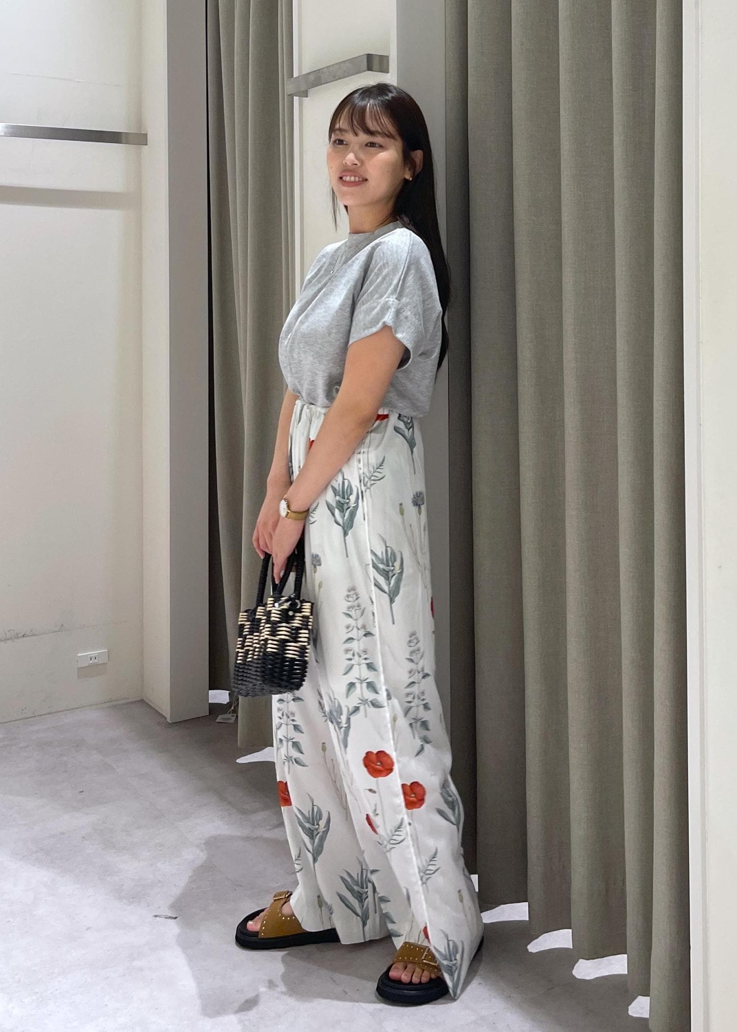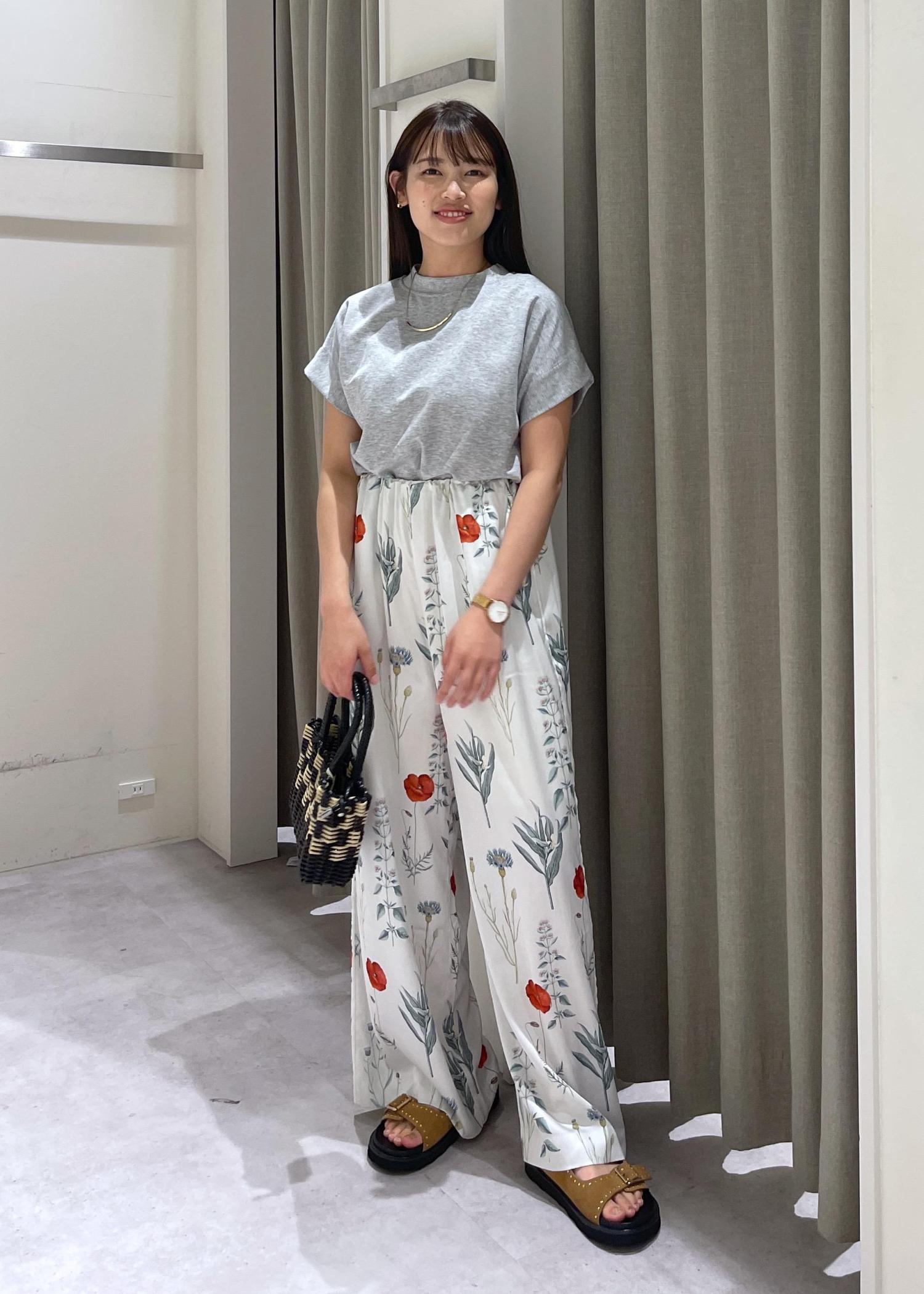 お花が綺麗なプリントのパンツにグレーのカットソー合わせで