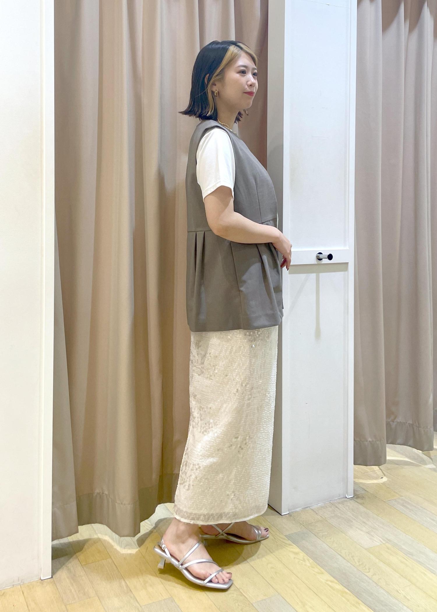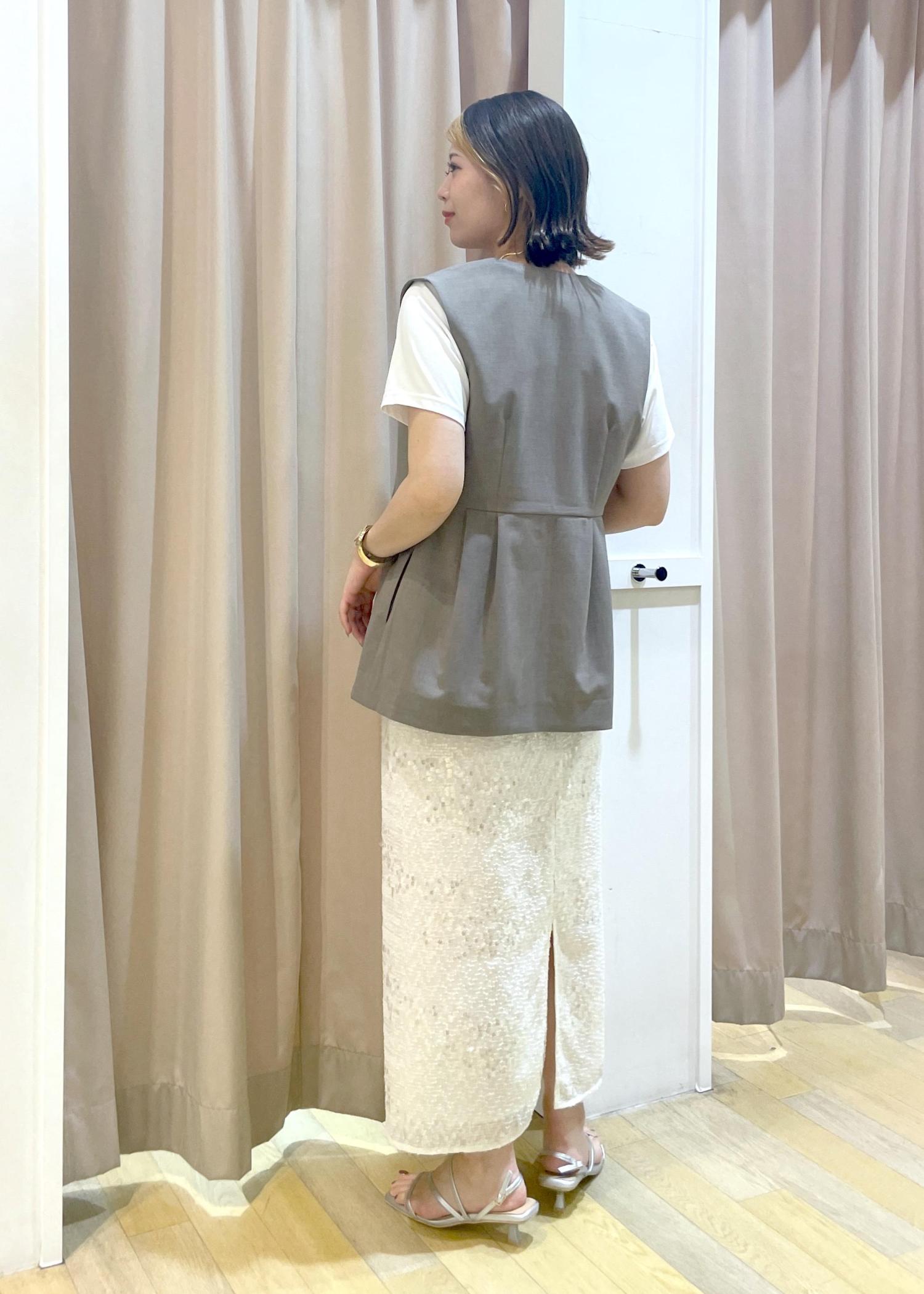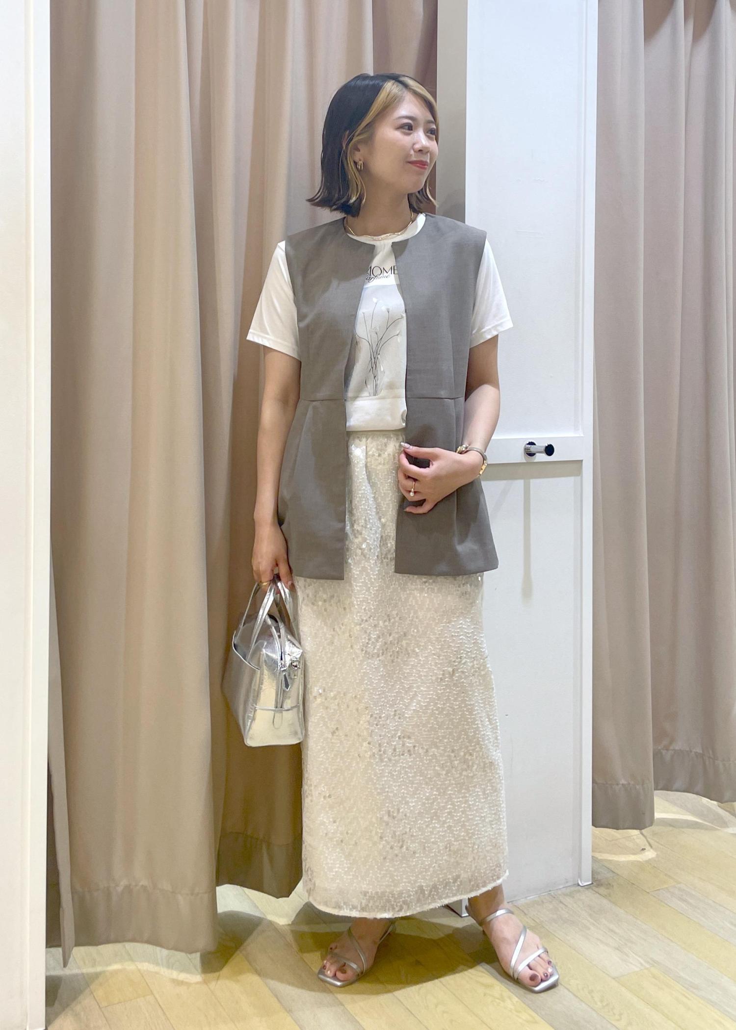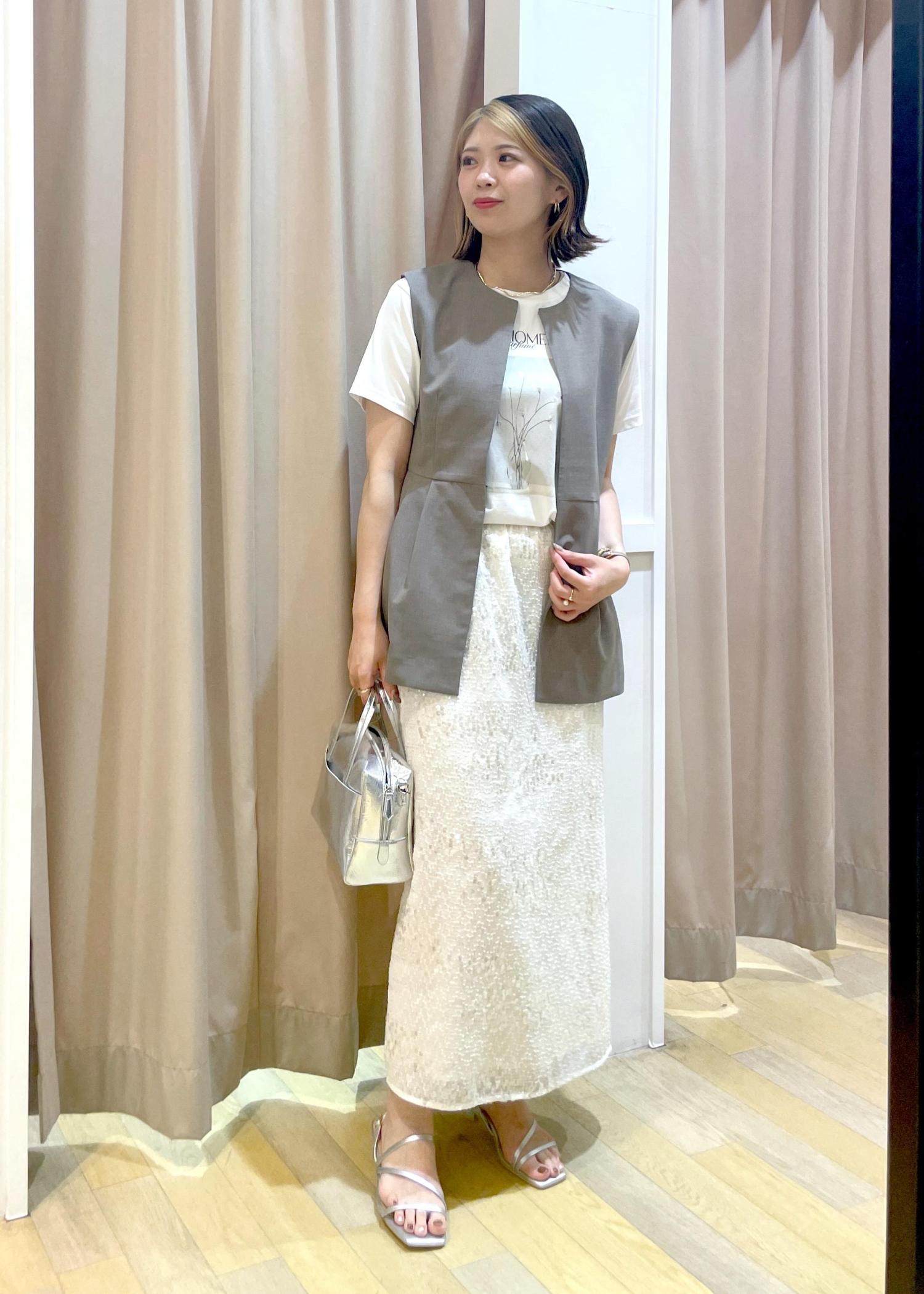 ロゴTにスリーブレスジャケットを合わせて大人カジュアルなスタイリングにしました。