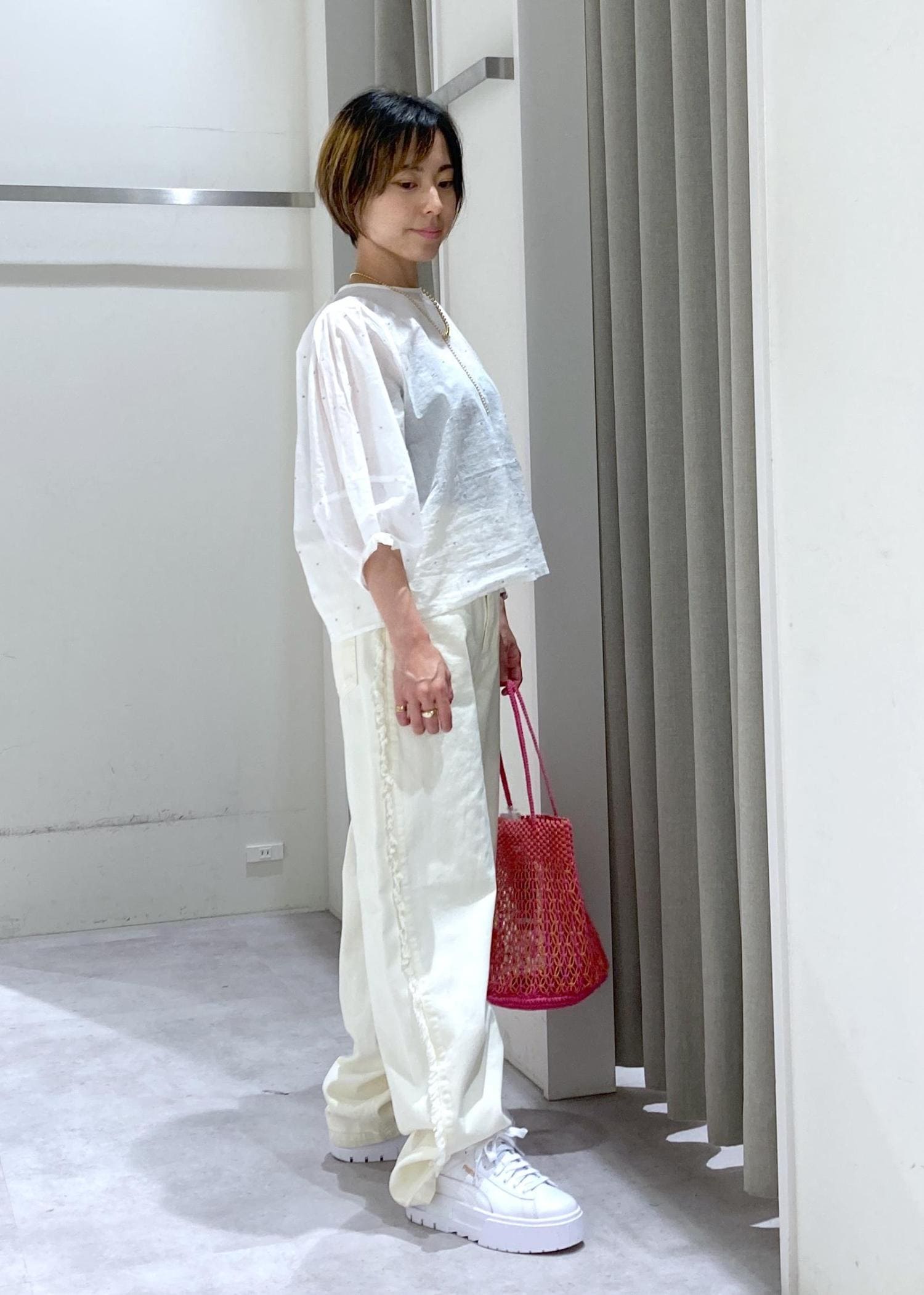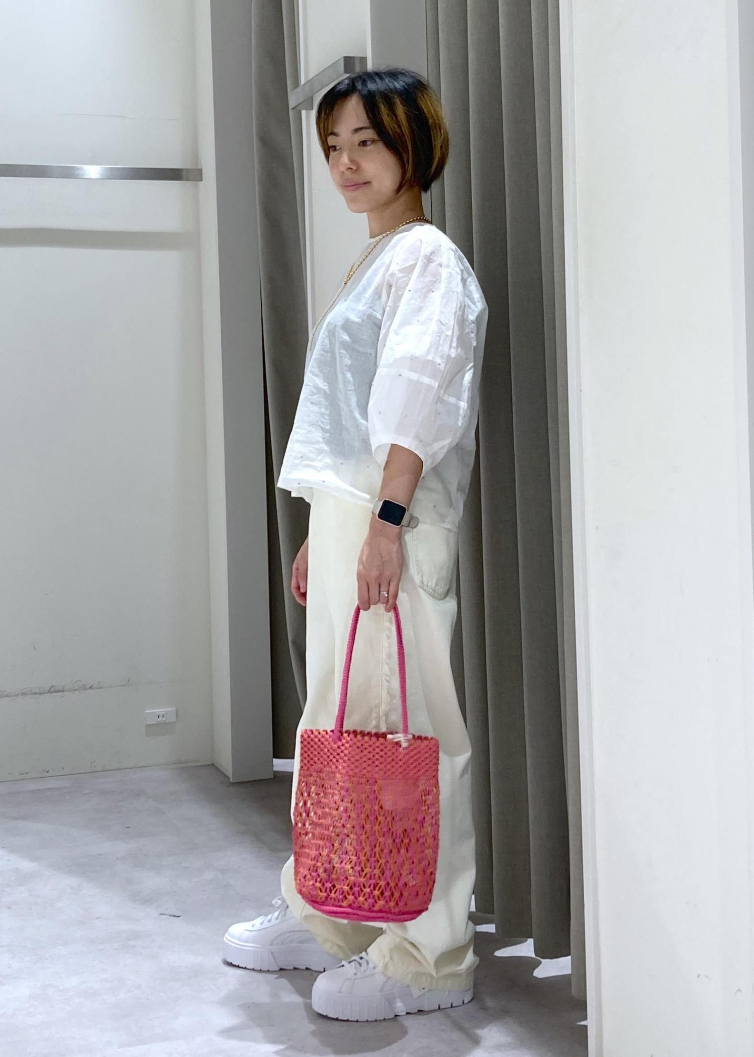 BAGはピンクでアクセントに。