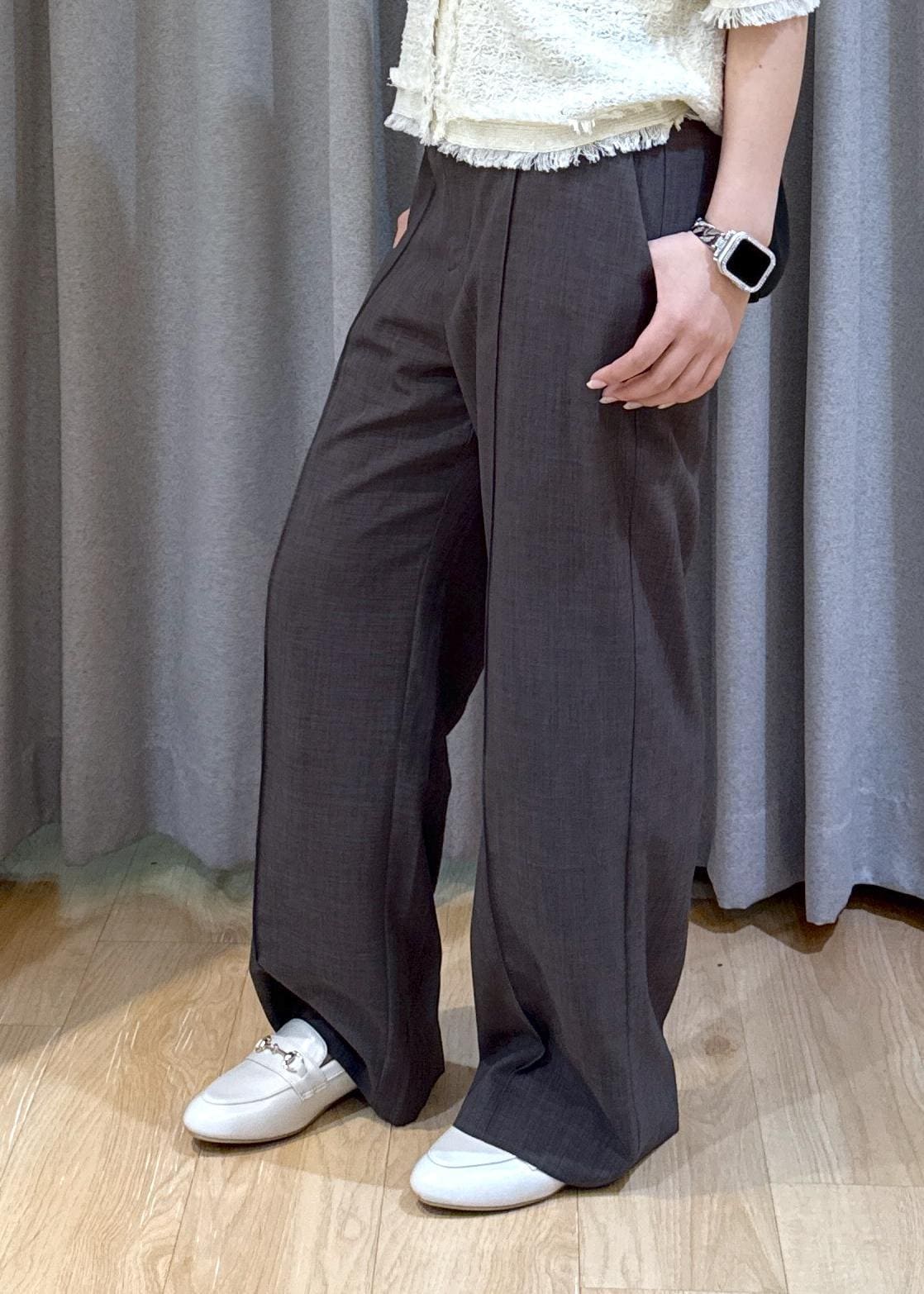 私はダボっと着用するのが好きなので腰の位置を下げていますが腰に合わせるとぴったり足首までの長さになります!またさらっとした肌触りなので涼しく感じられます!