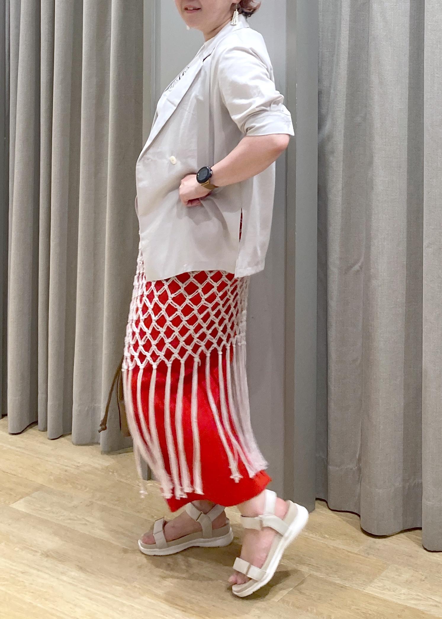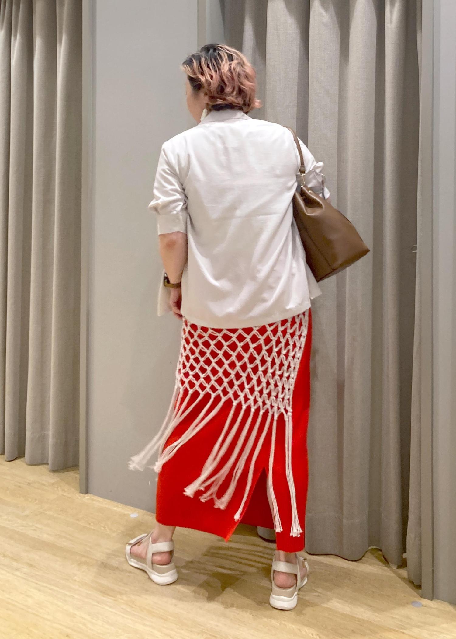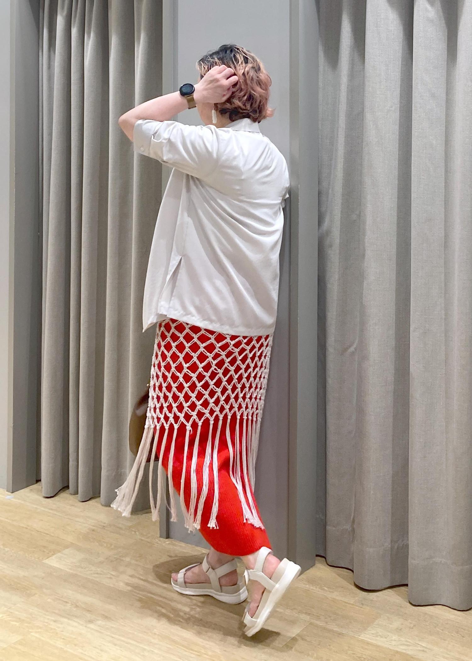 真っ赤なスカートに、ネットの巻きスカートで遊び心あるスタイルで、休日の気分もぐっと上がります♪