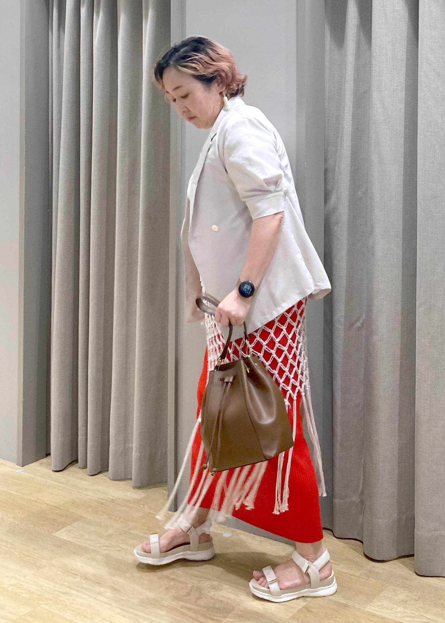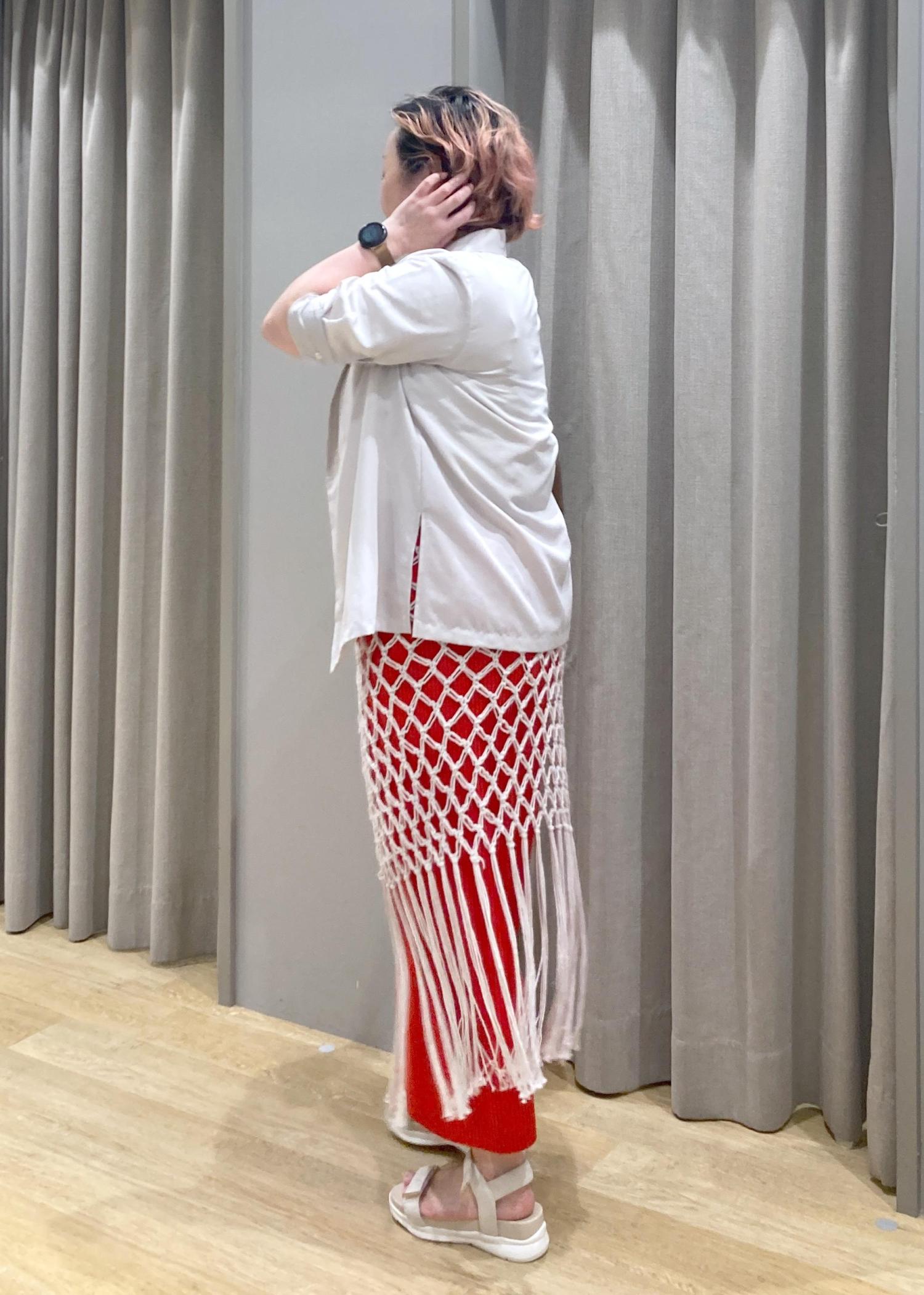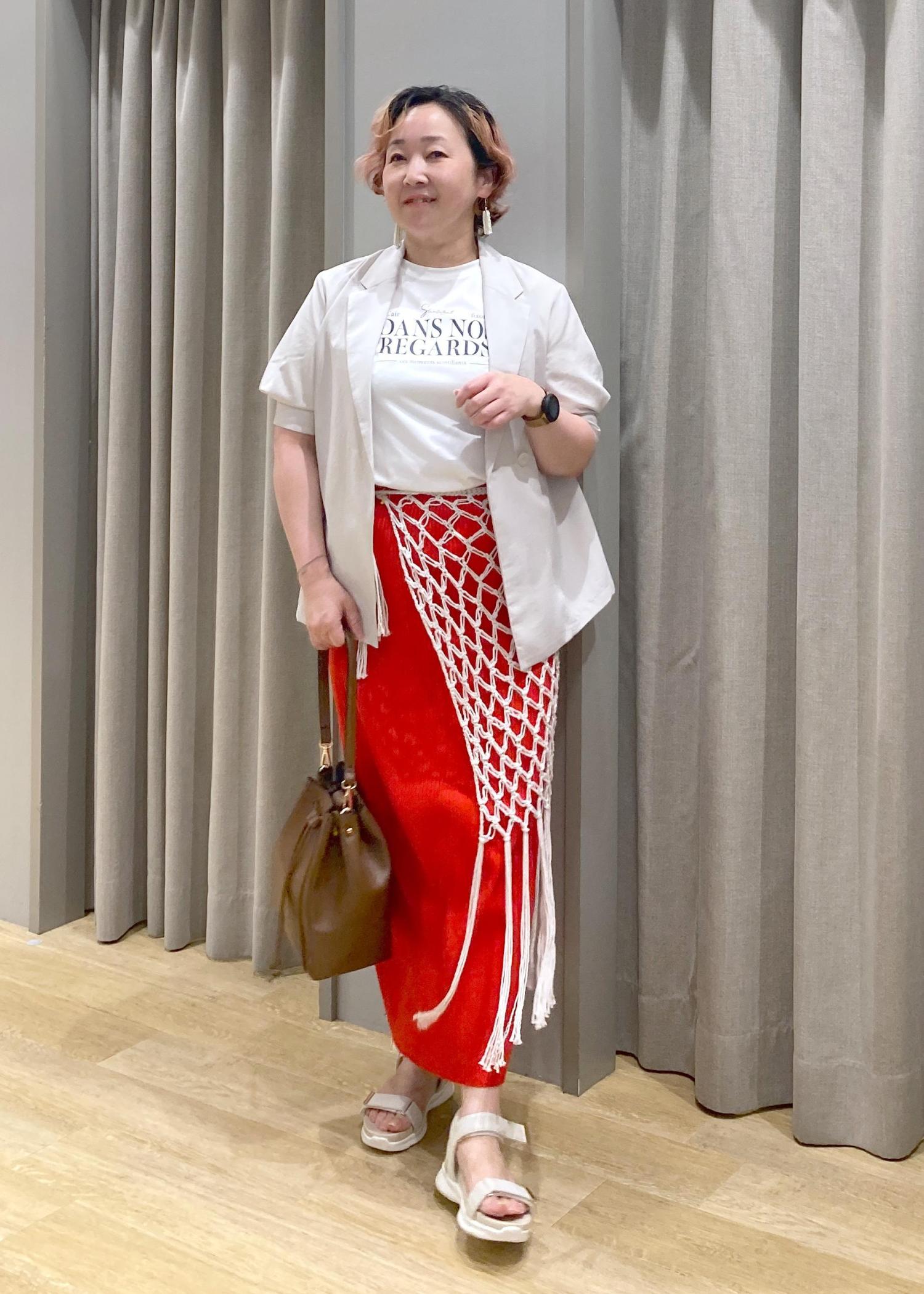 真っ赤なスカートに、ネットの巻きスカートで遊び心あるスタイルで、休日の気分もぐっと上がります♪