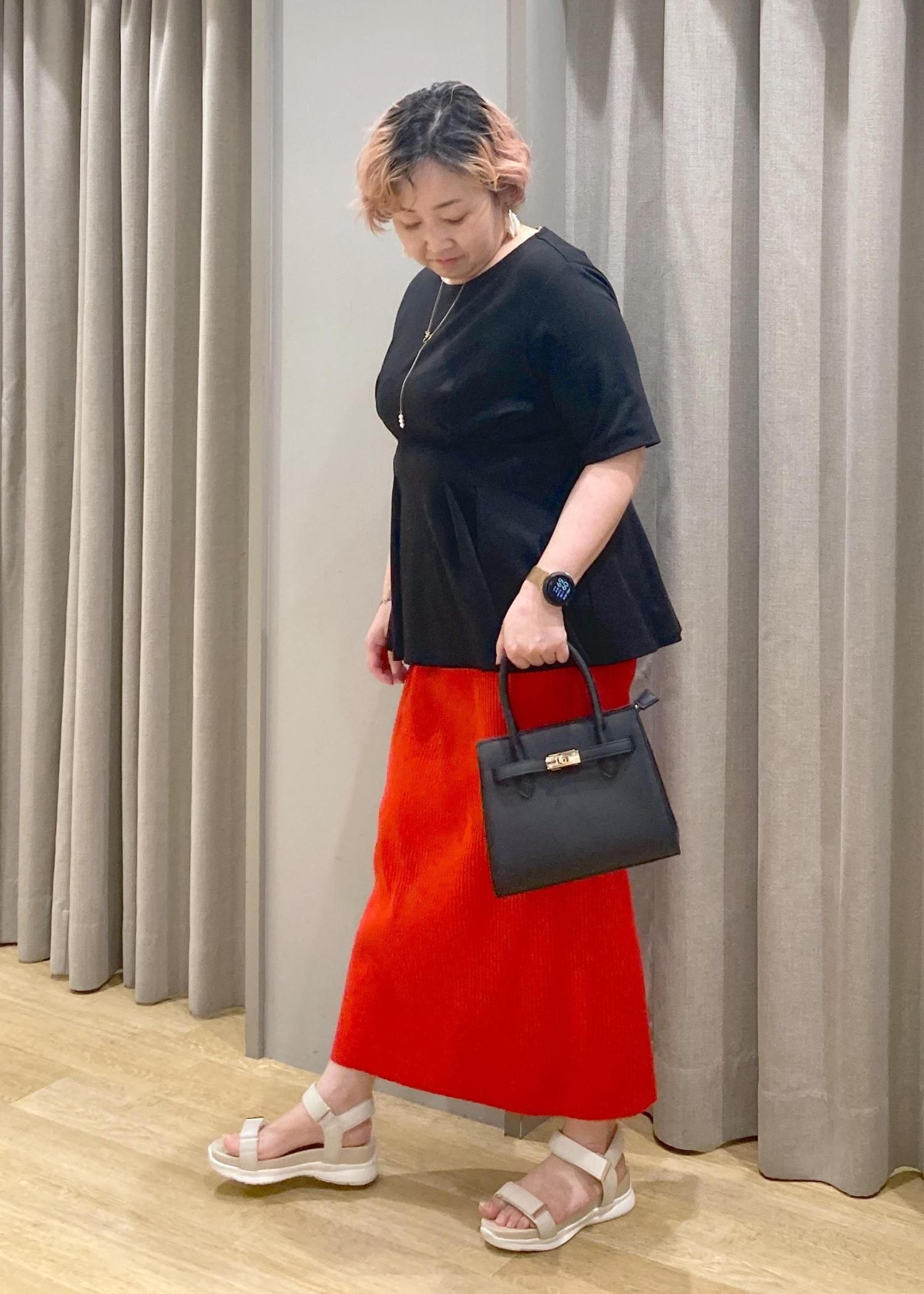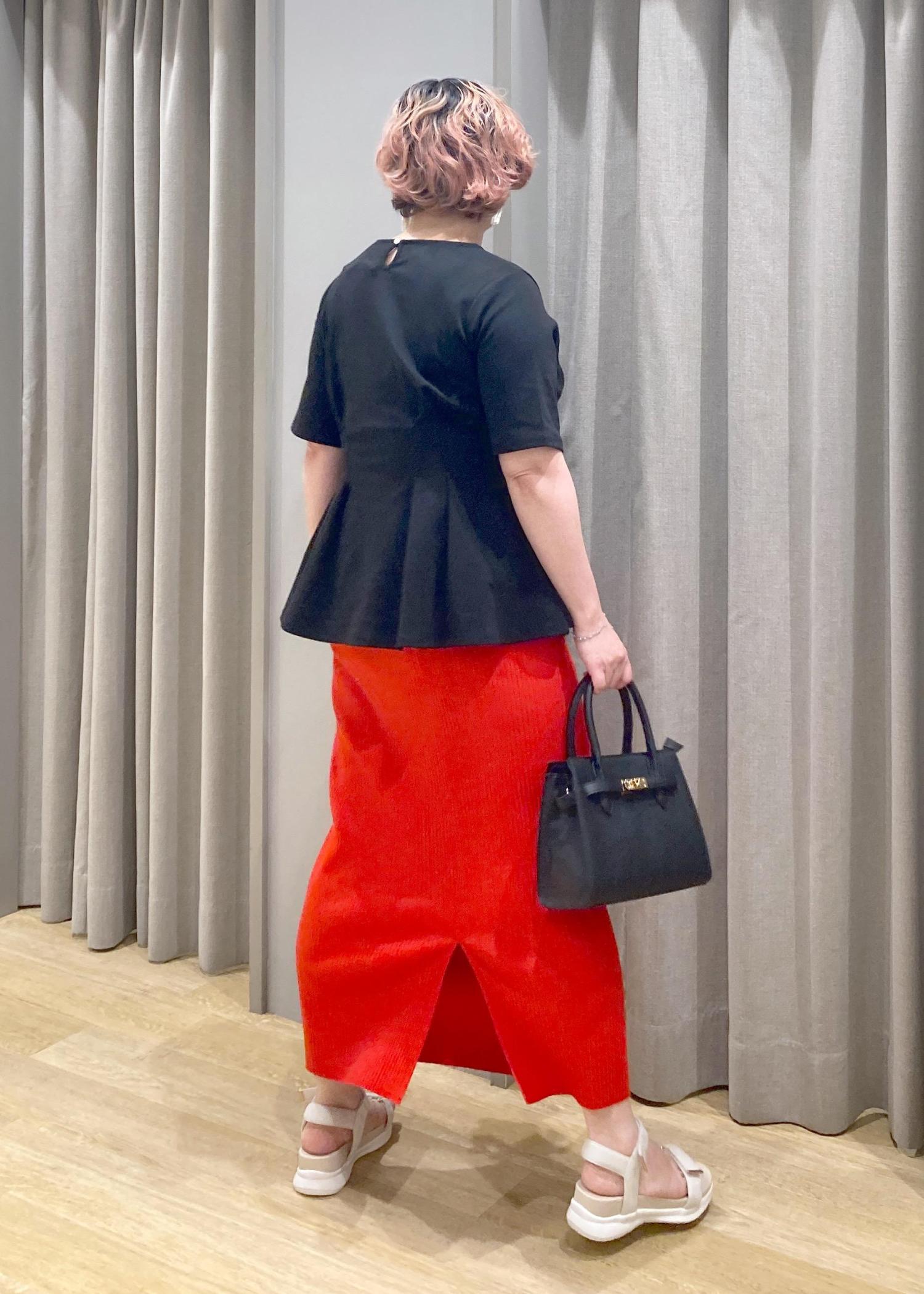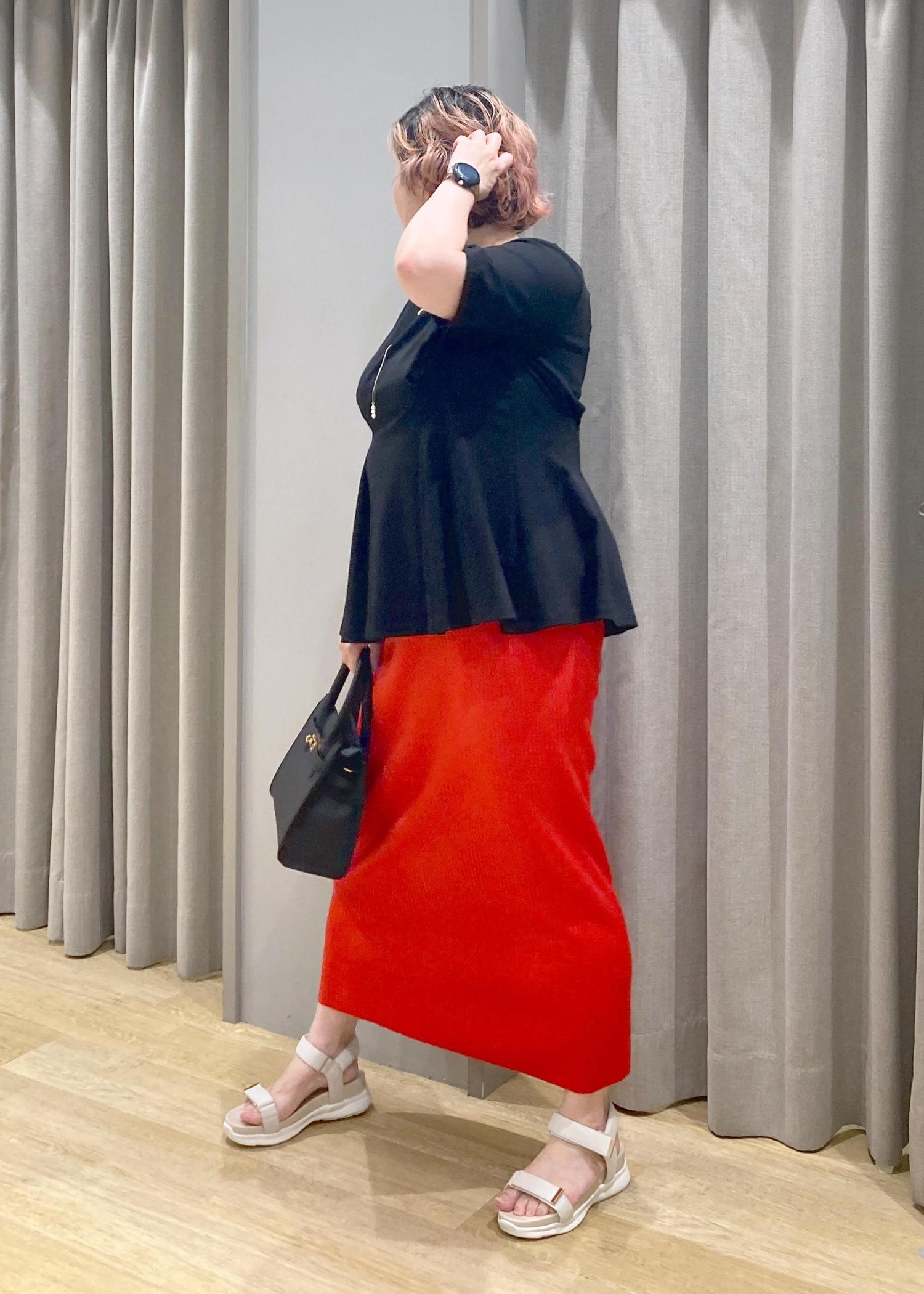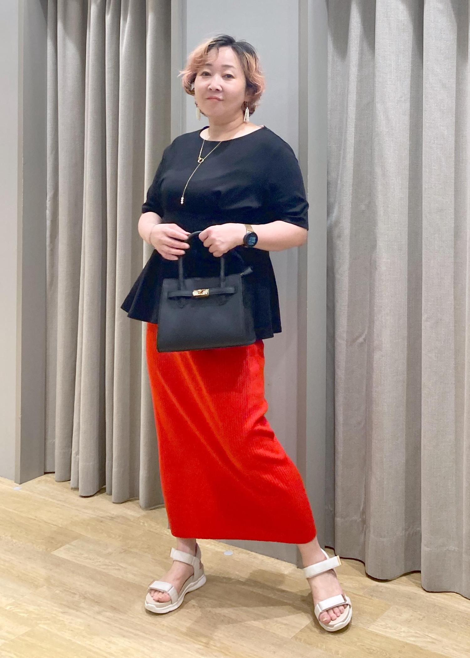 上半身はペプラムトップスでふんわり体型カバーしつつ、下はパキッと赤でパッと目を引く主役スカート!