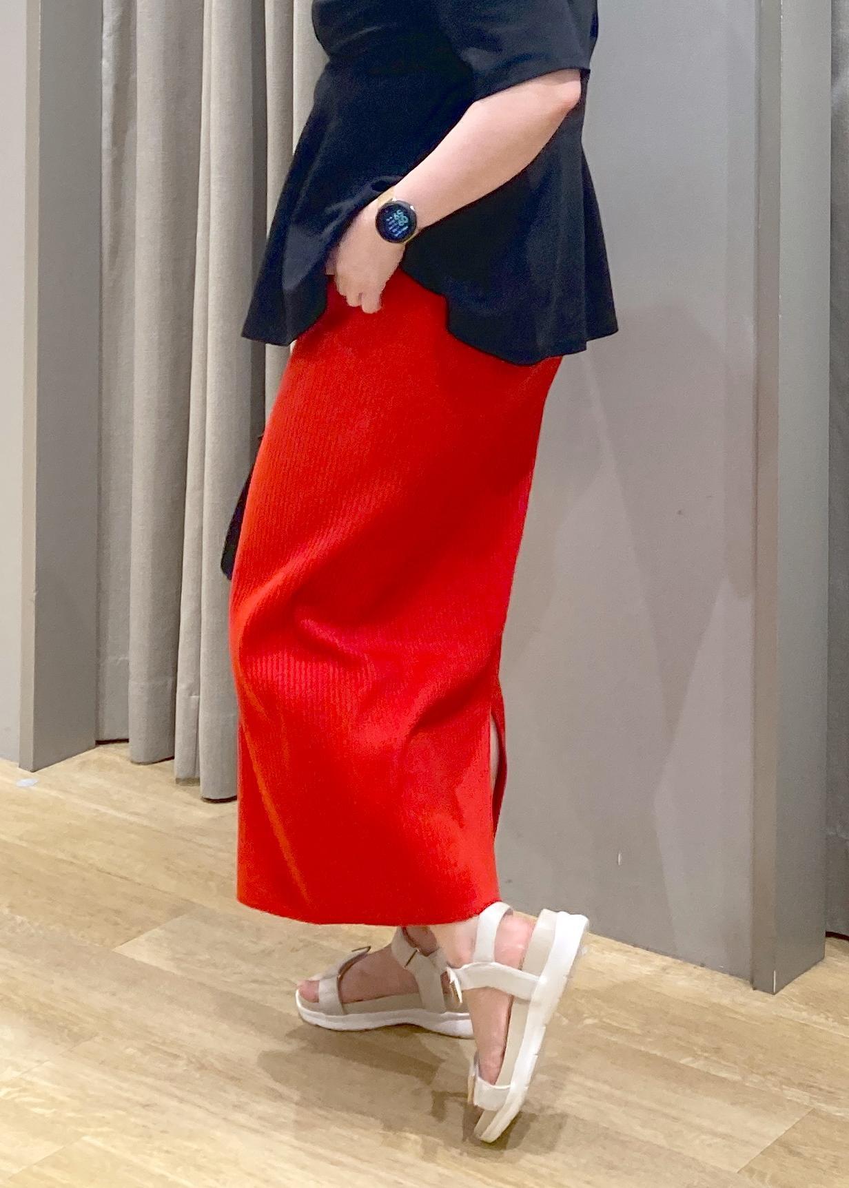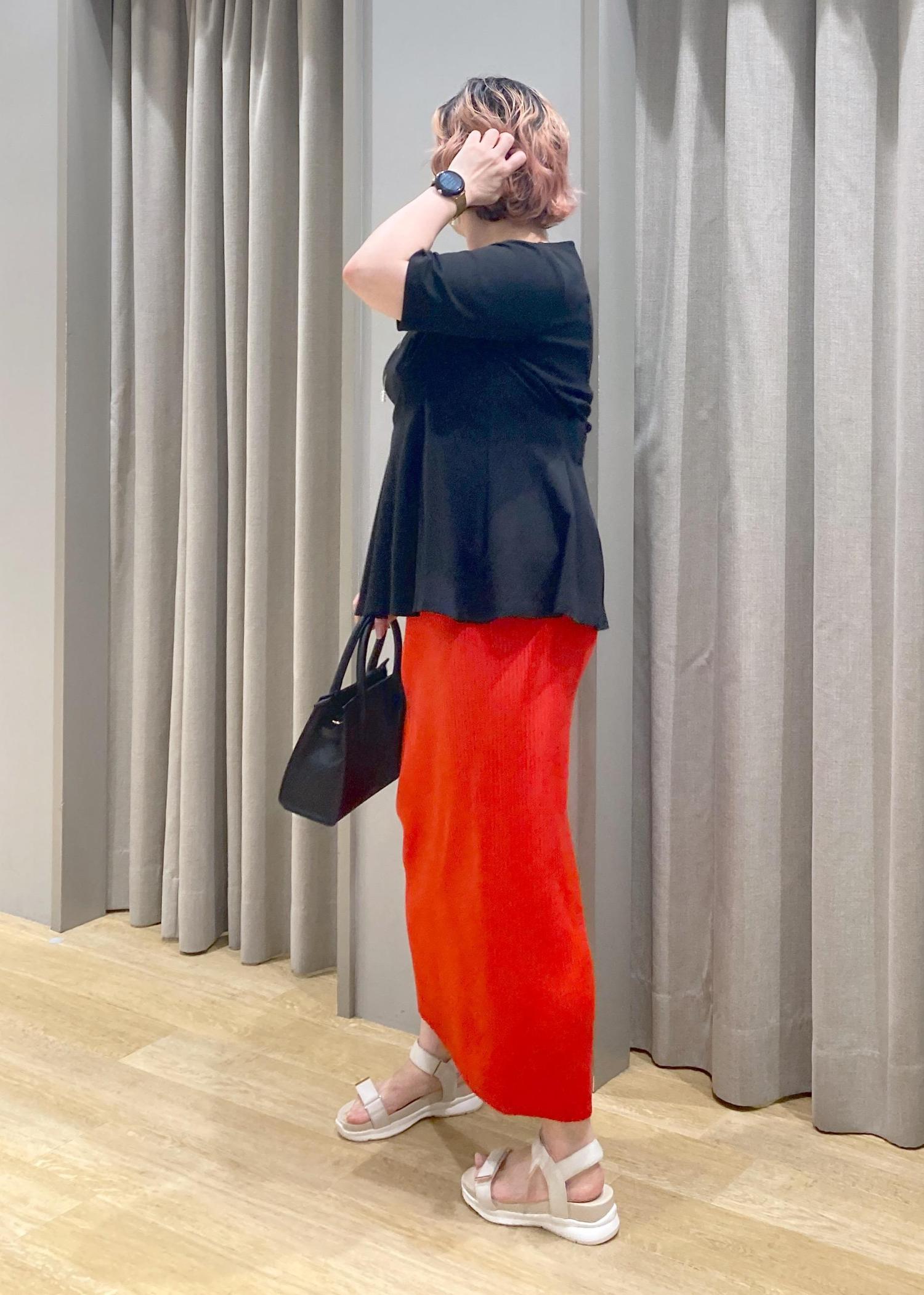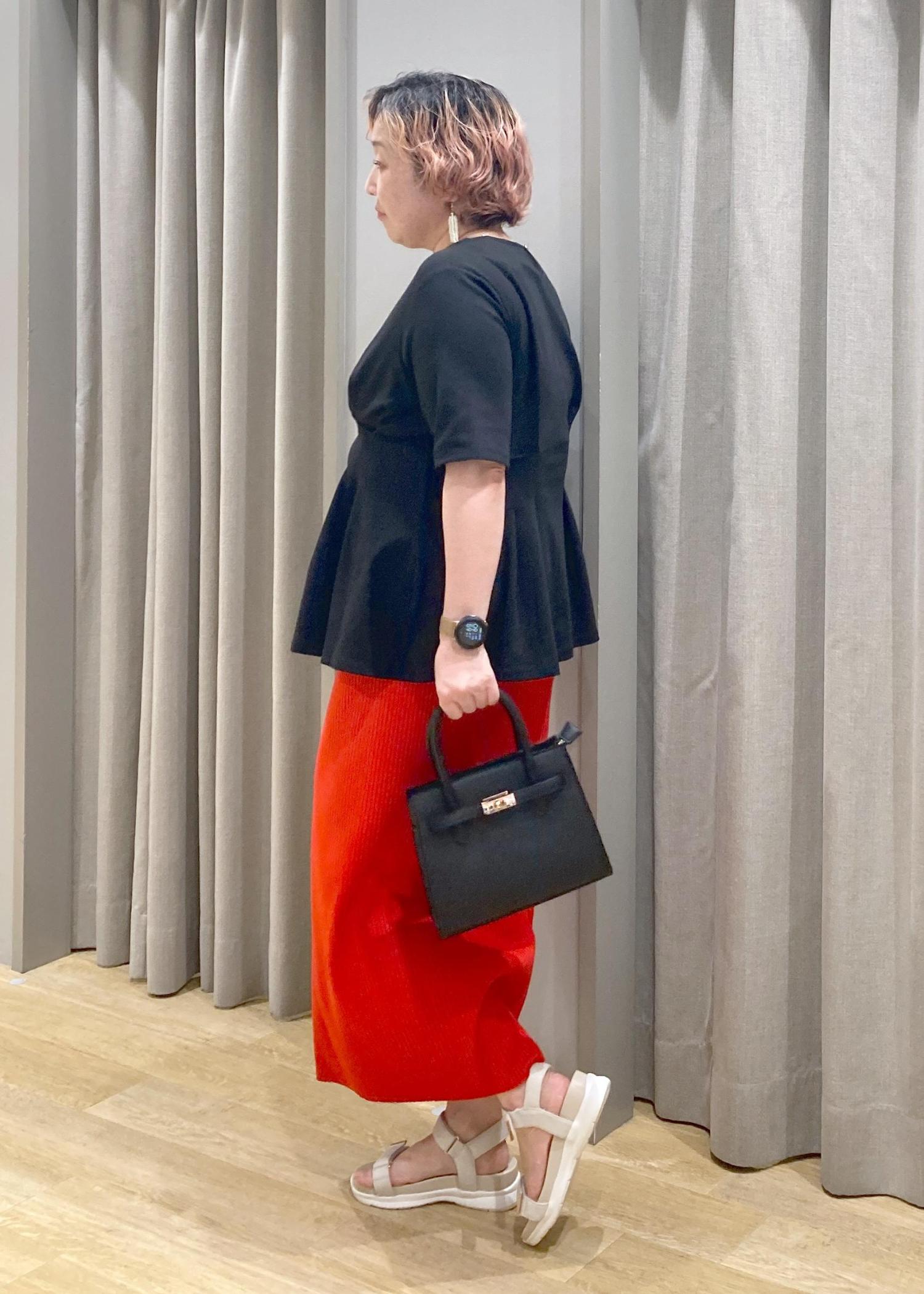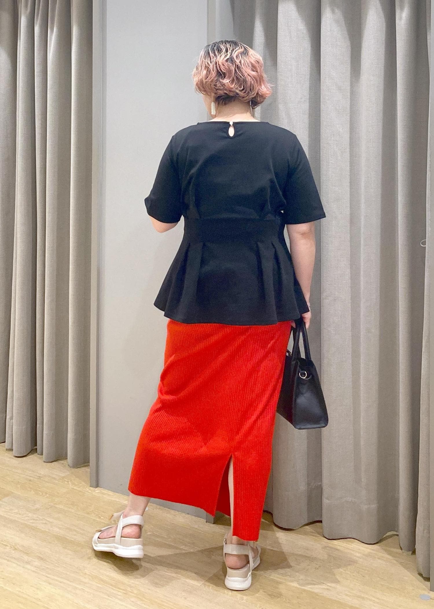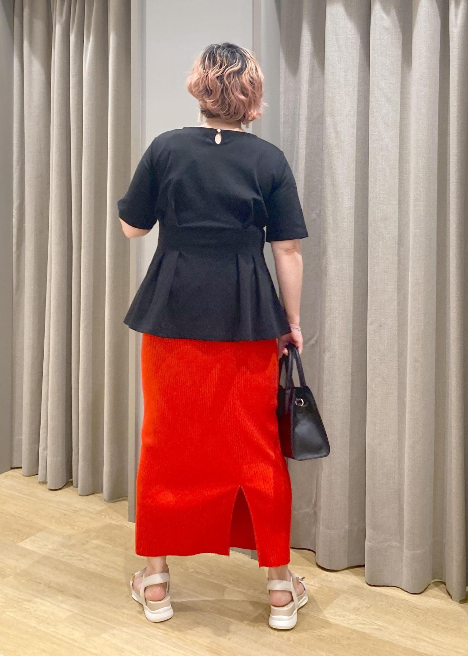 上半身はペプラムトップスでふんわり体型カバーしつつ、下はパキッと赤でパッと目を引く主役スカート!