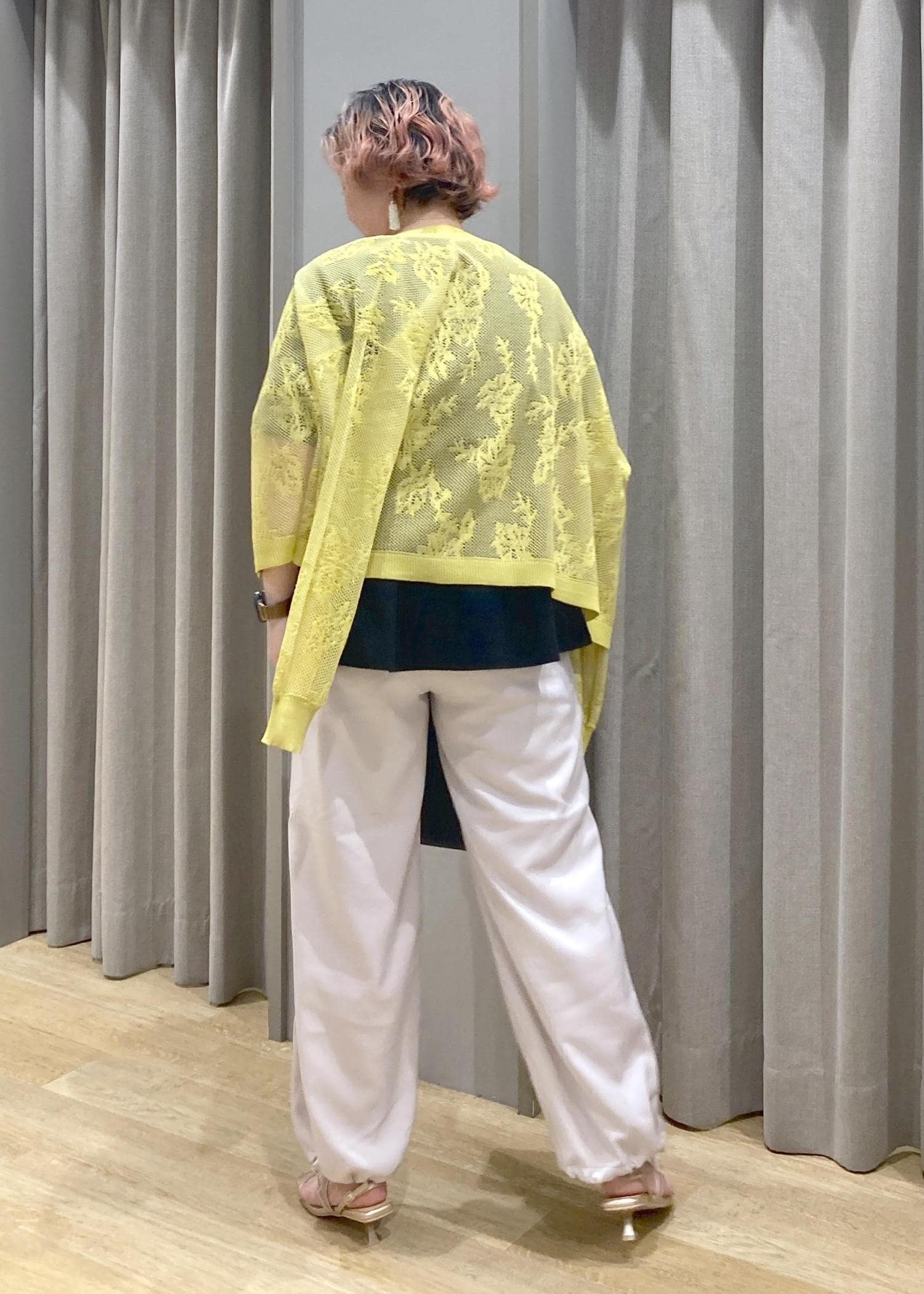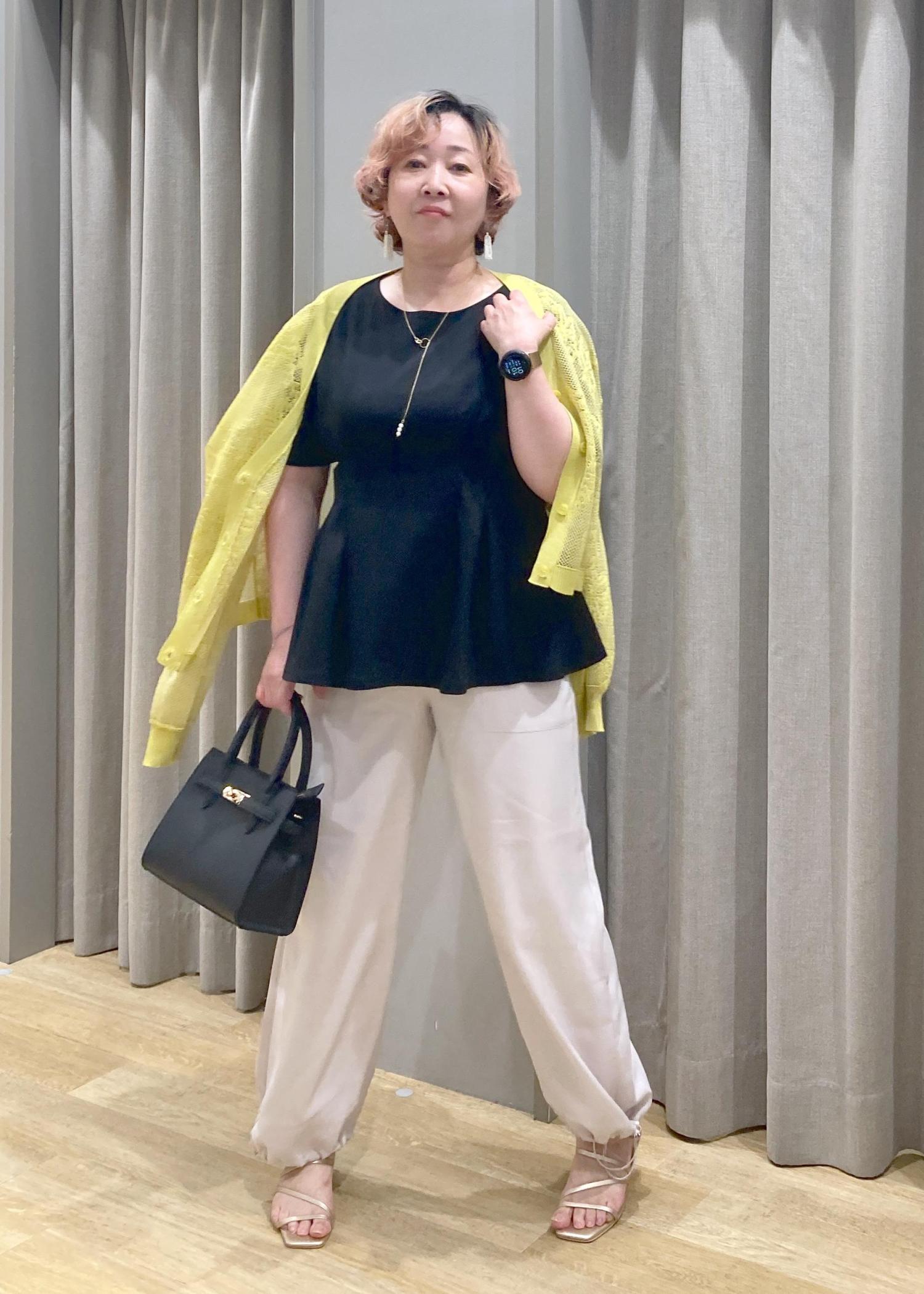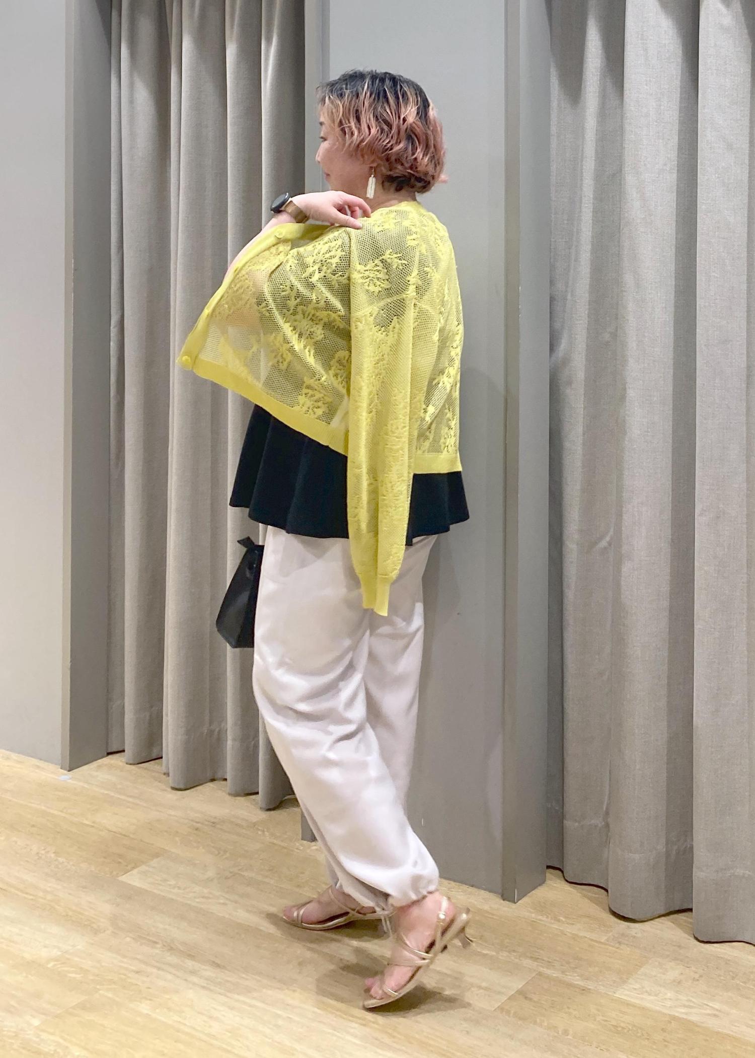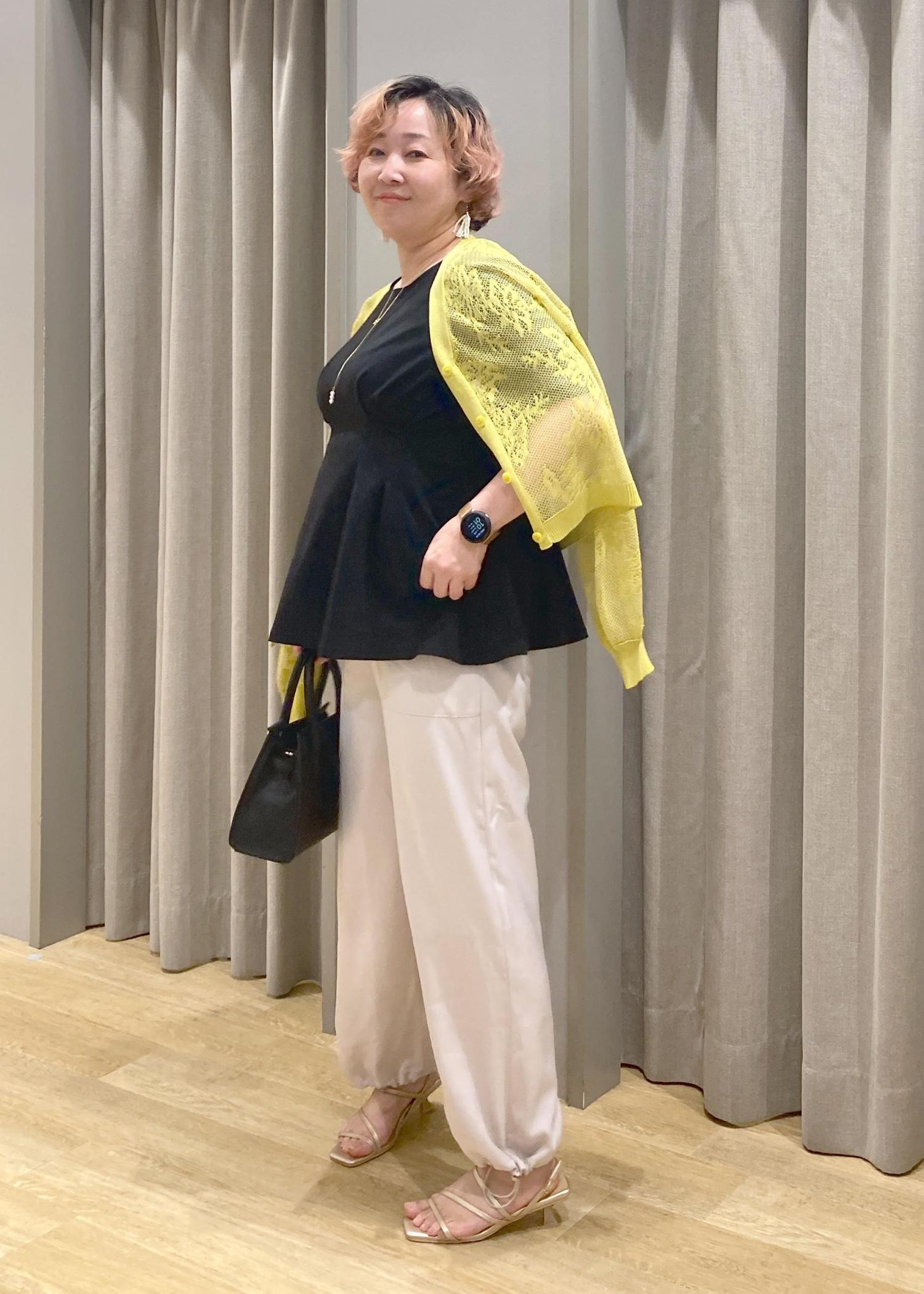 肩にかけたイエローのカーディガンは、ほんのり秋っぽい落ち着いた色味で、夏から秋にかけての“ちょうどいい”差し色に◎