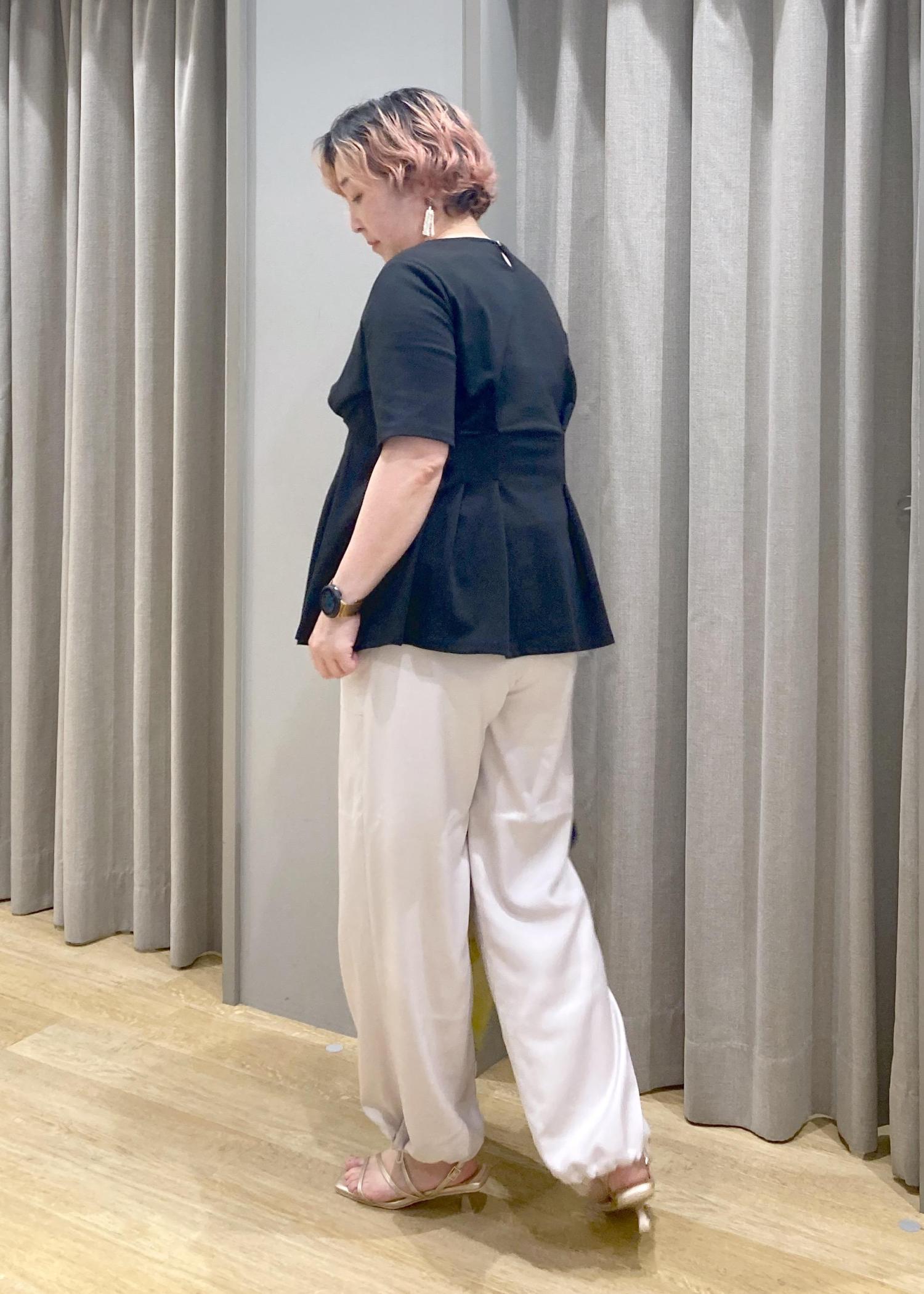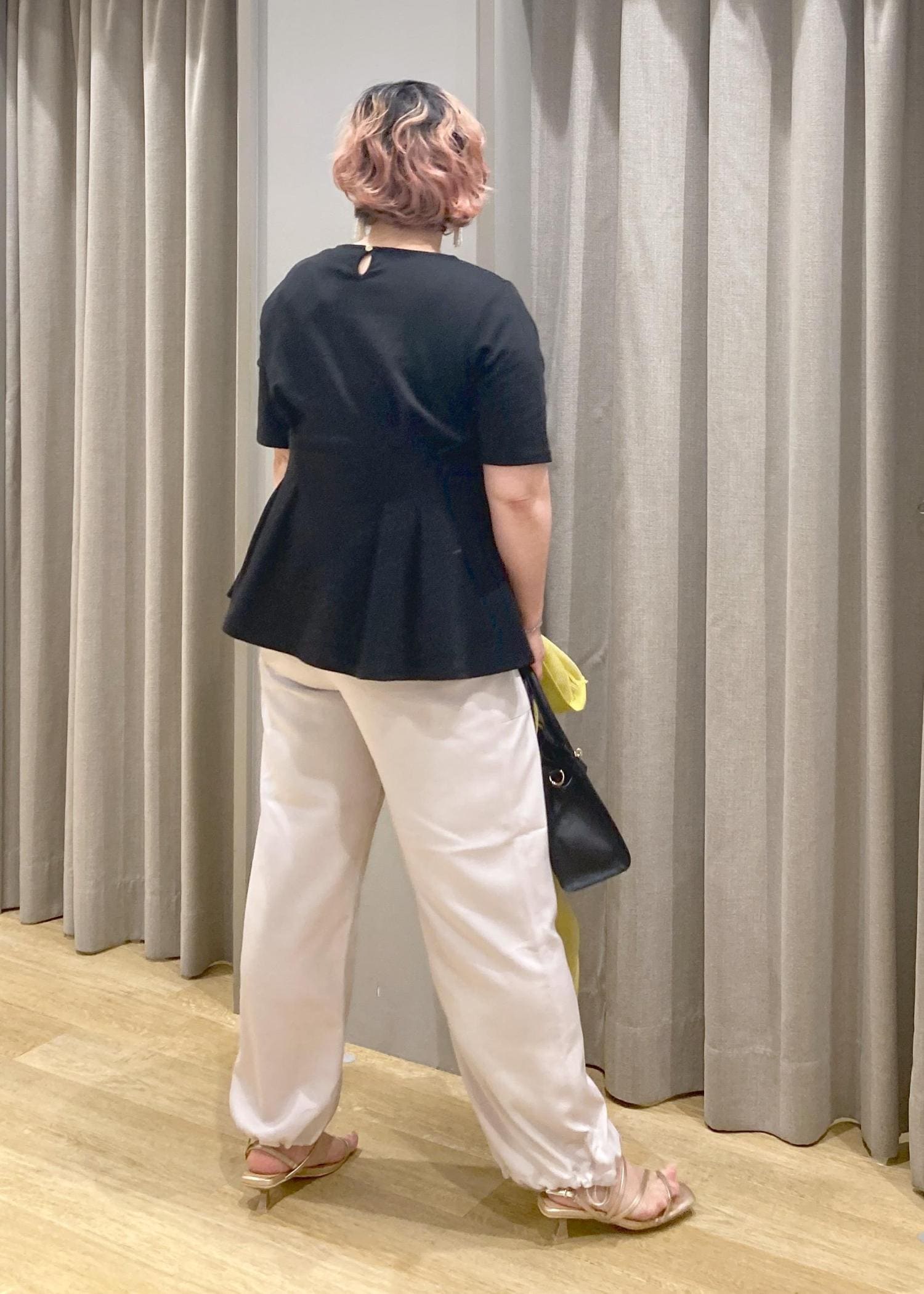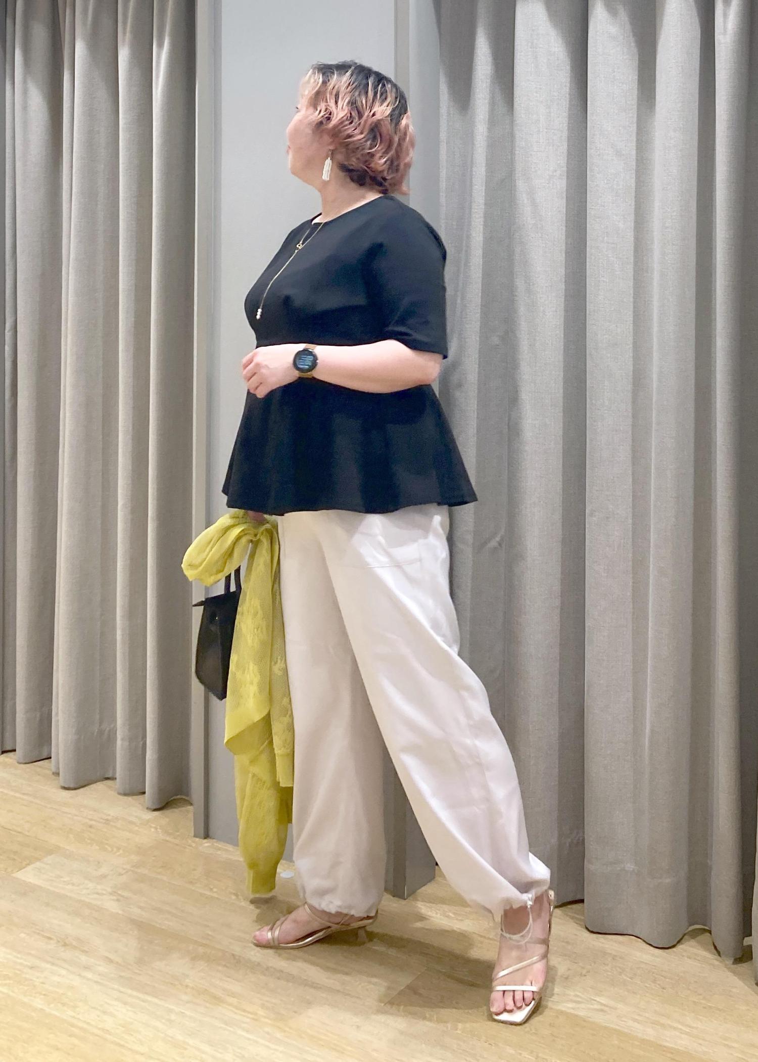 ふんわりしたペプラムのシルエットが、お腹まわりをカバーしてくれて、動きやすさも◎