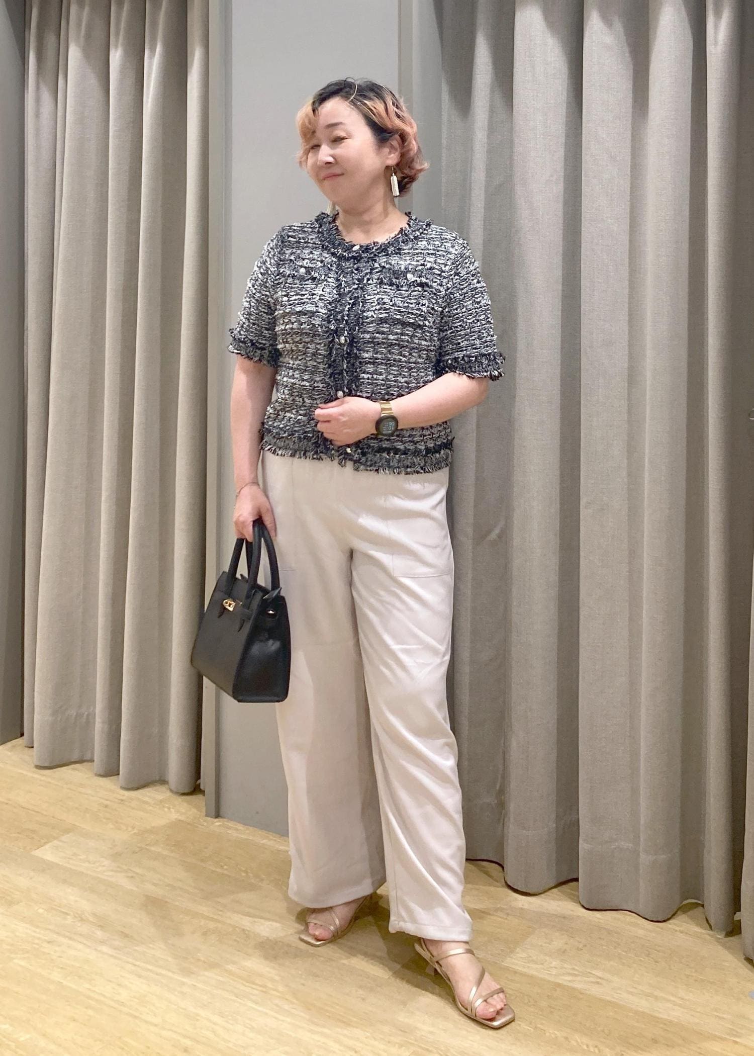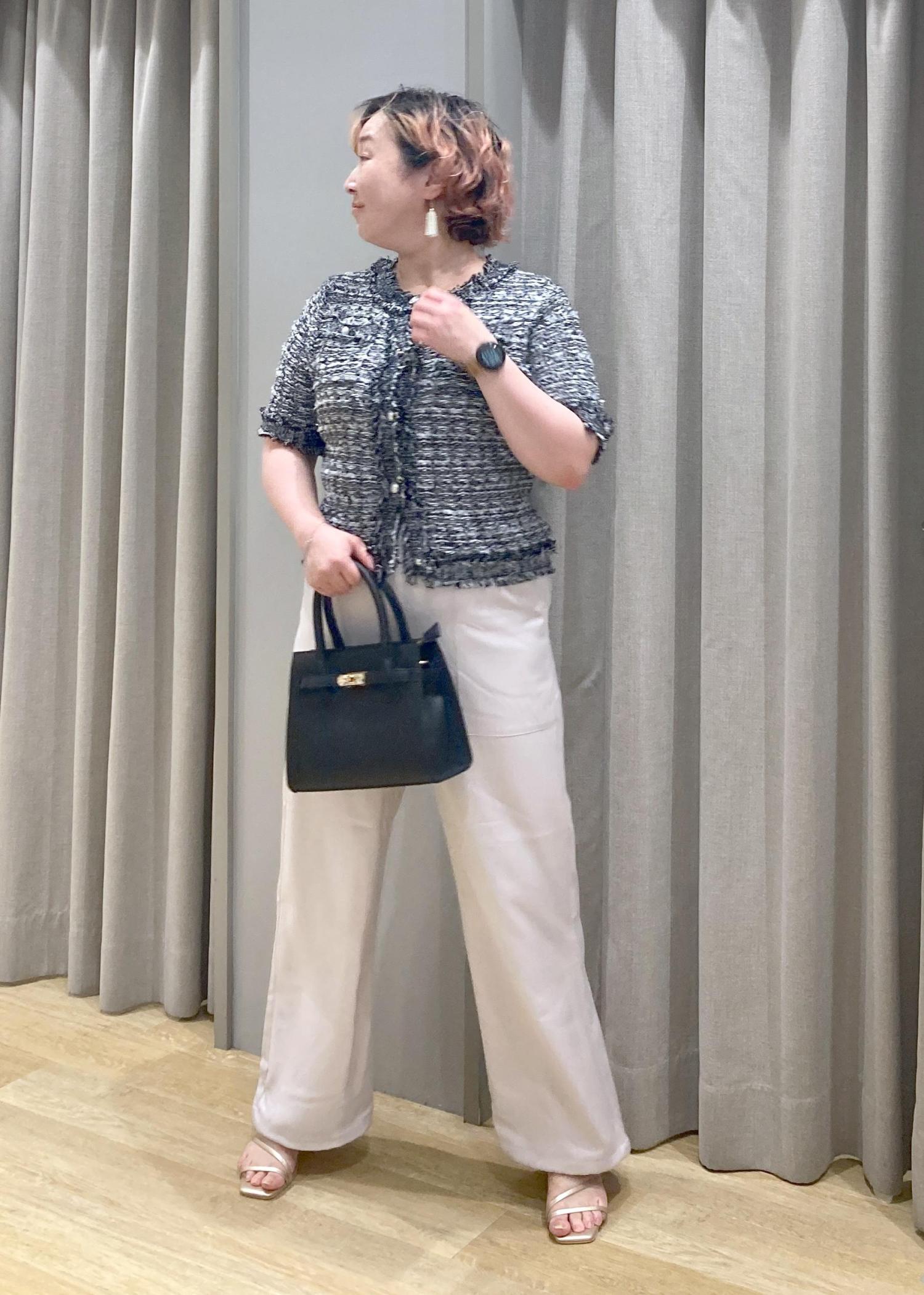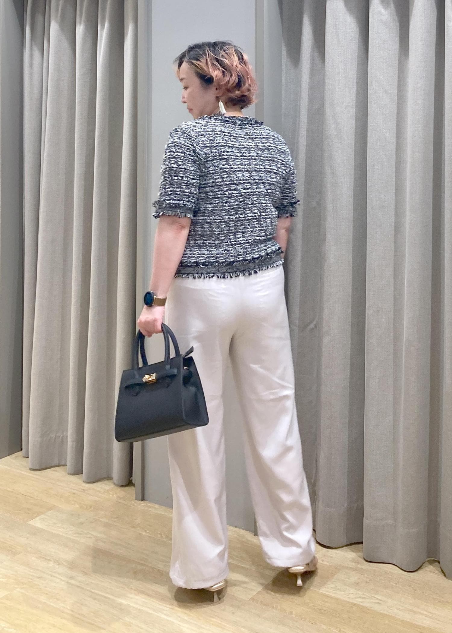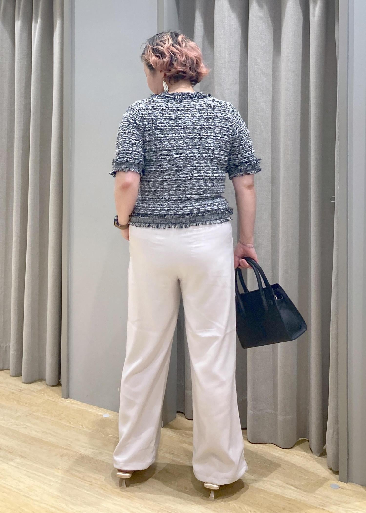 このツイード風トップス、実はめちゃくちゃ軽くて薄手ニットで着やすいです◎
