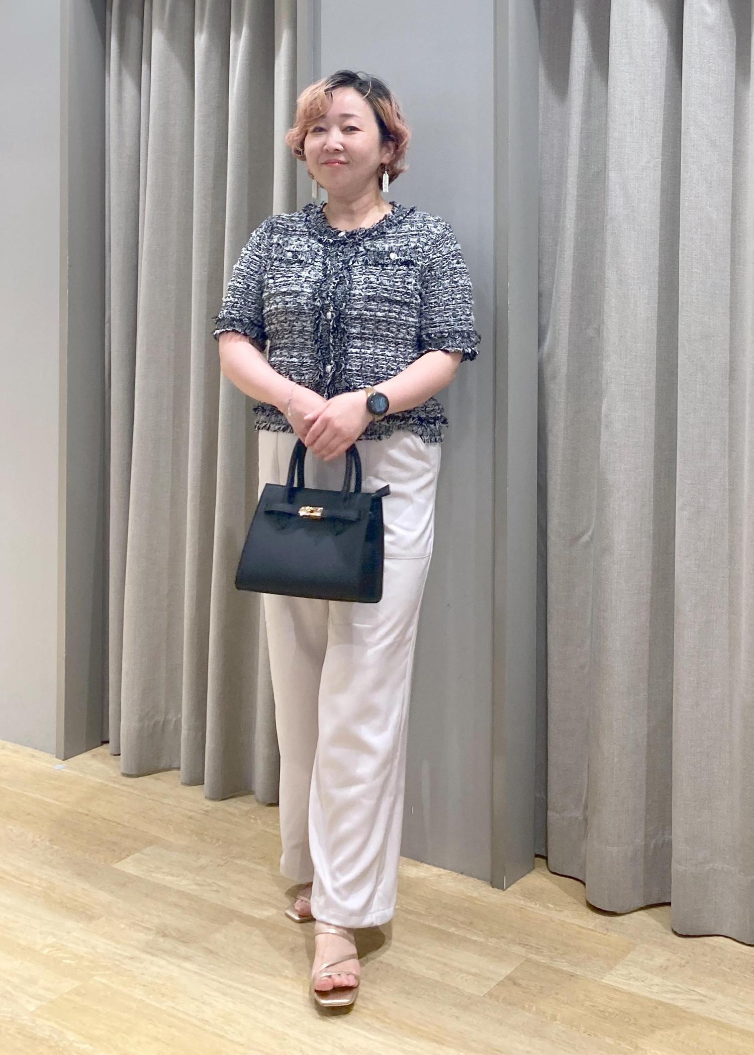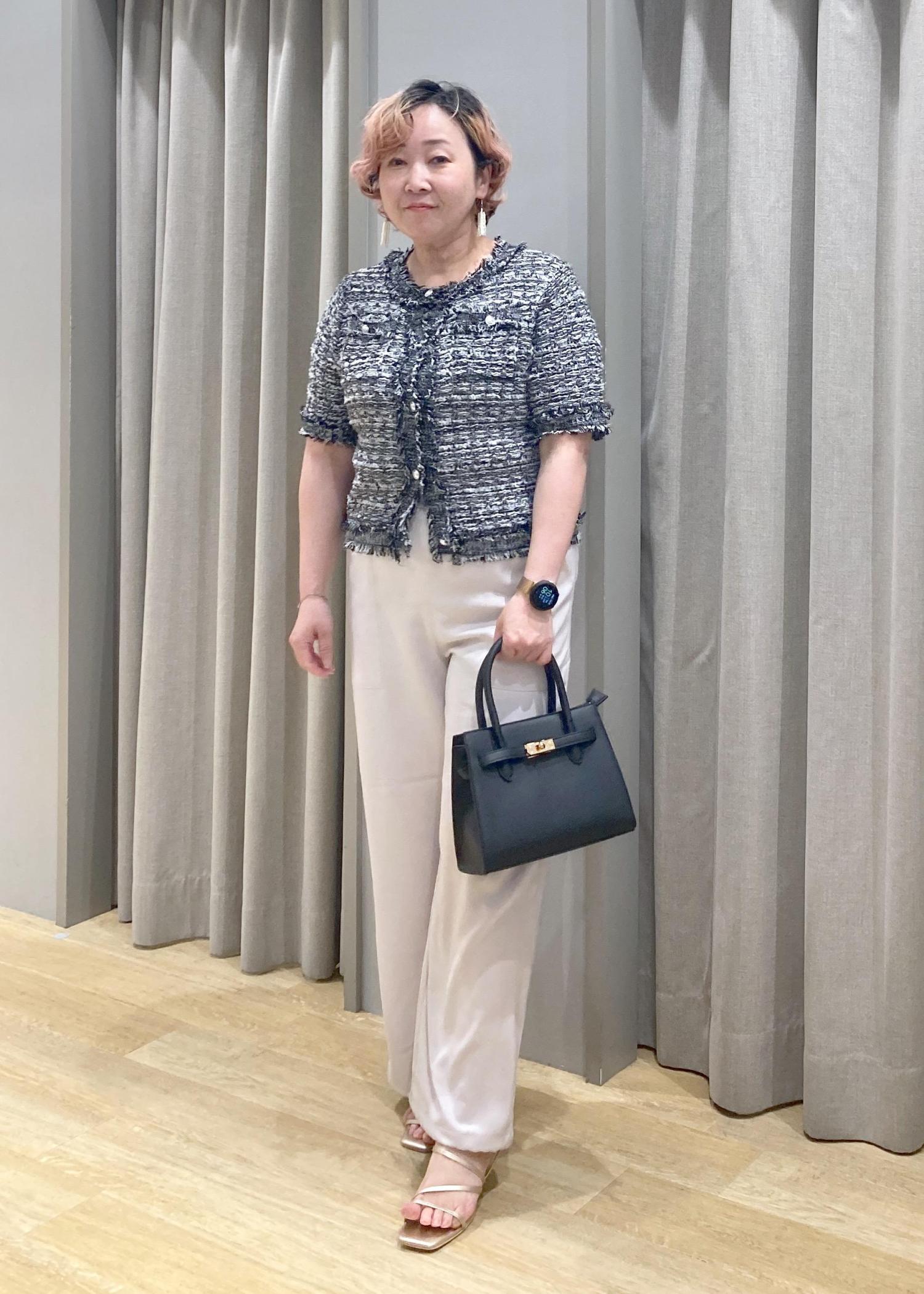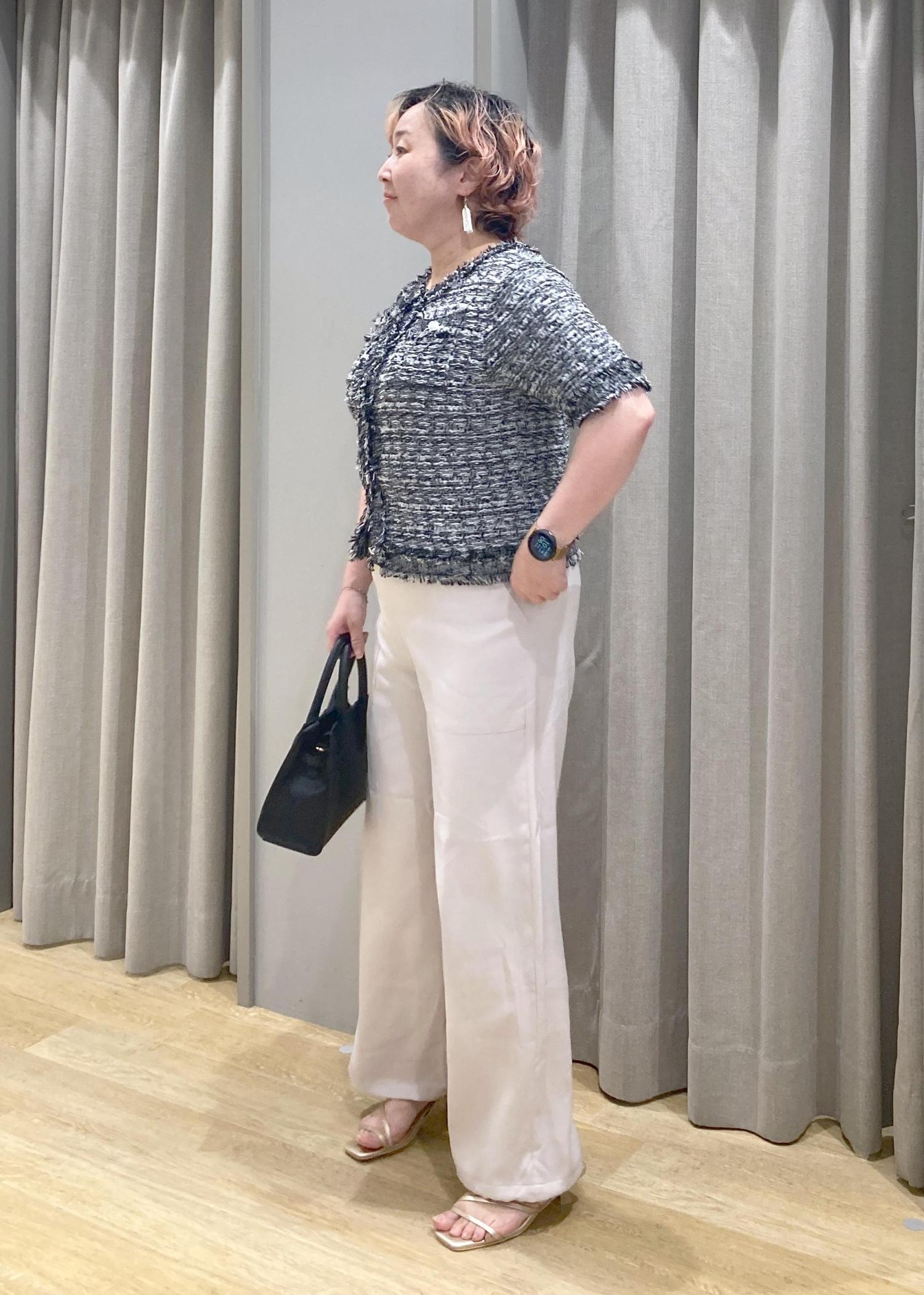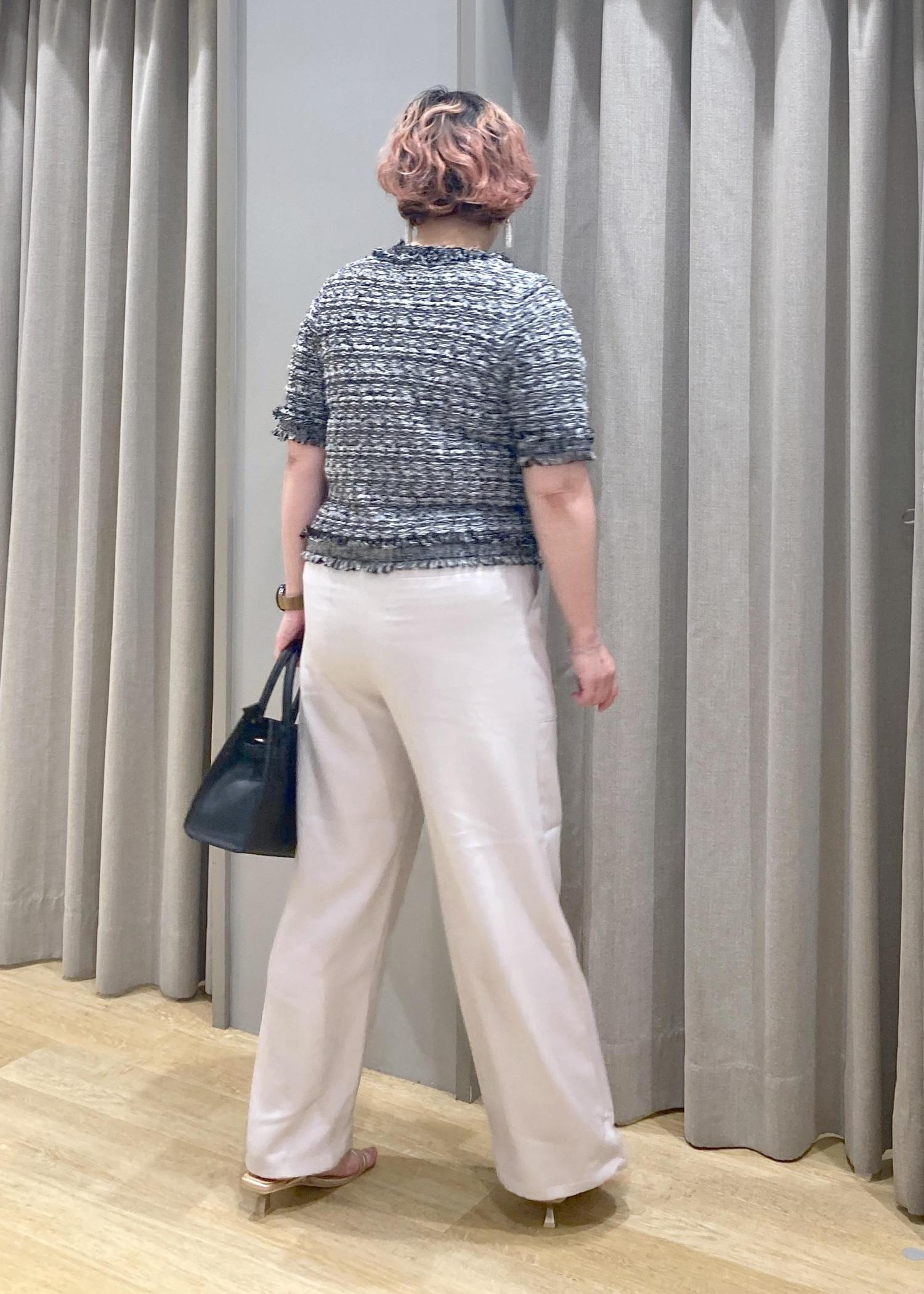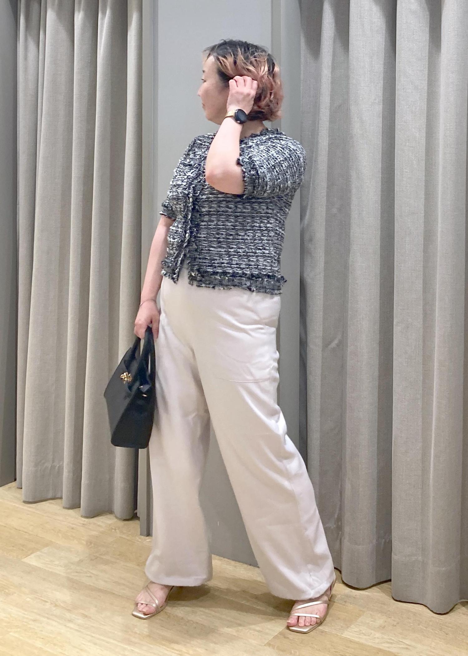 このツイード風トップス、実はめちゃくちゃ軽くて薄手ニットで着やすいです◎