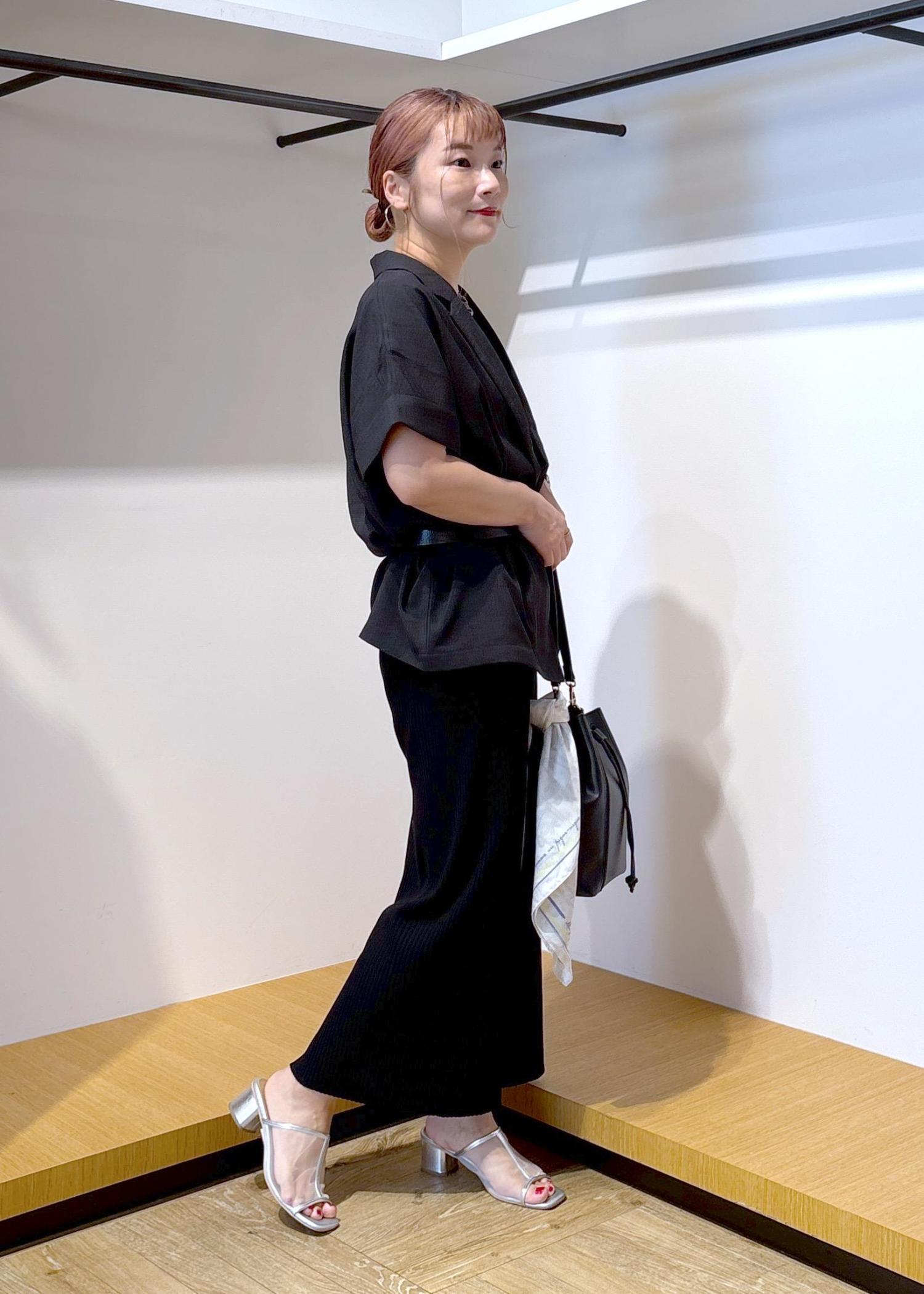 スタイリングを黒っぽくまとめたのでサンダルは抜け感のあるチュール素材のシルバーにして軽さを出しました。