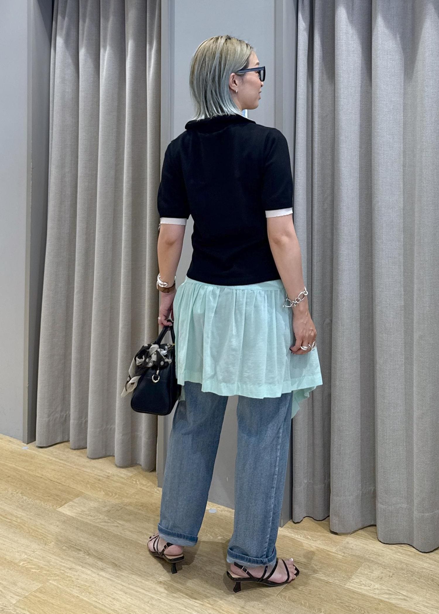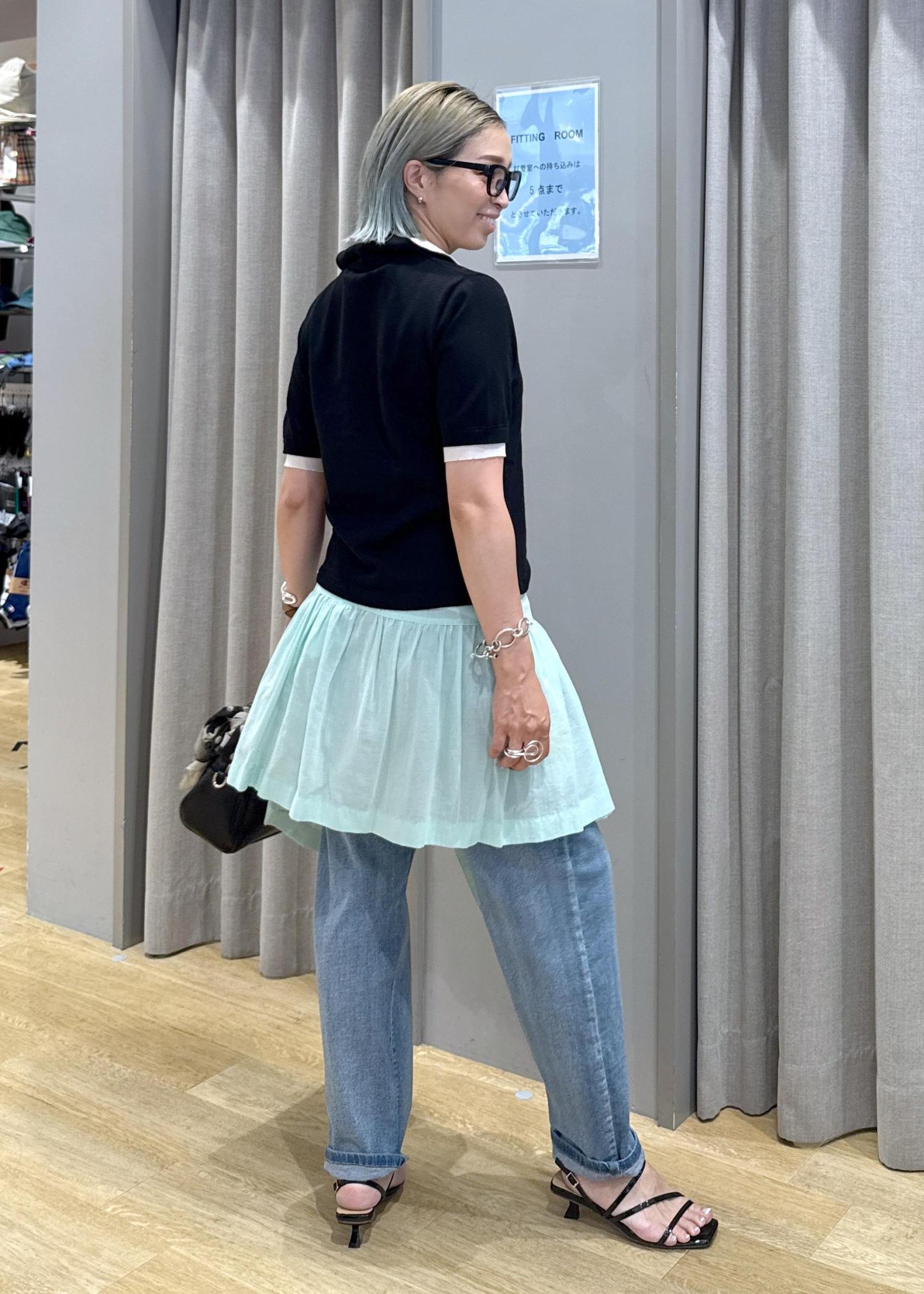 見た目も涼しくしたくて、寒色を差し色に腰巻きしてみました!