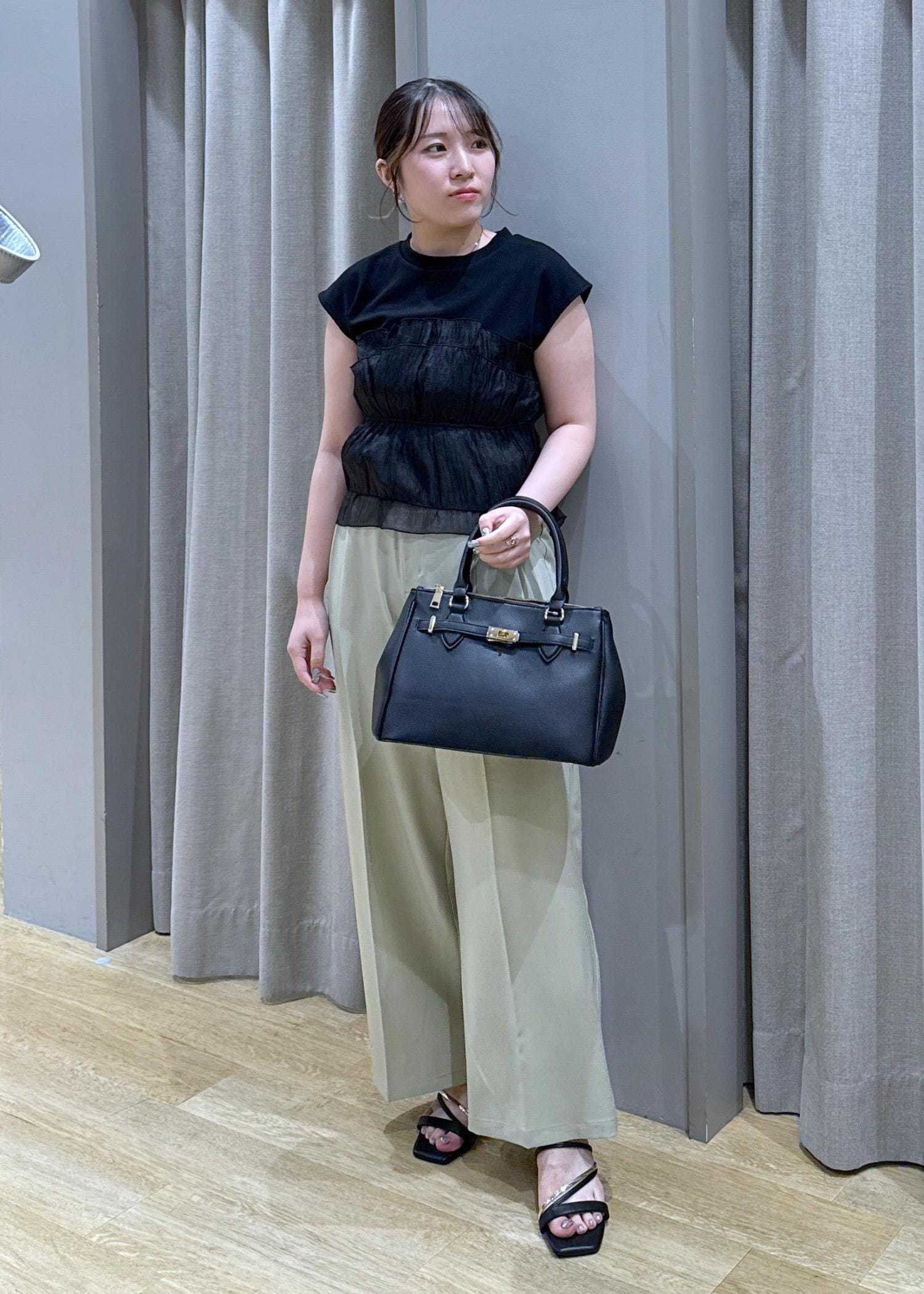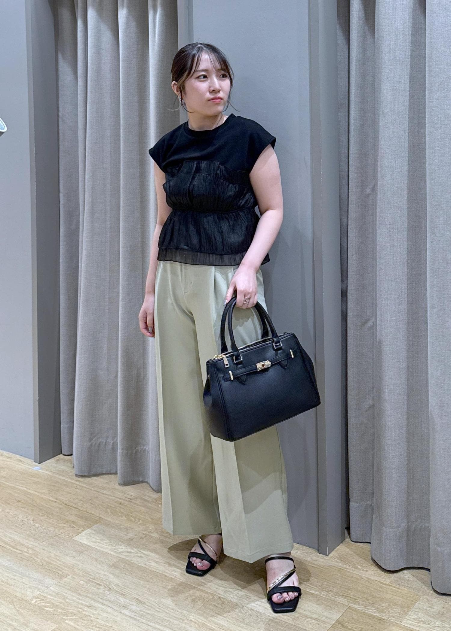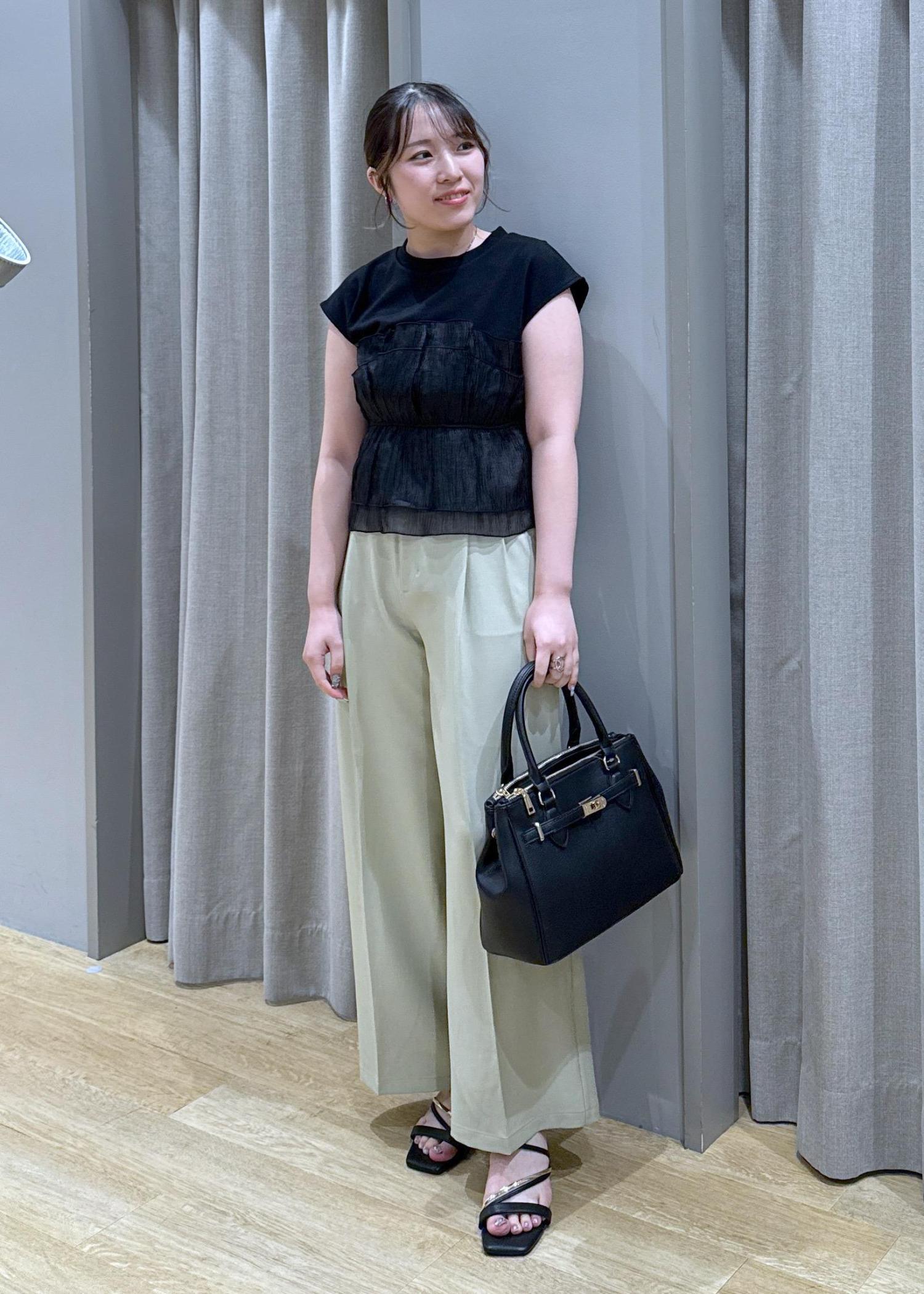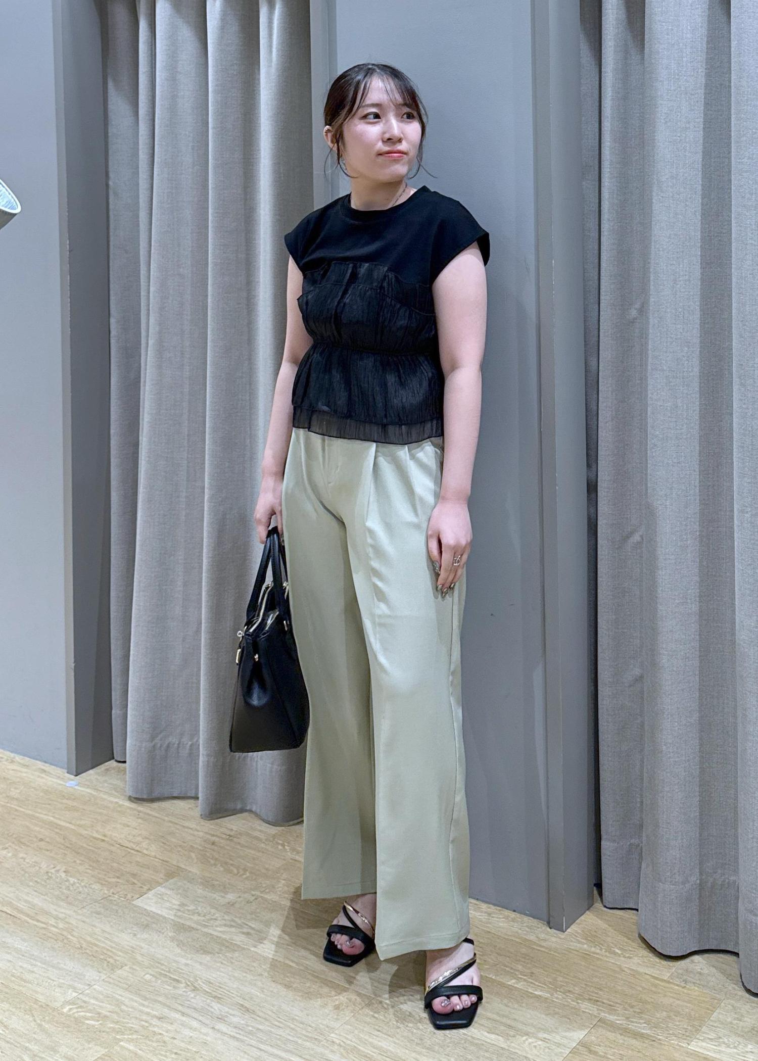 チュールが可愛いトップスにハイウエストのパンツを合わせて