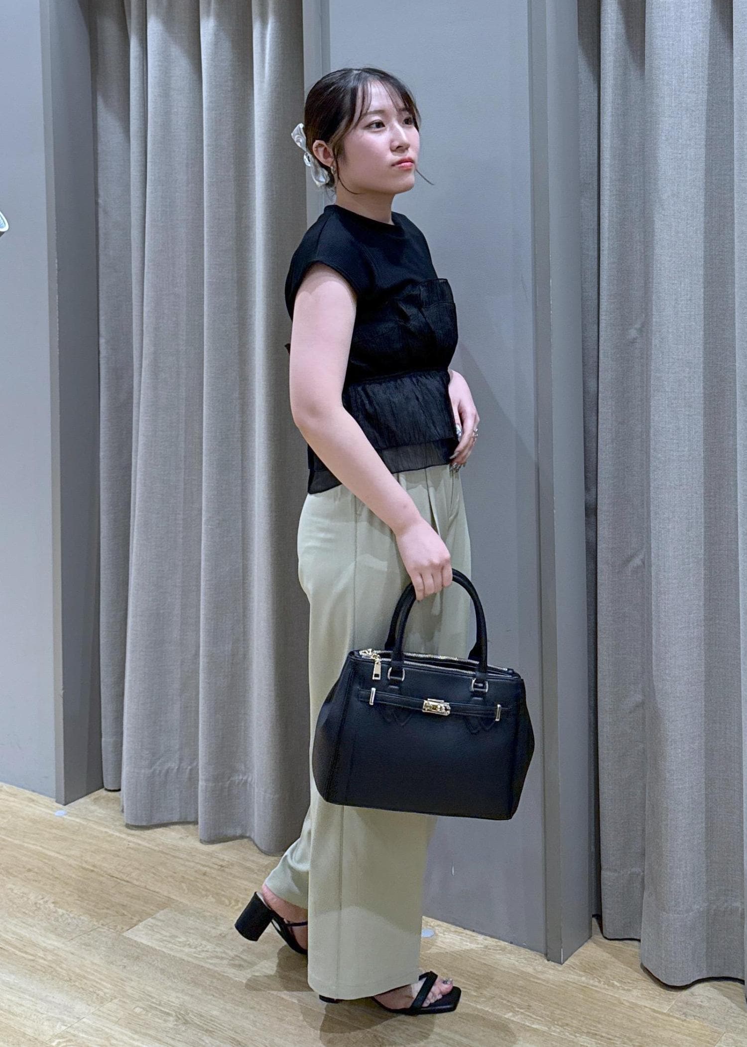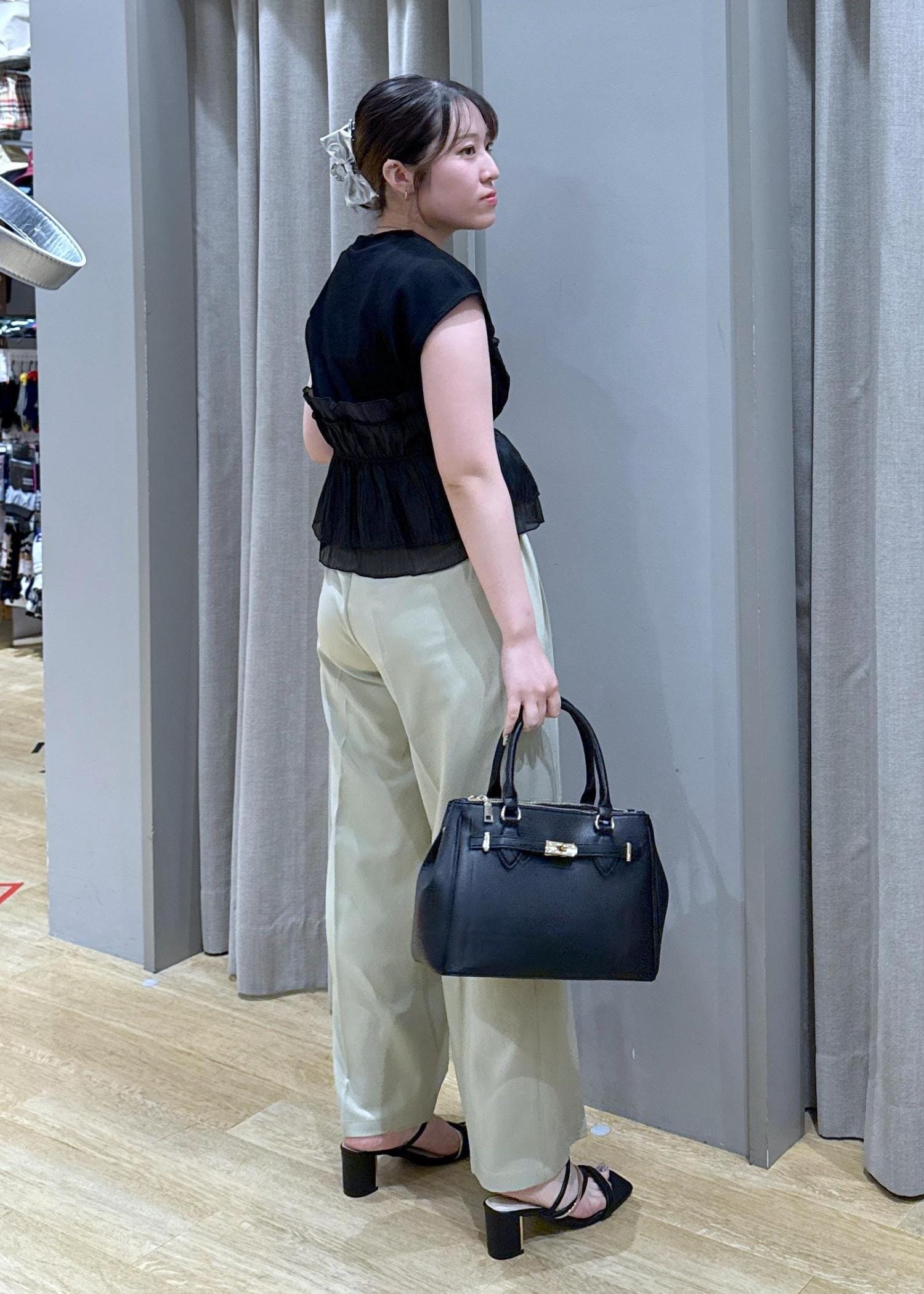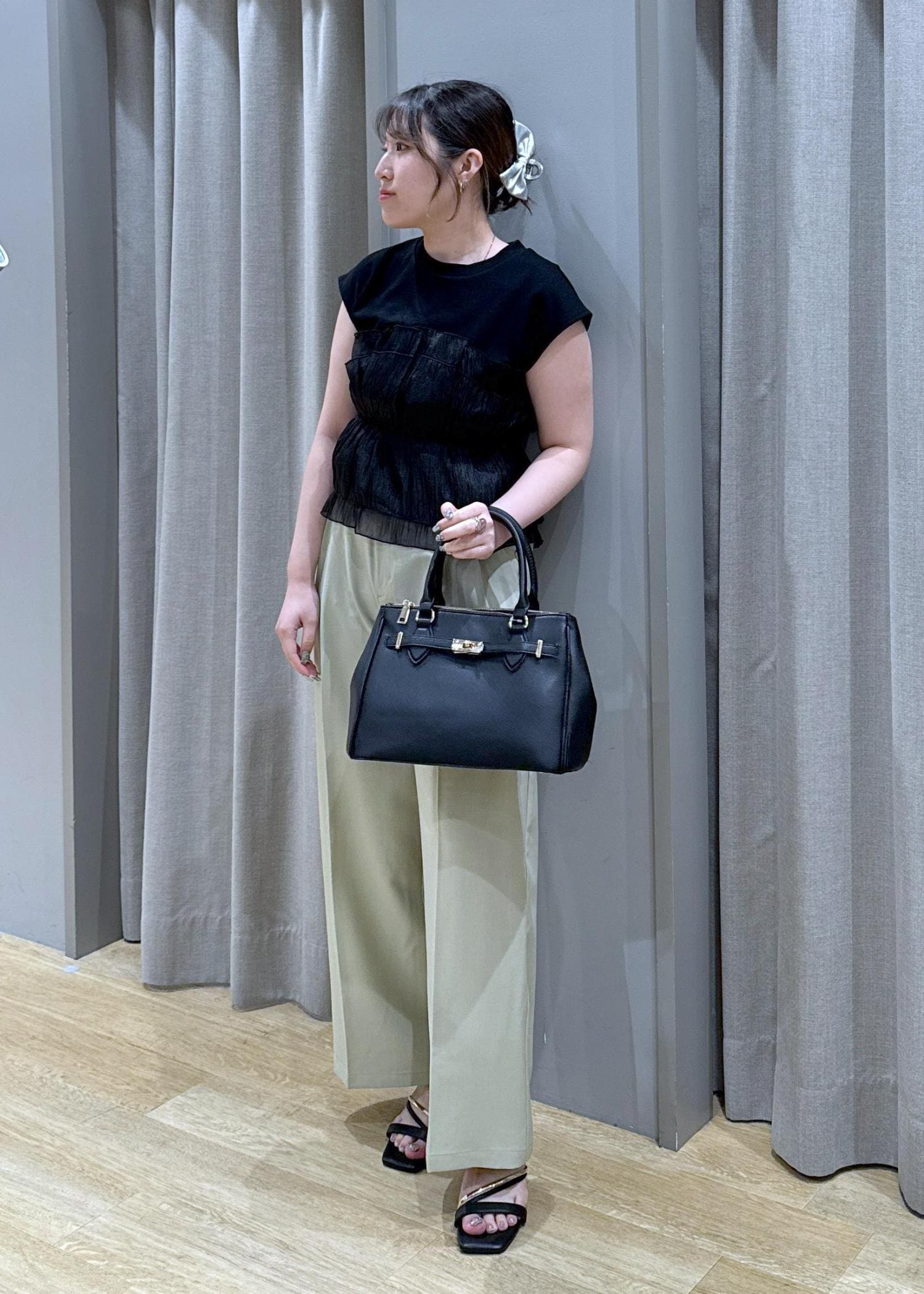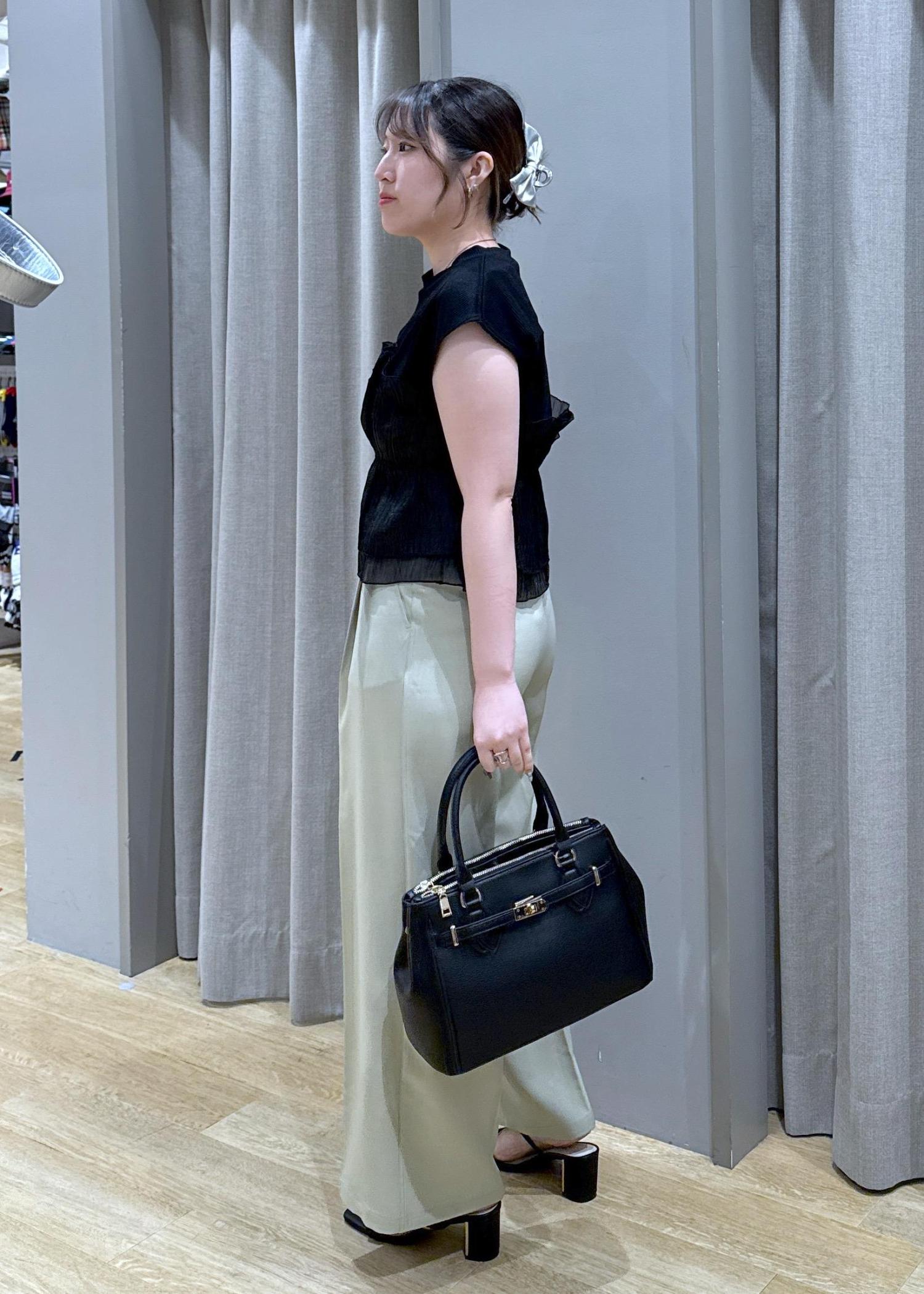 チュールが可愛いトップスにハイウエストのパンツを合わせて