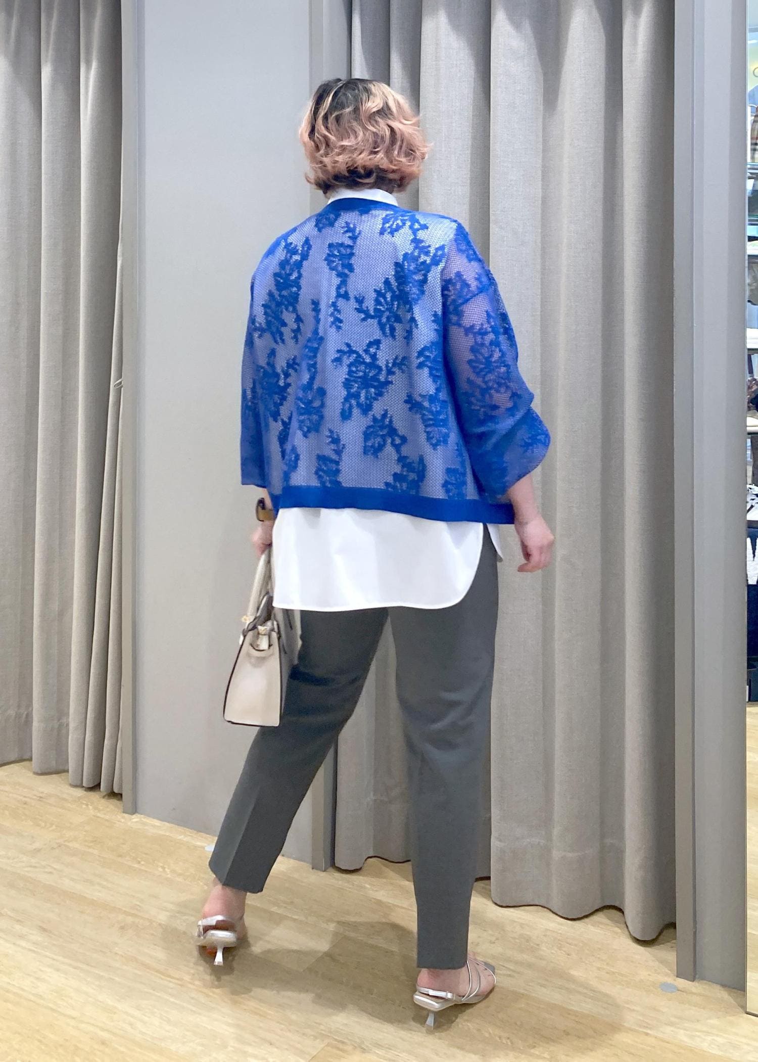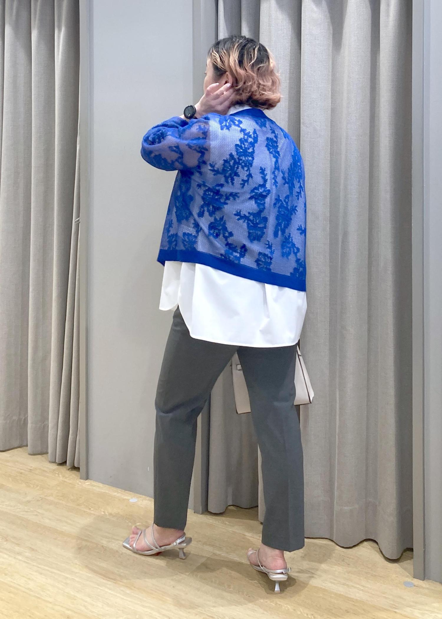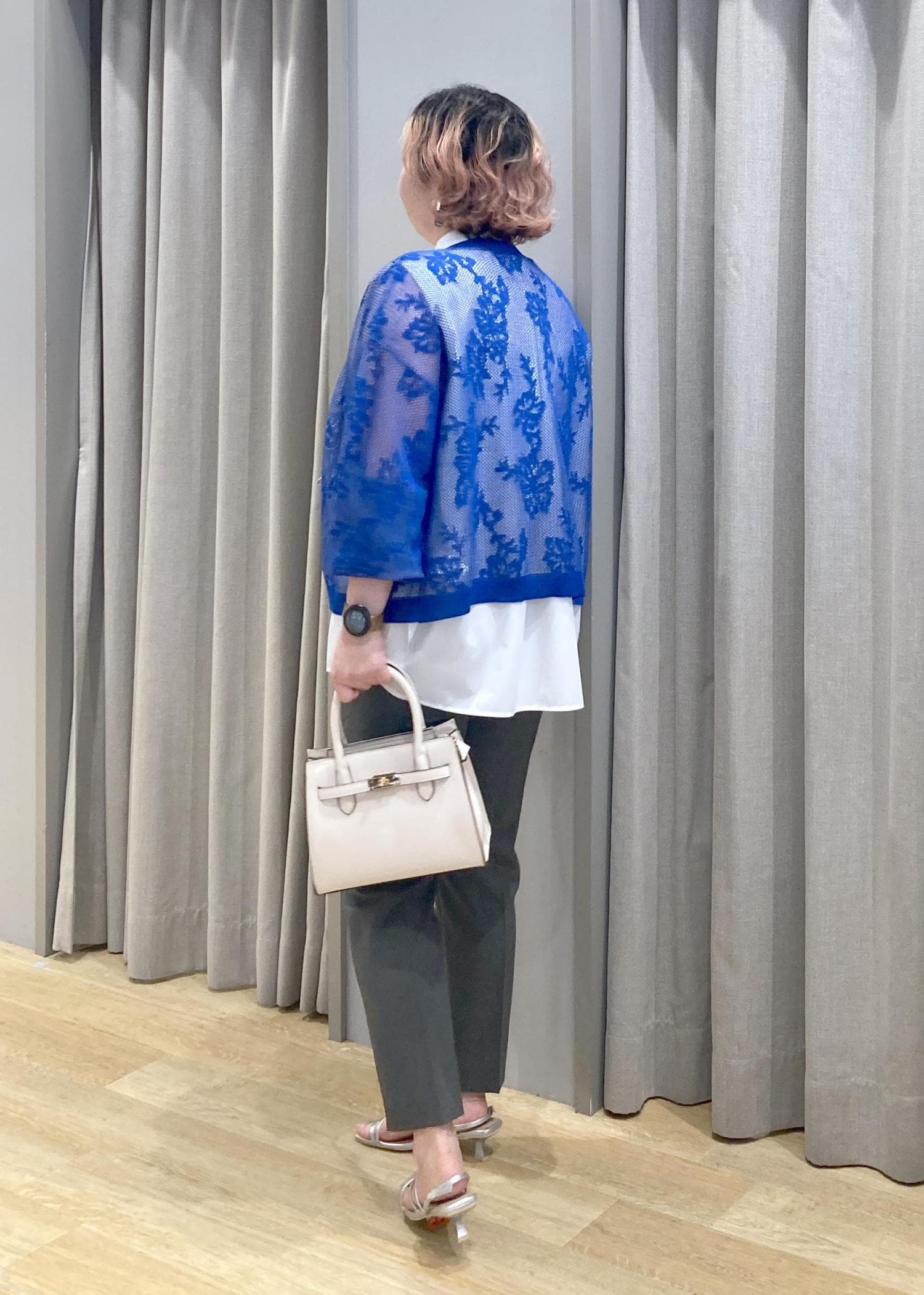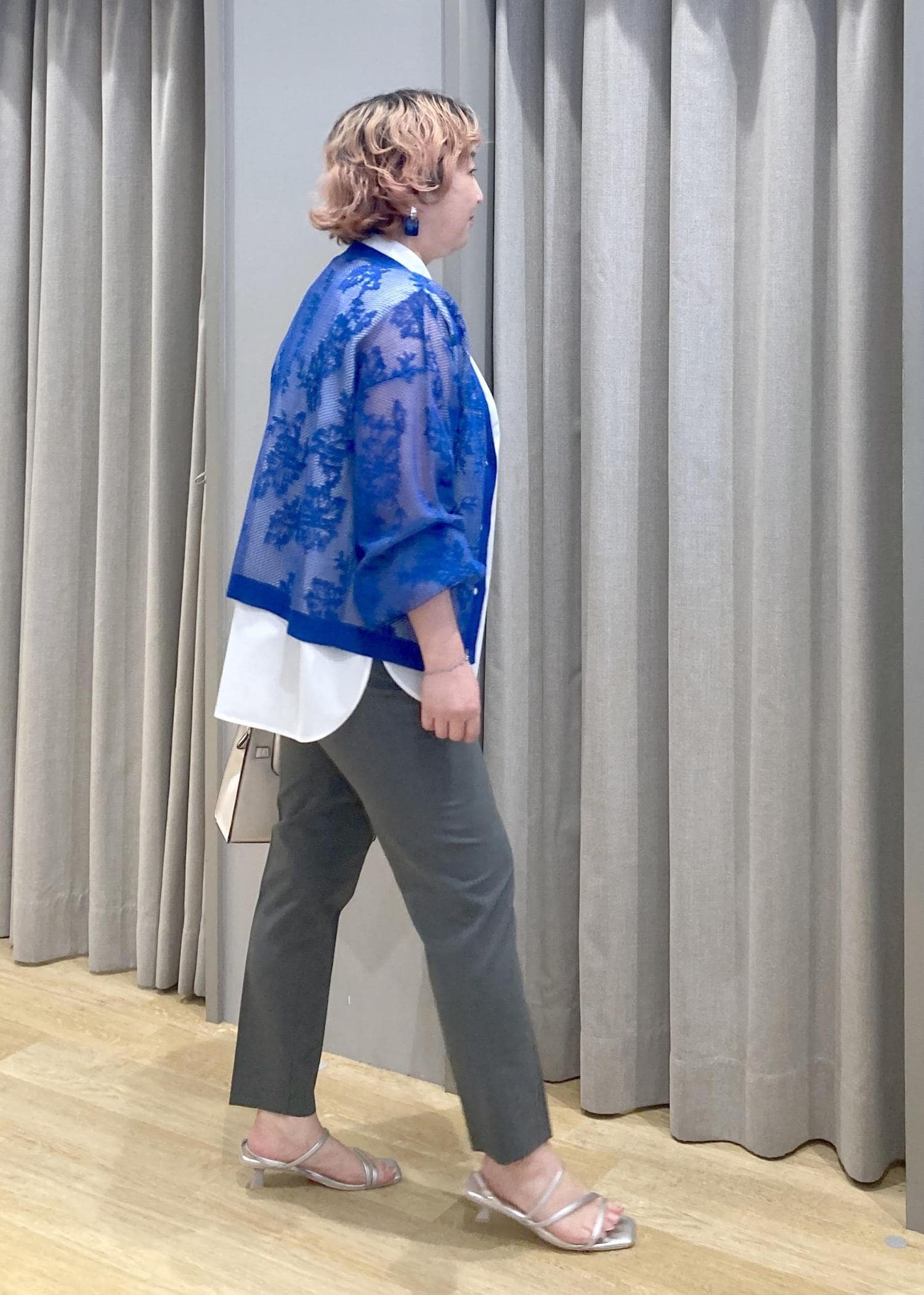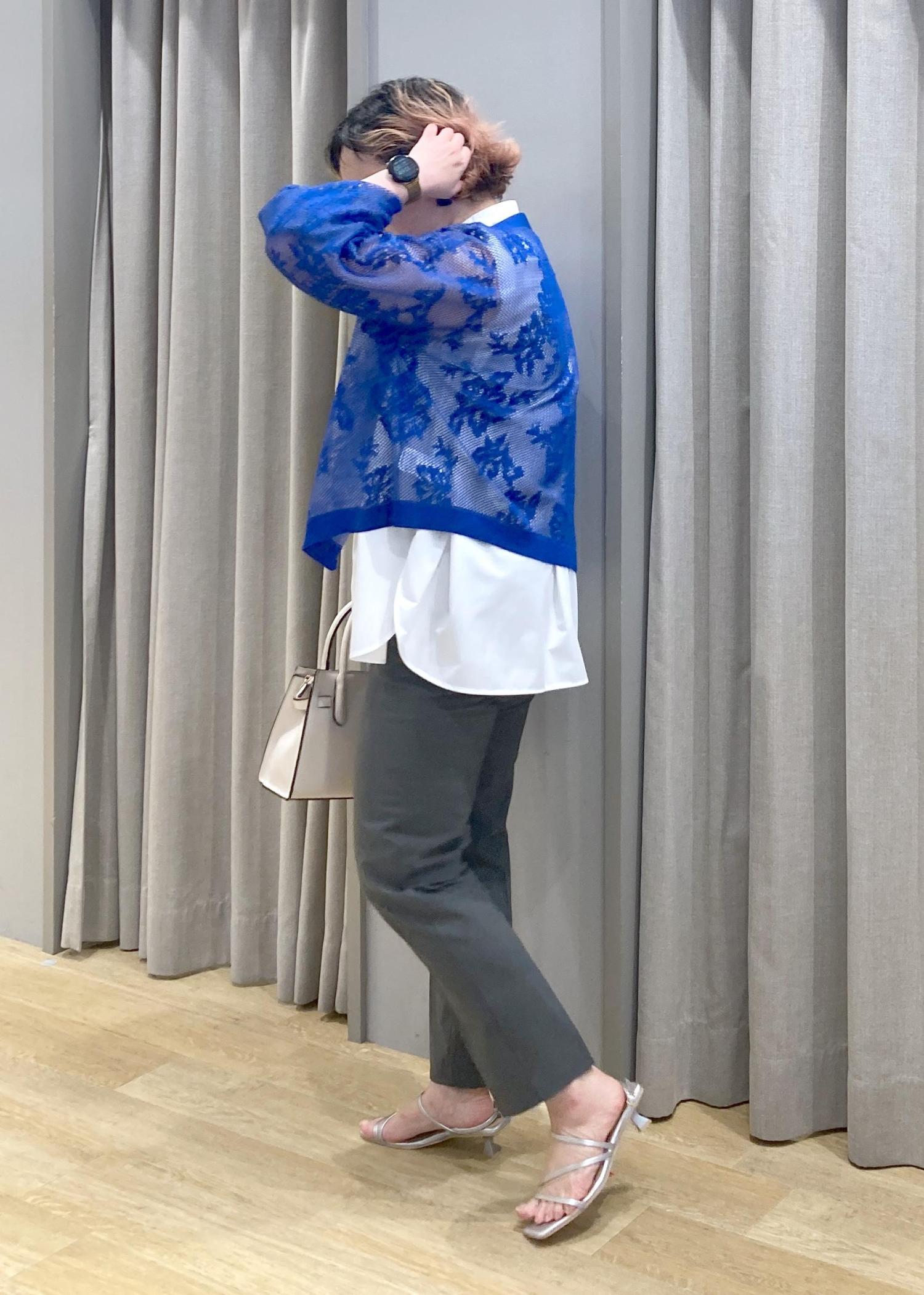 透け感のあるブルーのカーデ、羽織るだけで一気に華やかさがプラス!