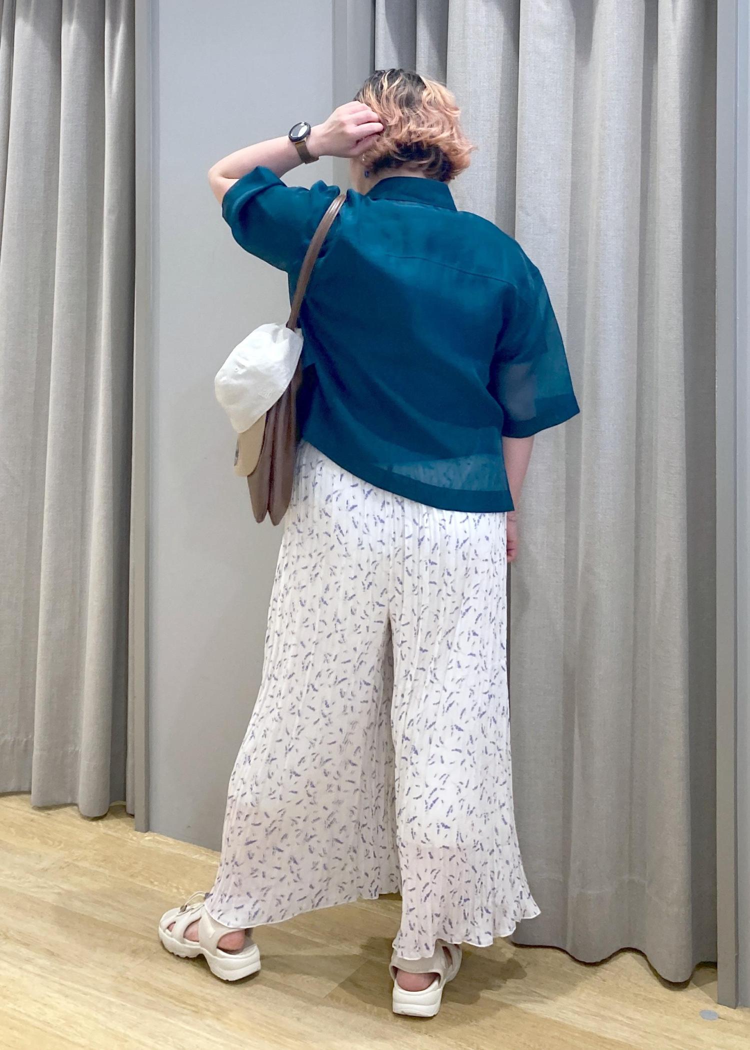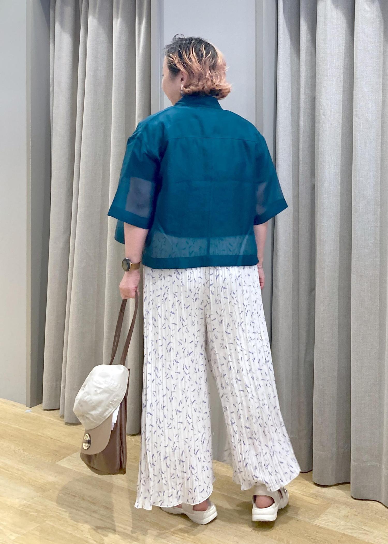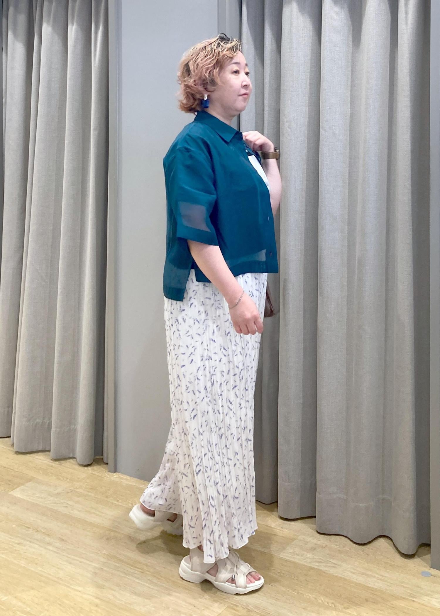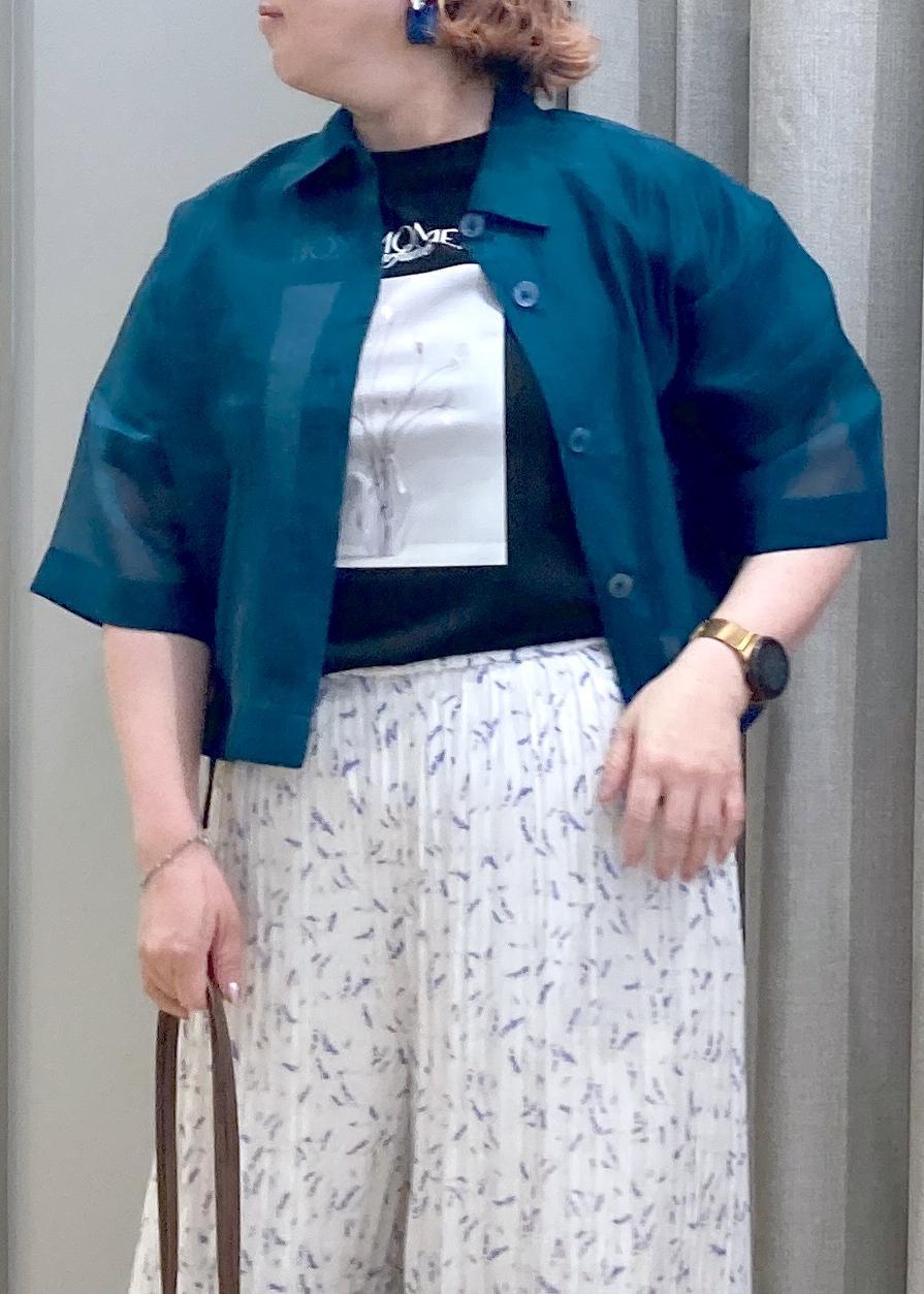 ゆったり羽織れるシアーシャツは、体型をさりげなくカバーしつつ涼しげな印象に♪