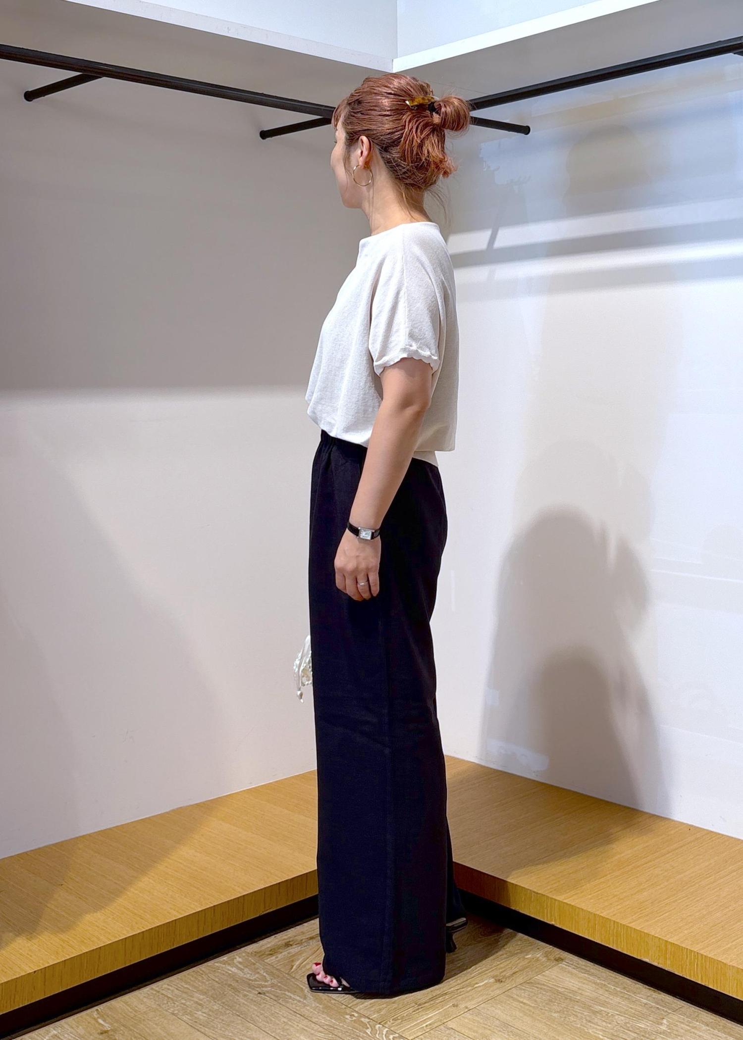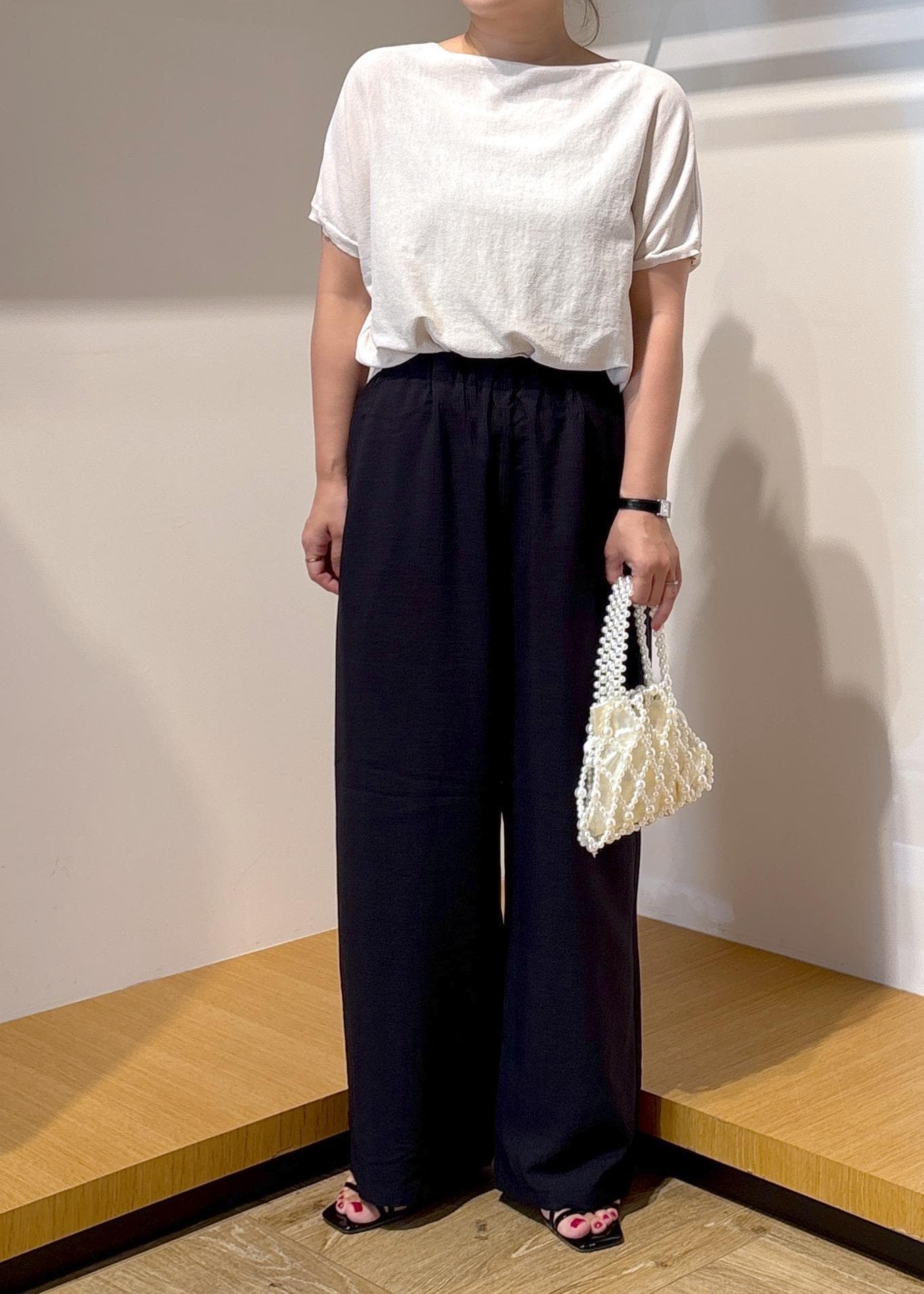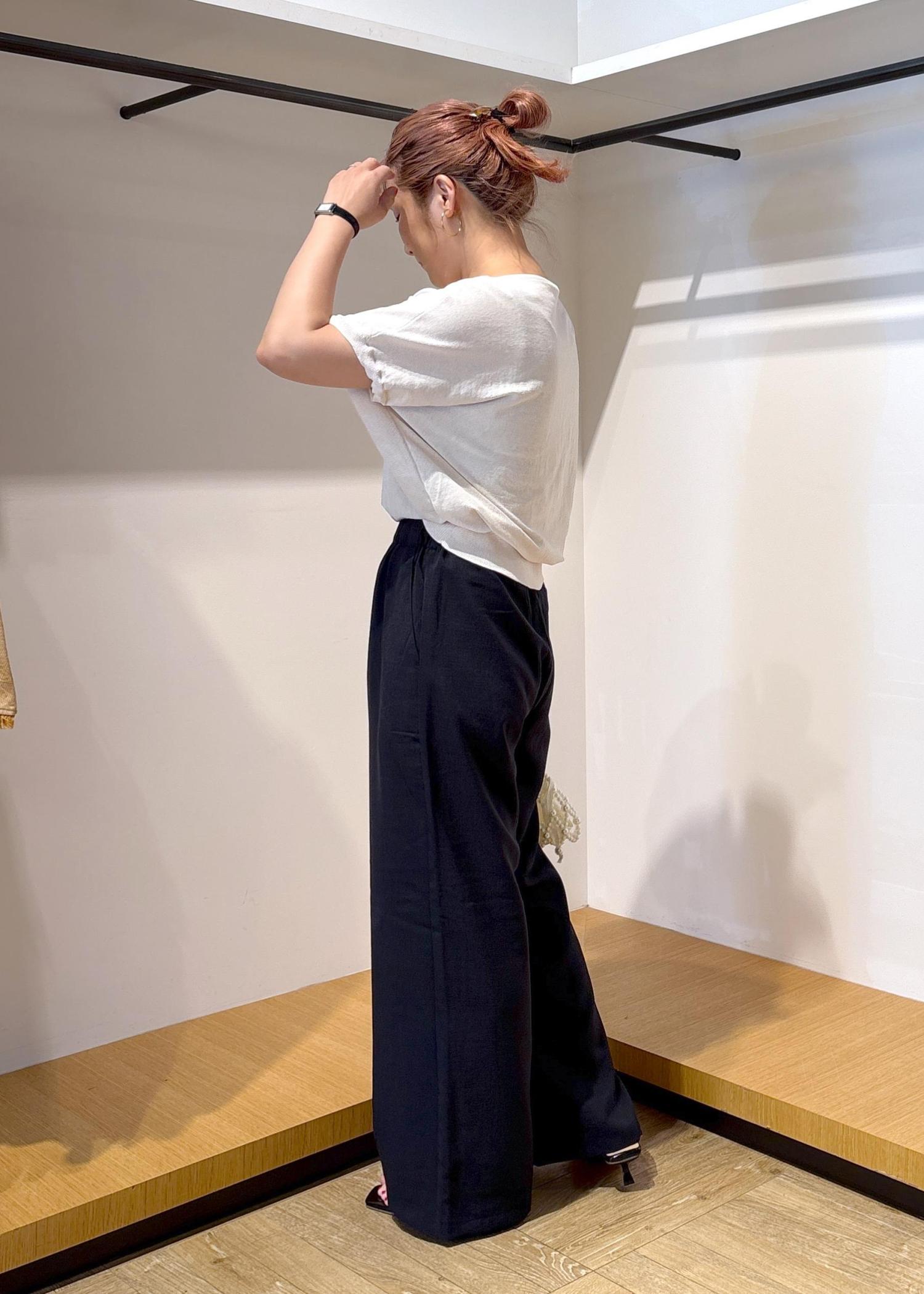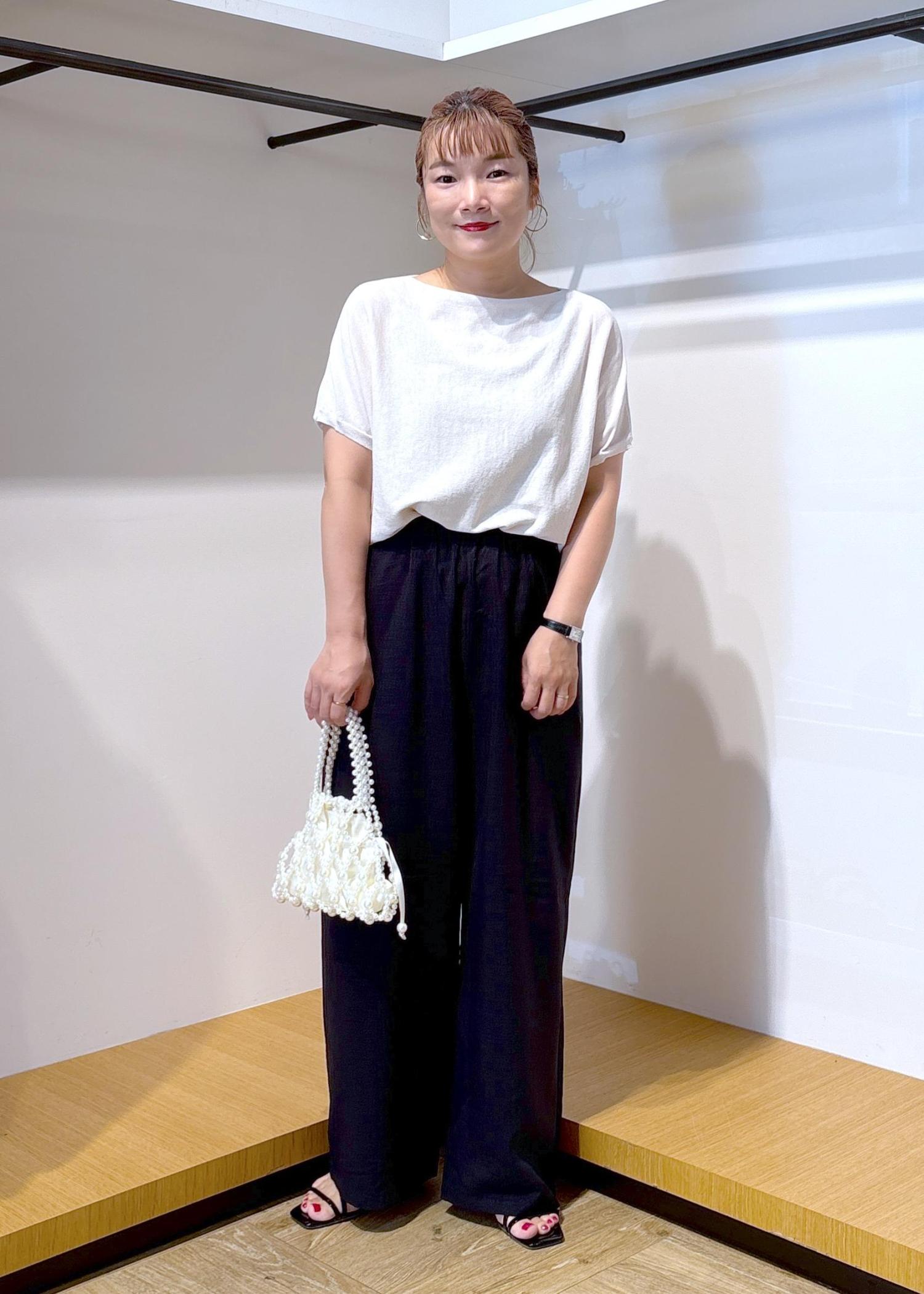 汗をかいても体にピタピタ張り付かないゆるっとしたトップスに、風通しの良いさらさらなワイドパンツを合わせてストレスフリーです!