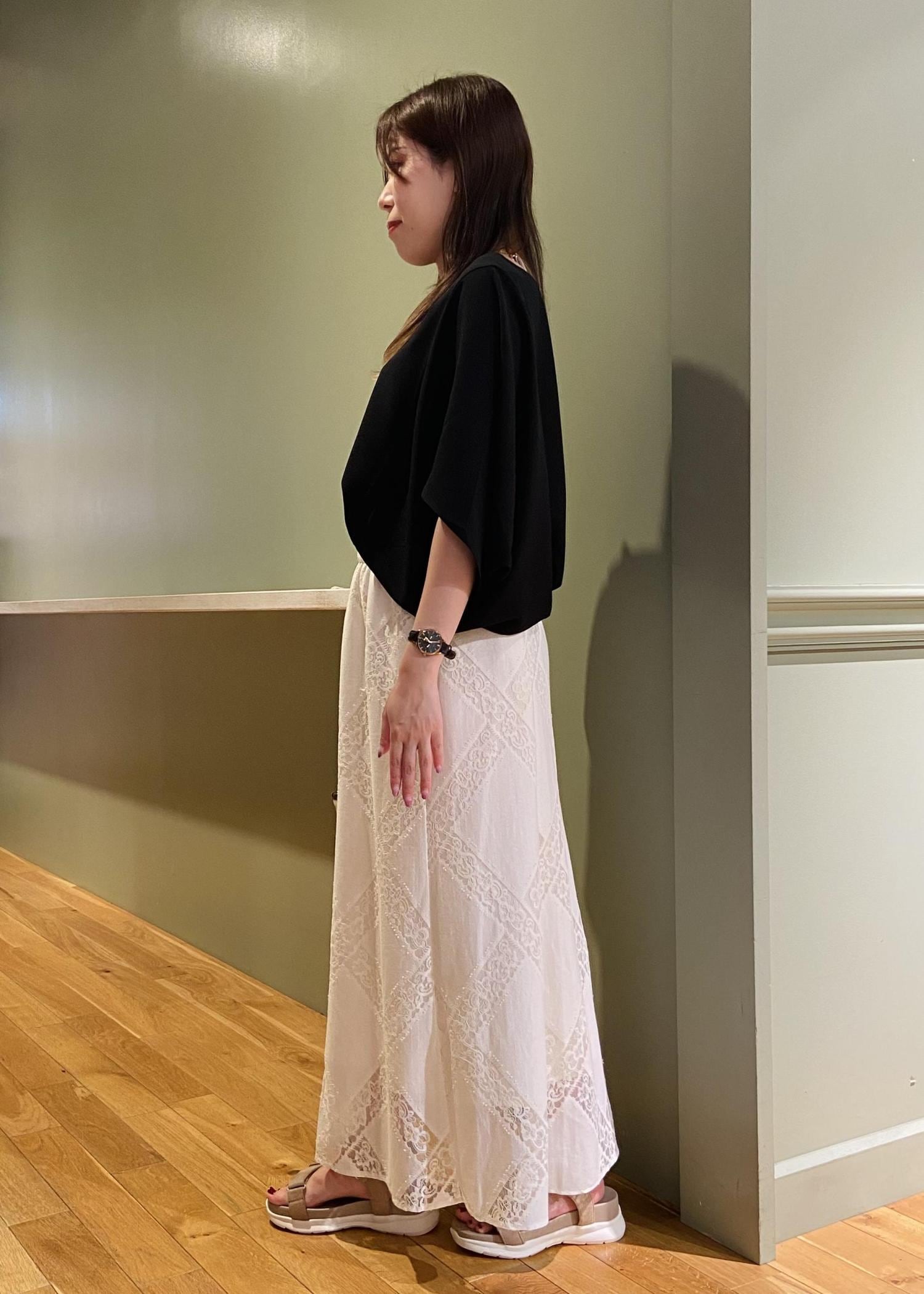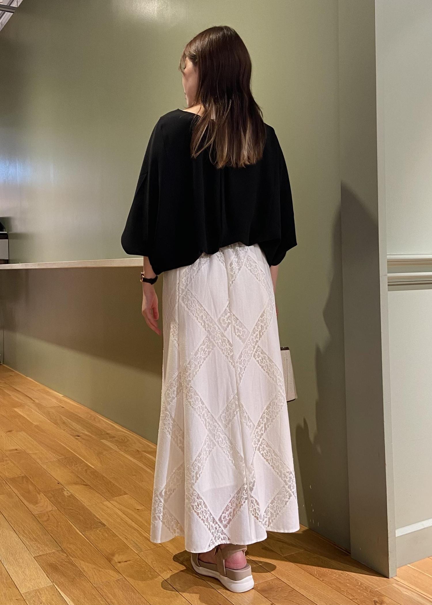 ブラックの7分丈袖のブラウスにホワイトのスカートを合わせて、初秋を思わせるようなカラーにしました。