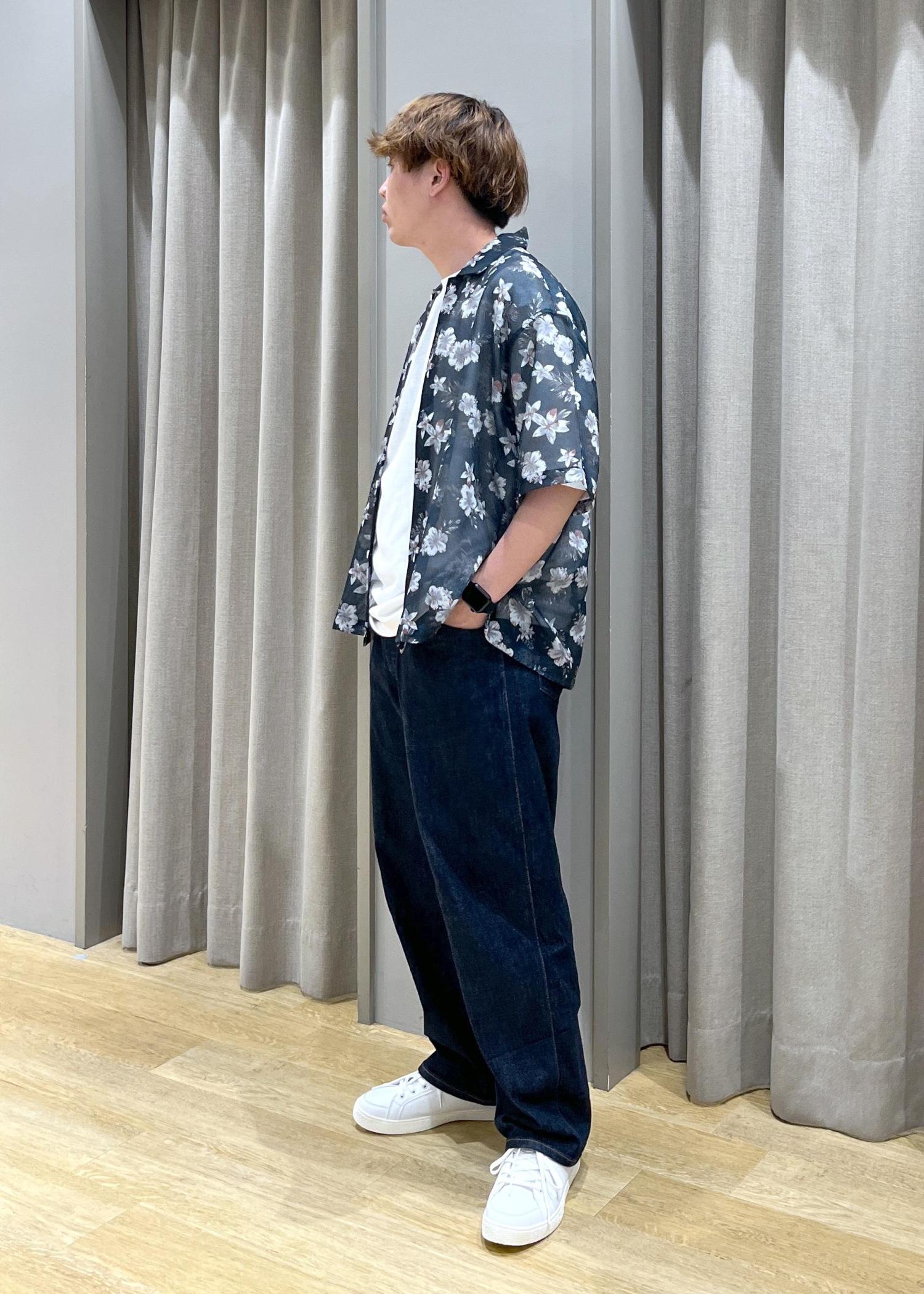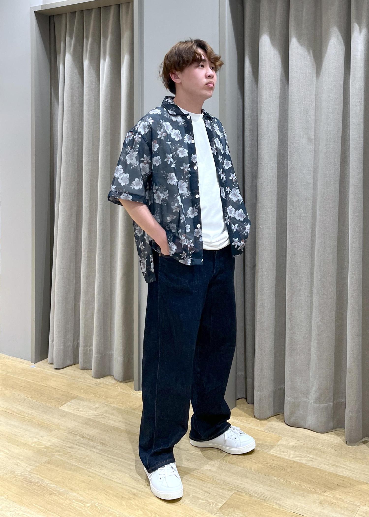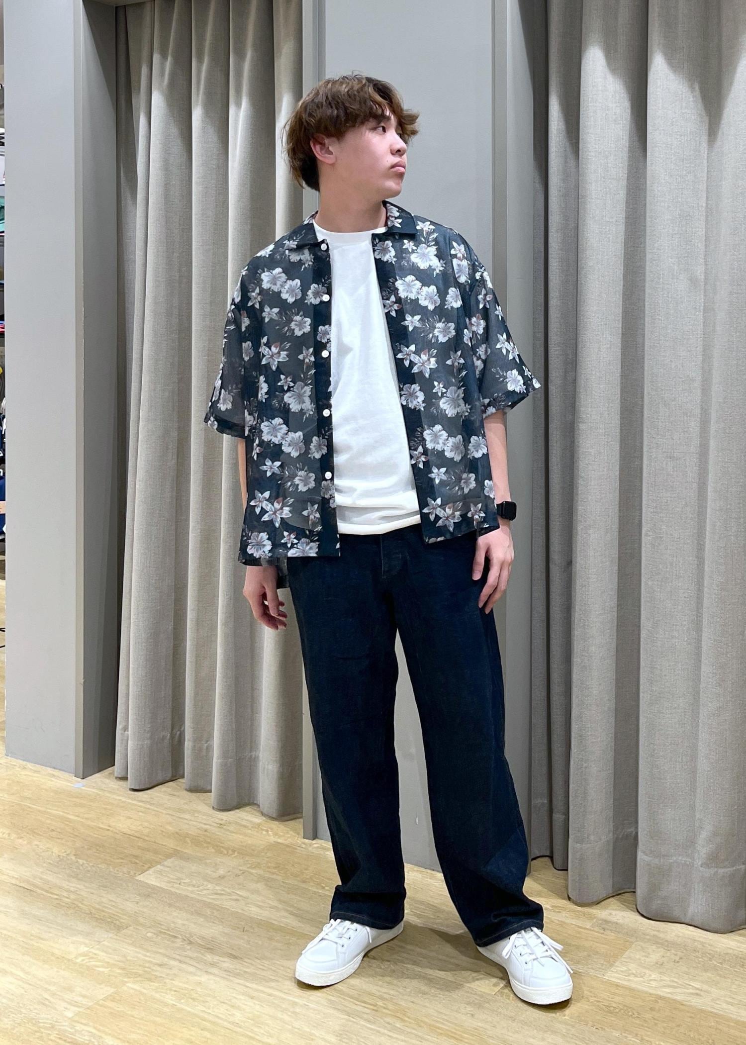 ネイビーのメッシュ素材のシャツに、Wranglerのネイビーのデニムを合わせて、明るさを出すために白のインナーとスニーカーを合わせてみました。