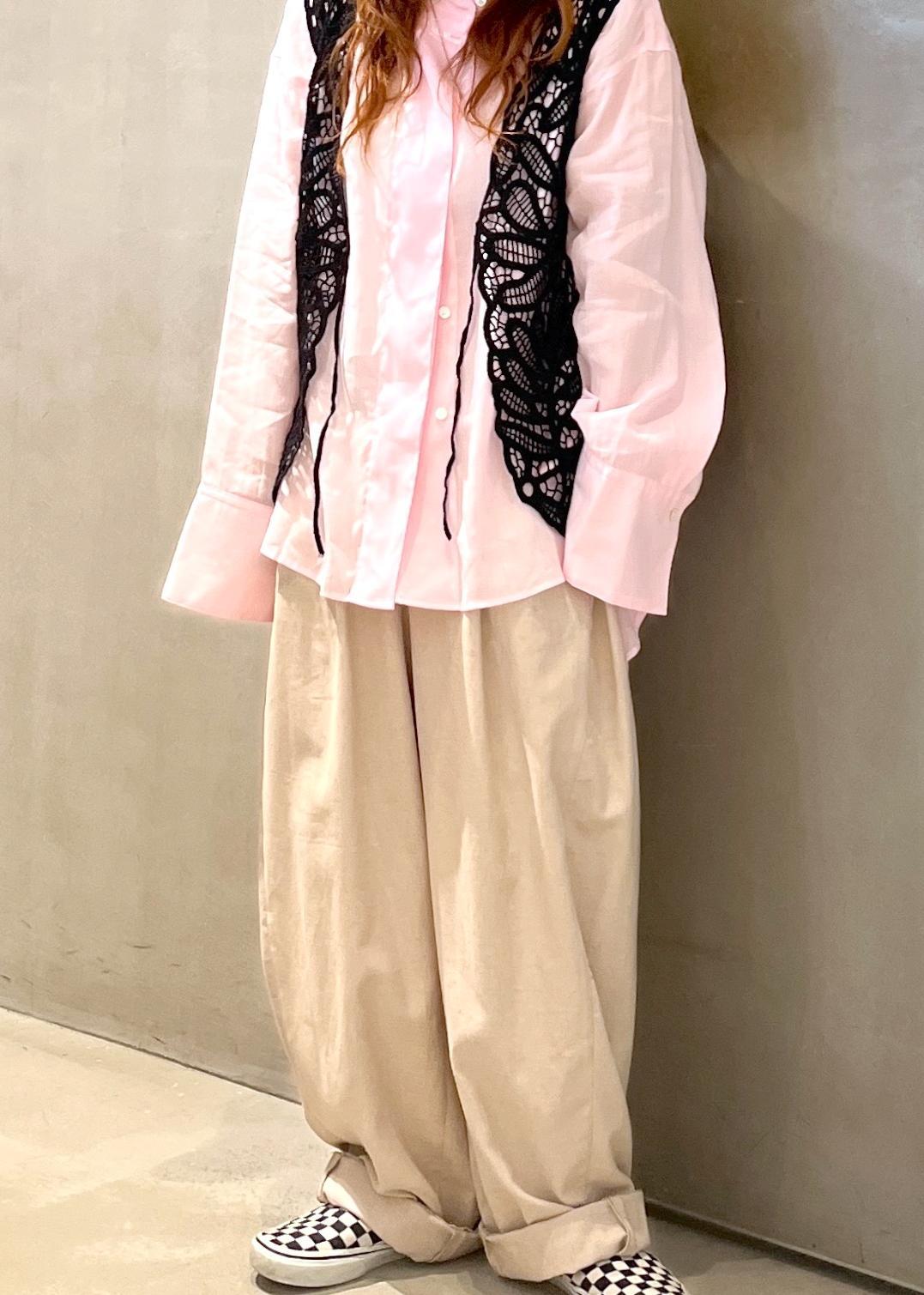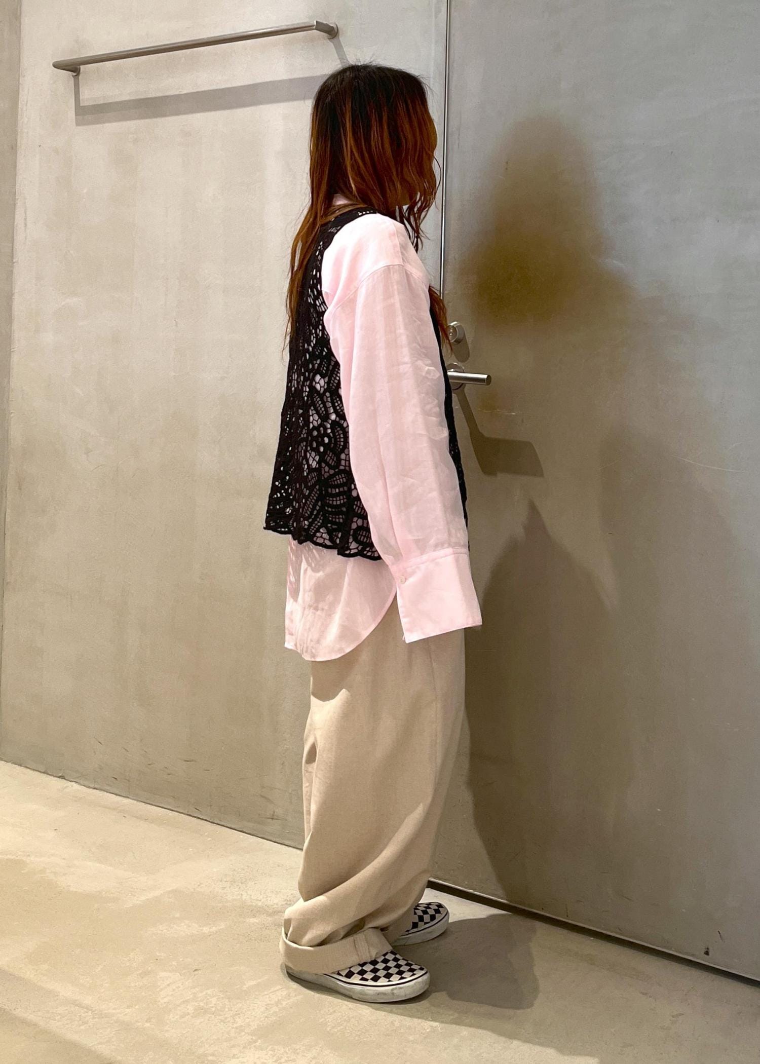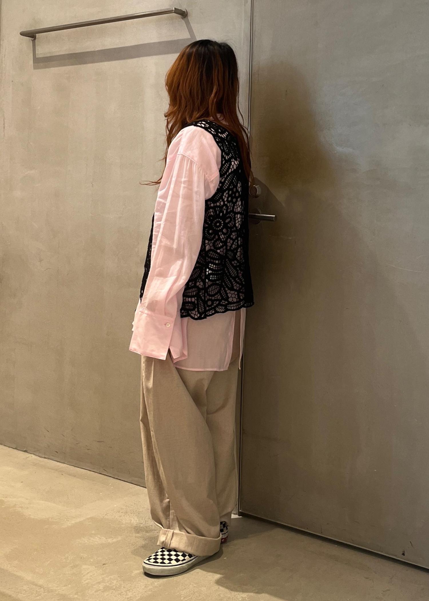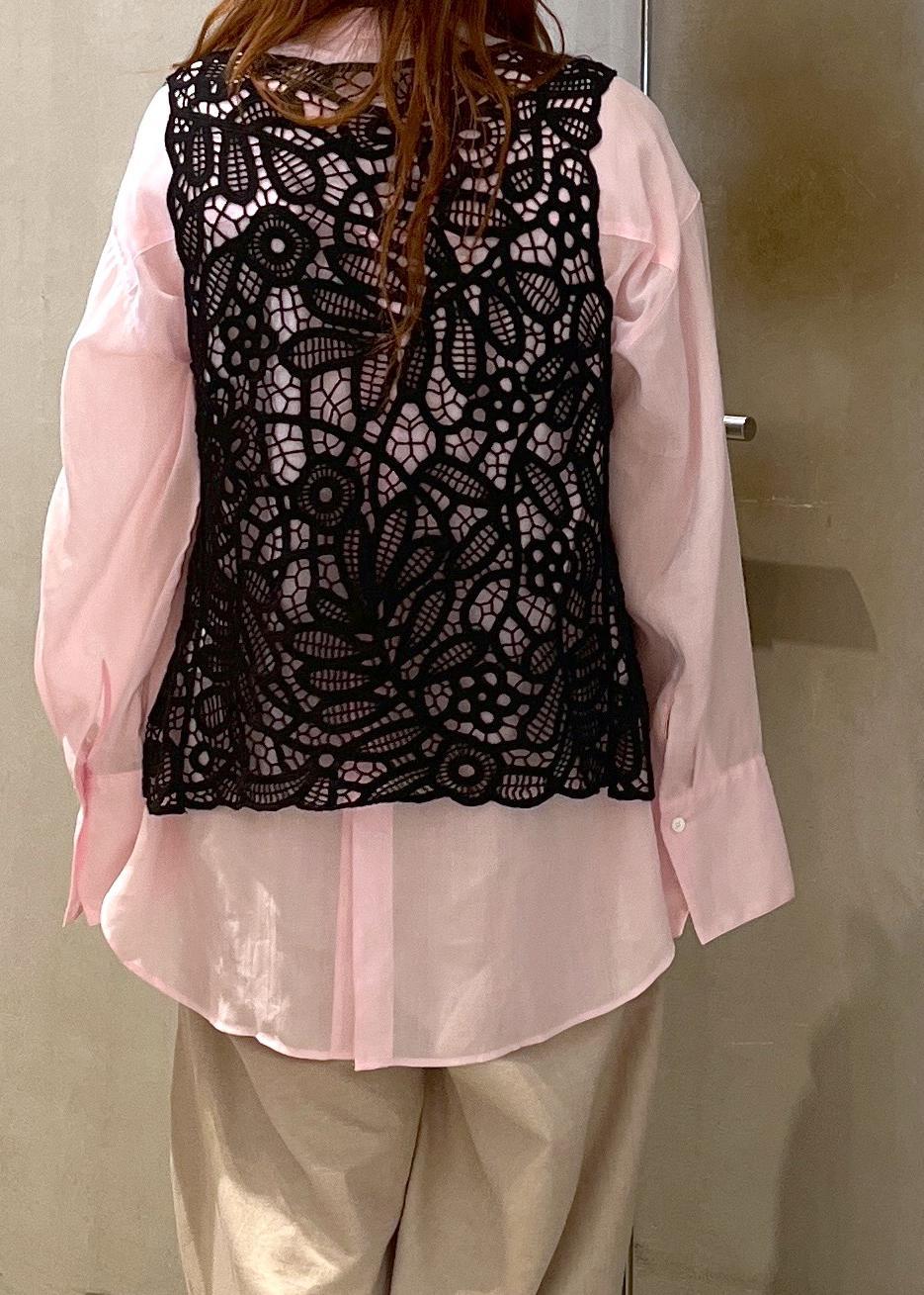 レースベストはプラスするだけで華やかさやフェミニンさが出ます。着回しが効くアイテムです。