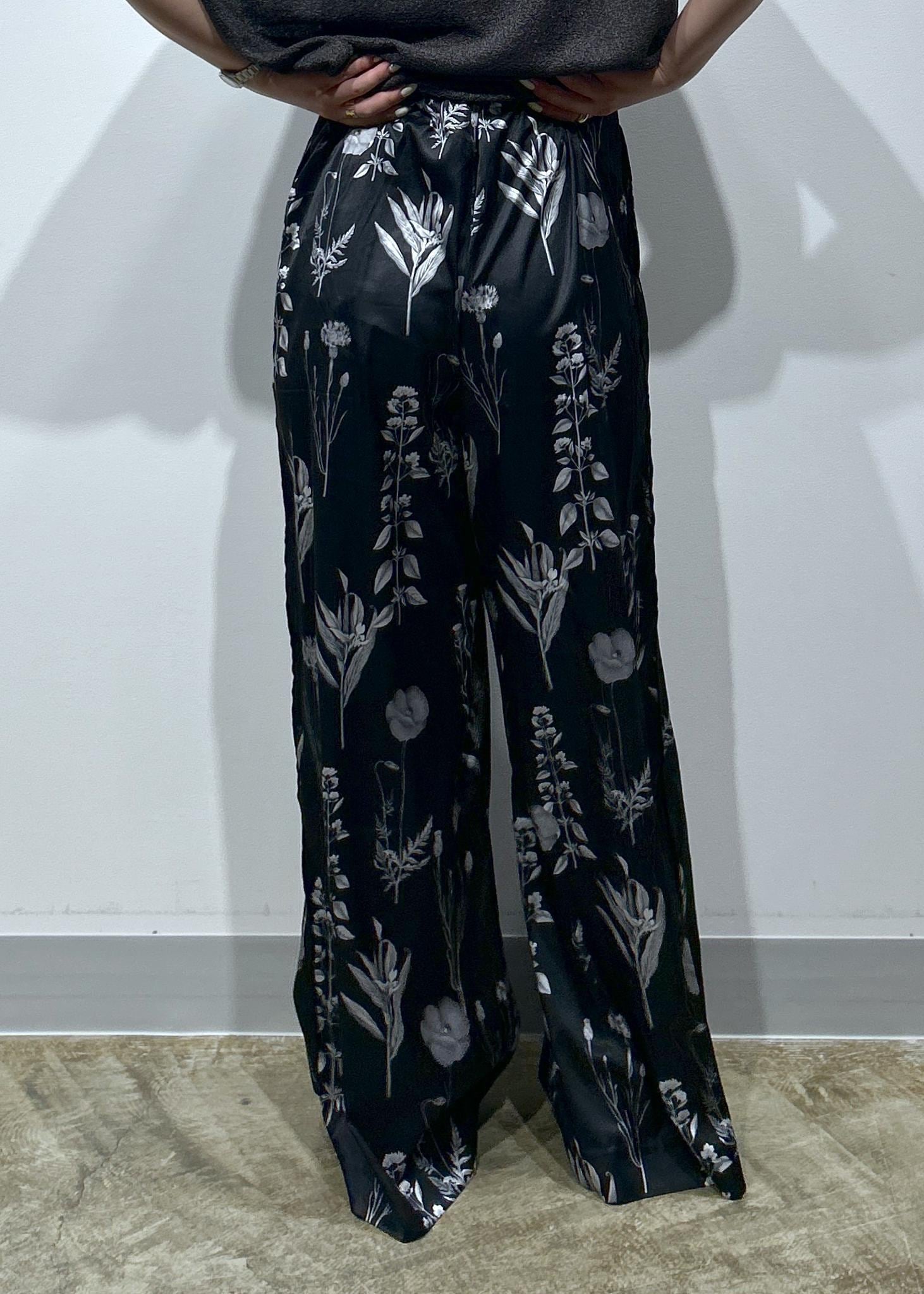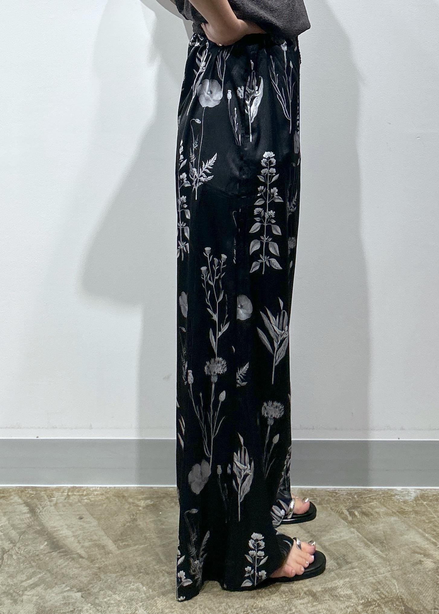 ウエストはゴムで脚のラインなどは拾わない楽な履き心地ながら、サテンのようなツルッと落ち感のある素材が上品に決まります◎