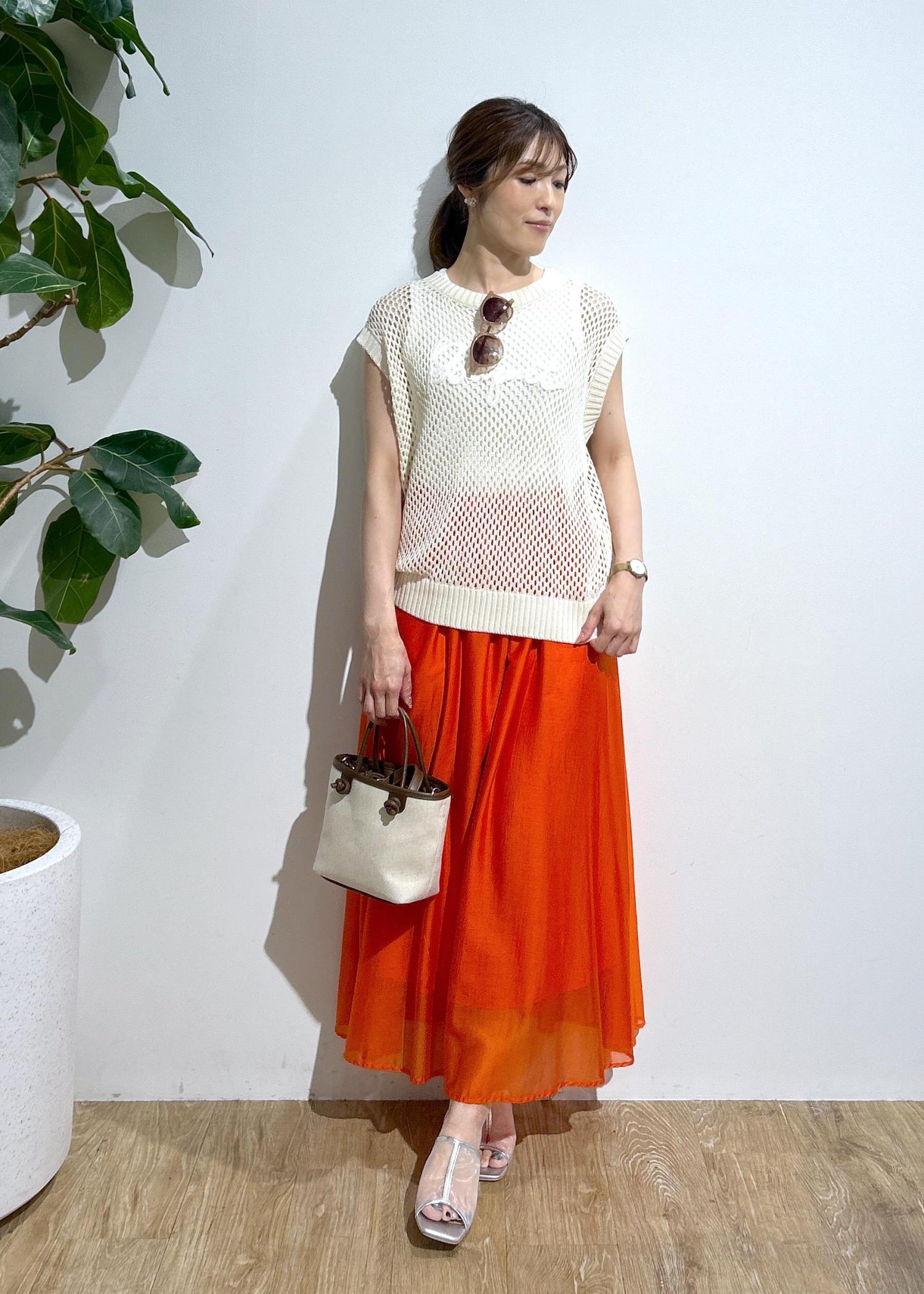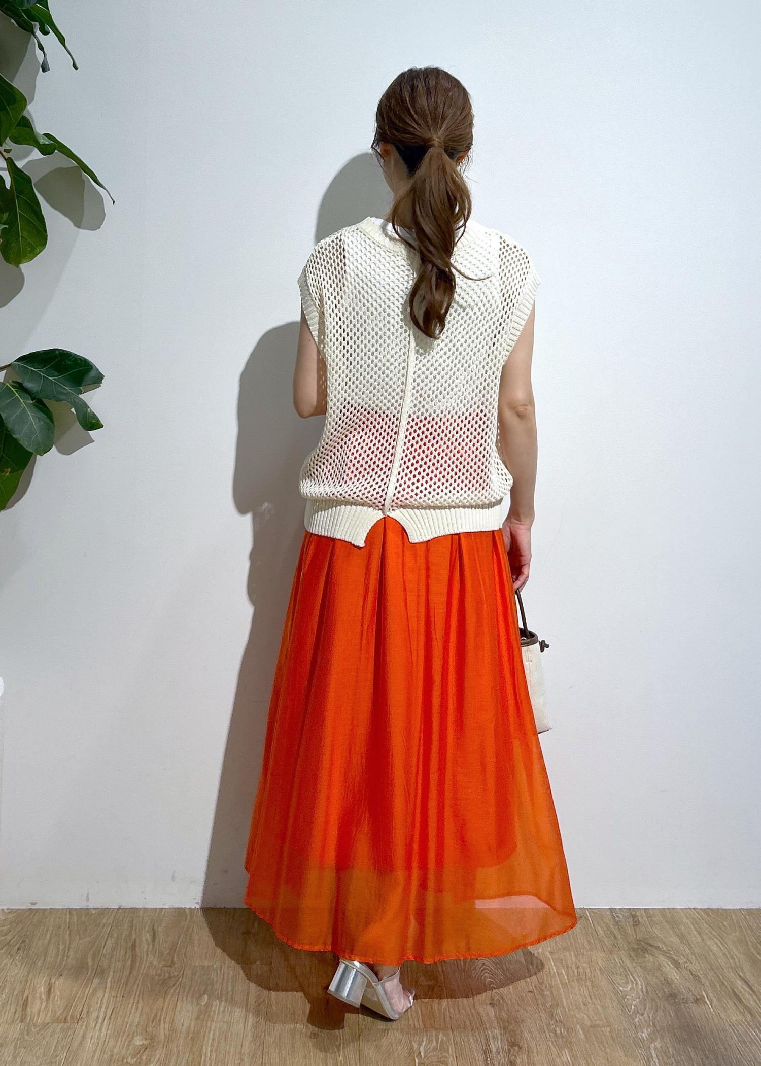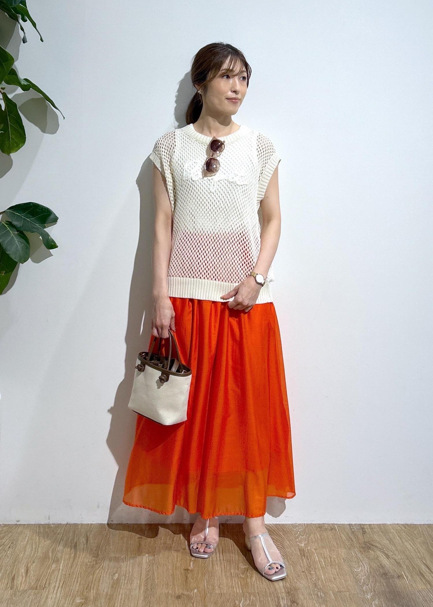 ROPÉ PICNICエアリーシアーギャザーロングスカートオレンジ / 38¥6,490レビュー裏地もサラッとしており、肌にまとわりつかないので暑い夏でも快適に過ごせますよ。