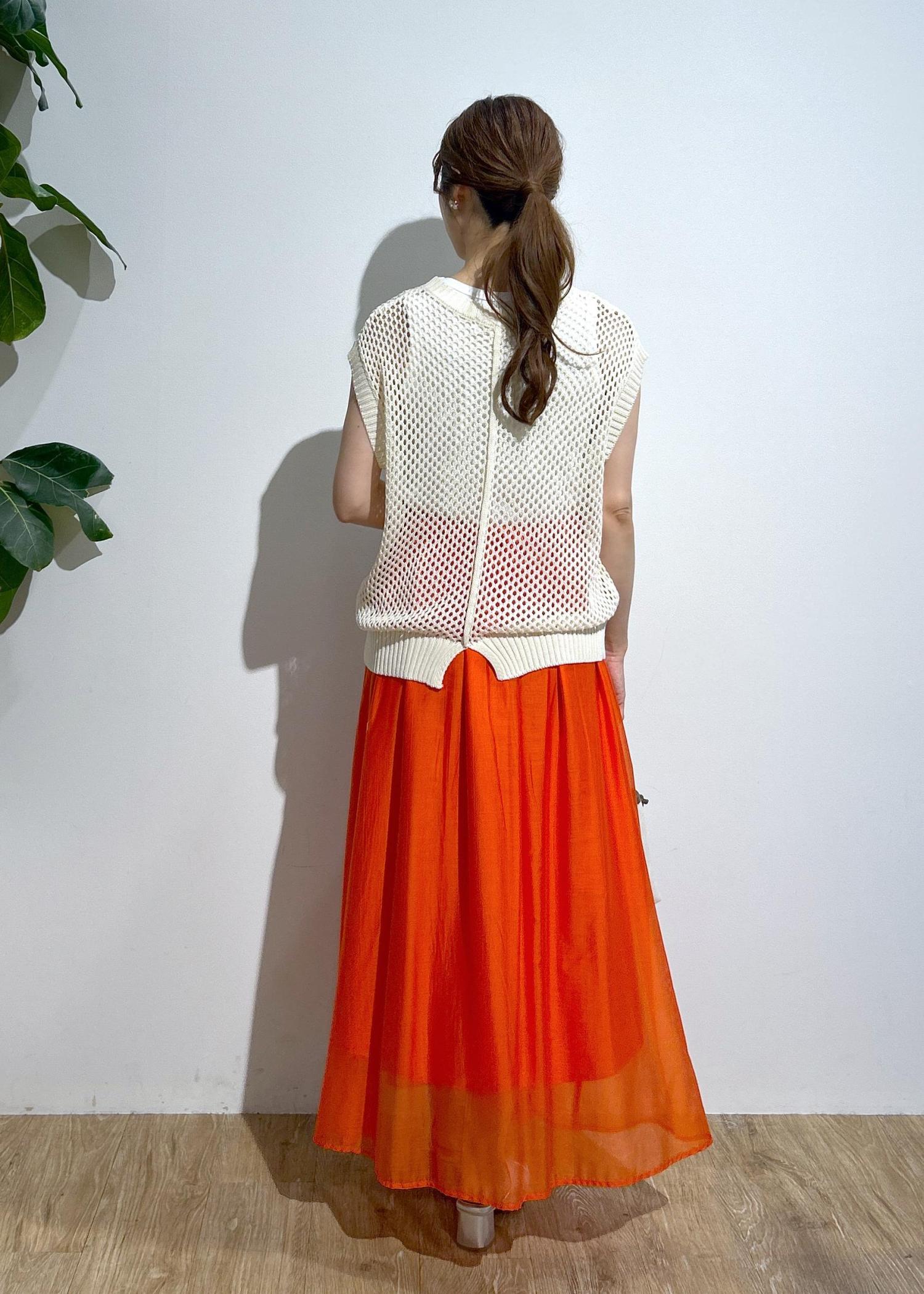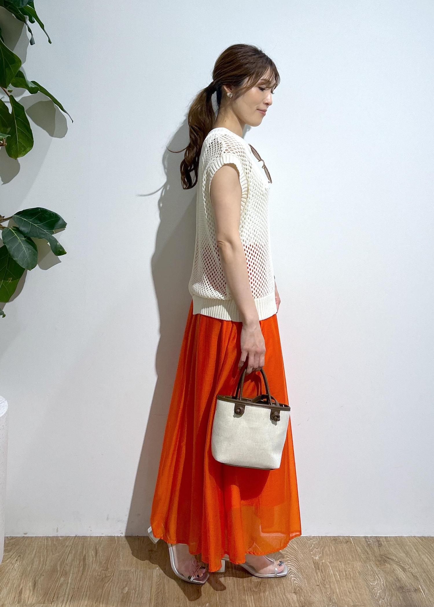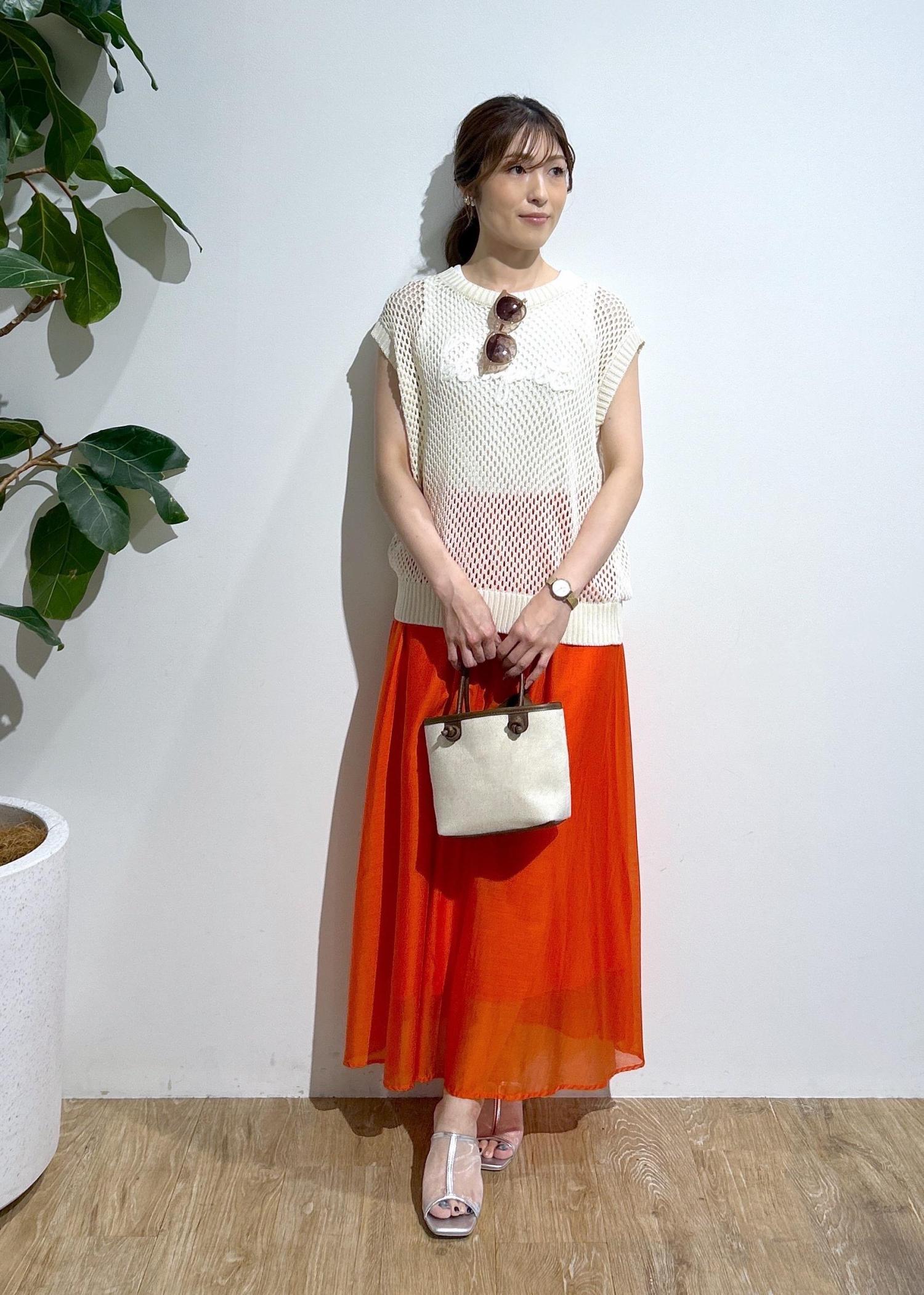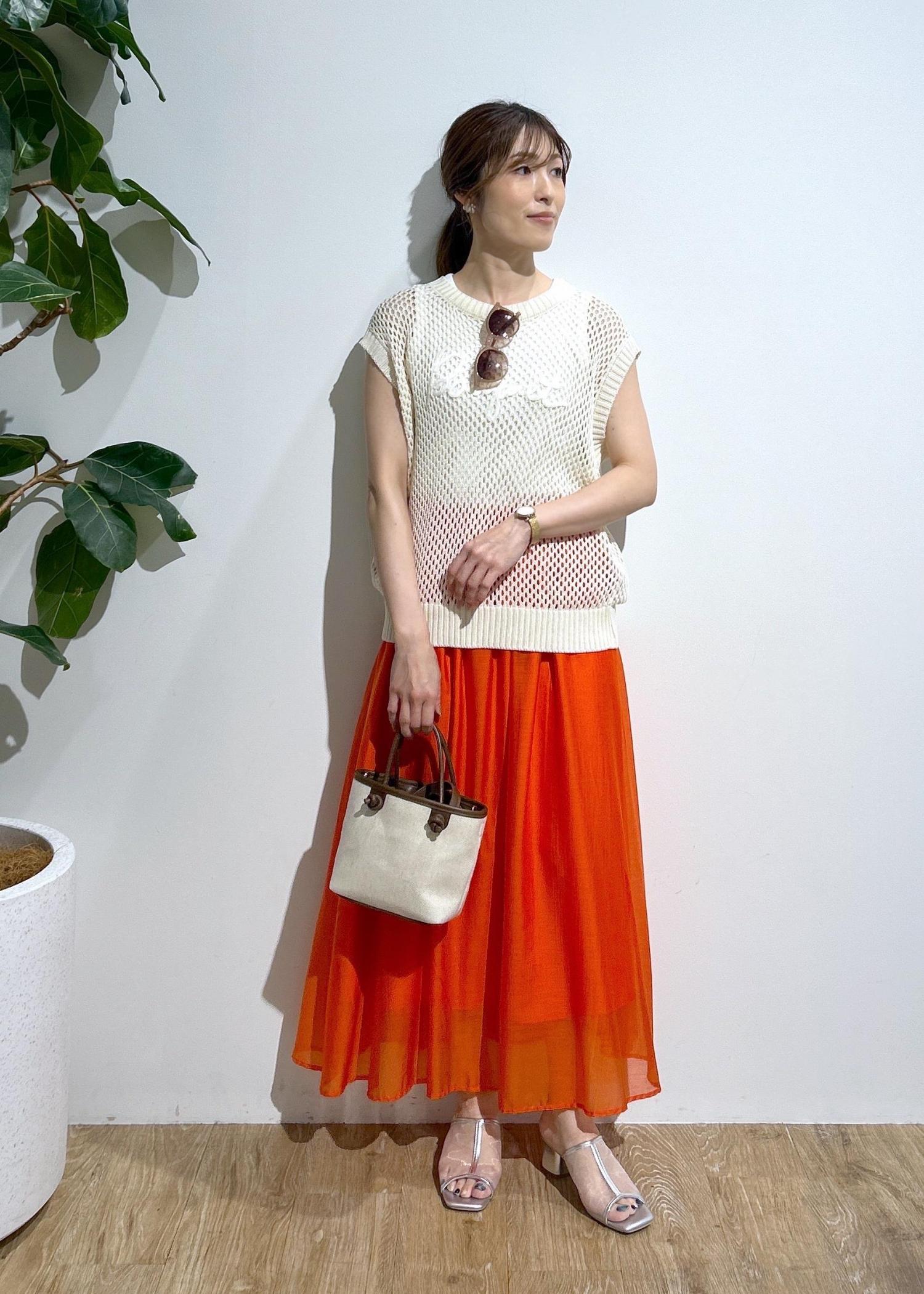 ROPÉ PICNICエアリーシアーギャザーロングスカートオレンジ / 38¥6,490レビュー裏地もサラッとしており、肌にまとわりつかないので暑い夏でも快適に過ごせますよ。