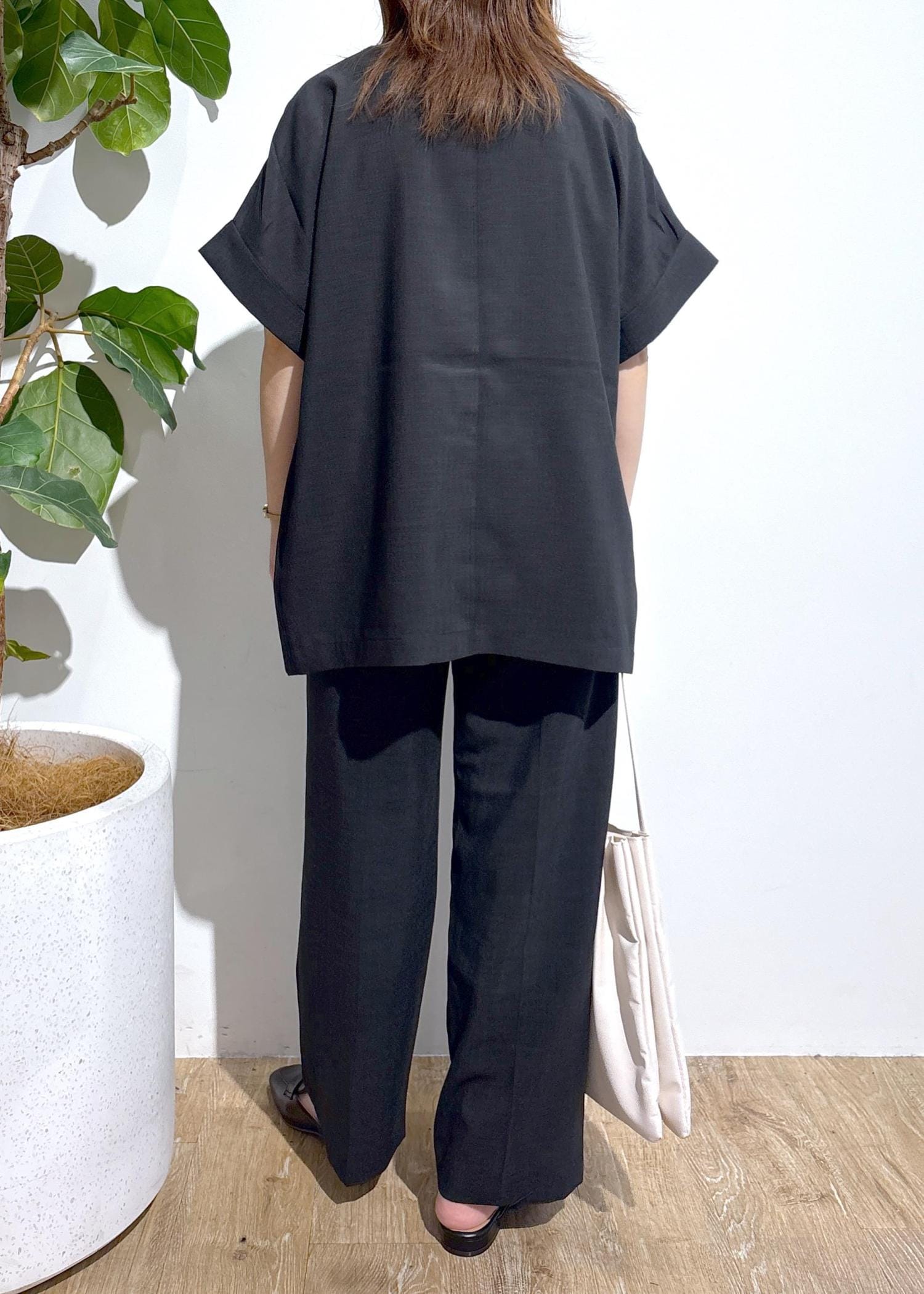 リラックスして着用できるサイズ感ながらも、すとんと落ち感があるのでボリュームが出過ぎず、ロールアップされた袖丈ですっきり見えします。