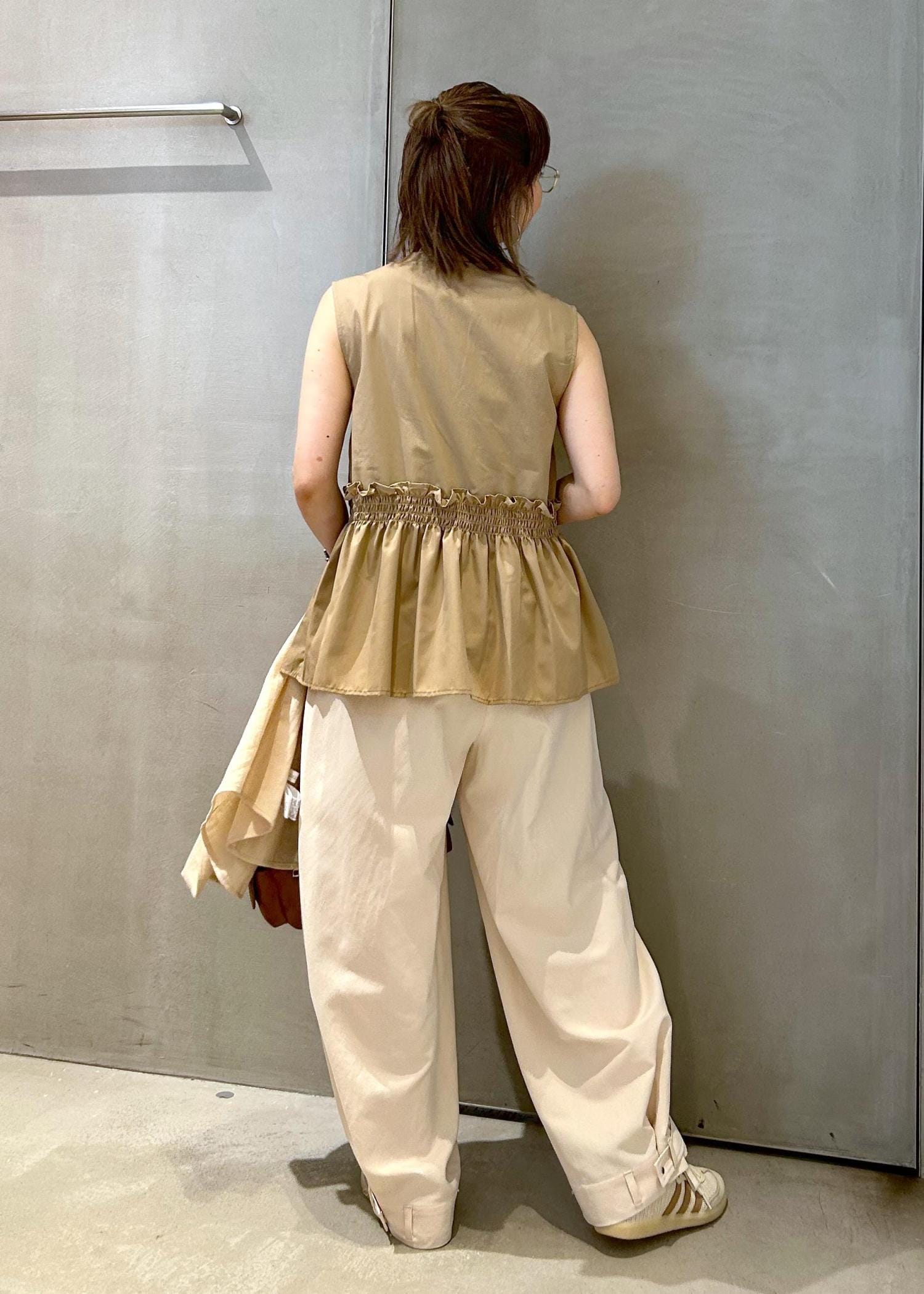 トーンを合わせると、フリルも甘くなり過ぎず、むしろ表情が出るので、合わせるパンツはシンプルでOK!