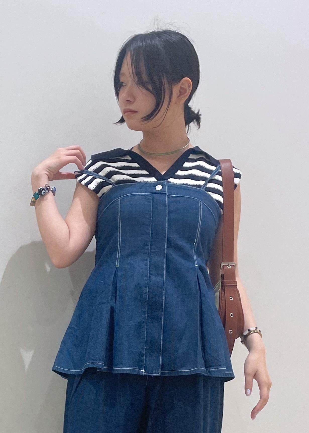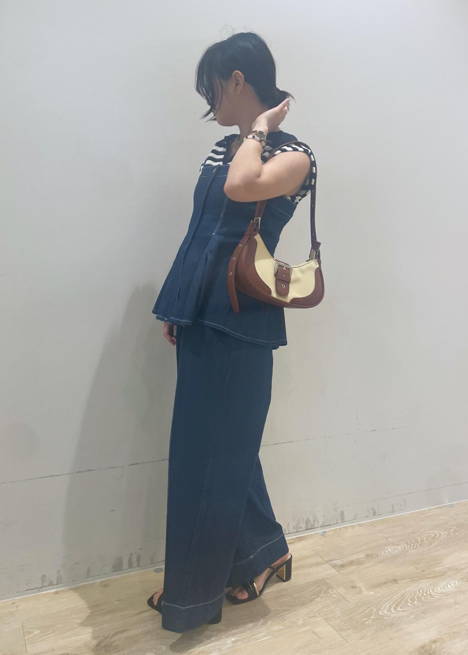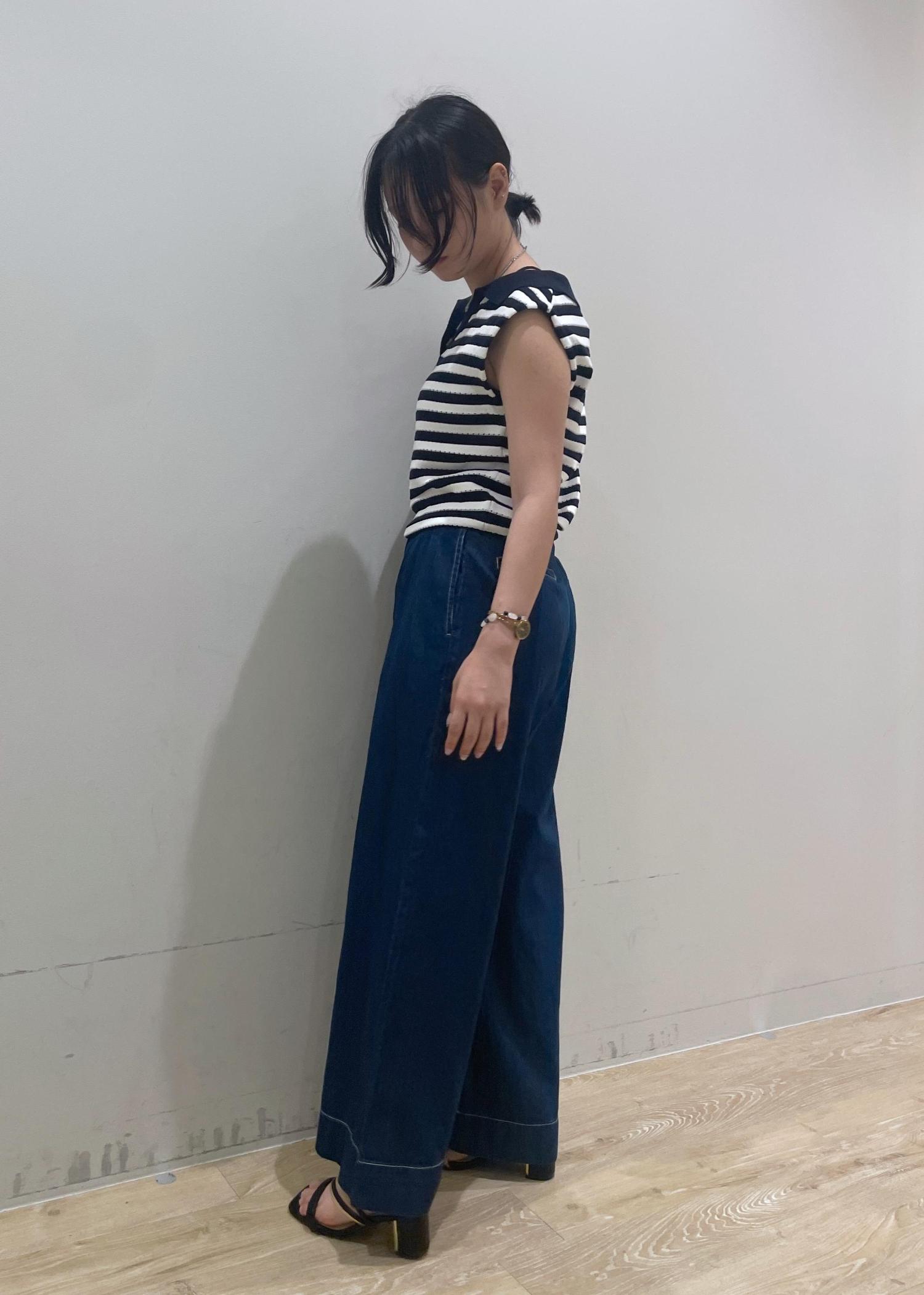 デニム×ボーダーの定番コンビを、フレアトップスでフェミニンに格上げしています!ゆるワイドパンツがリラクシーなムードもプラスしてくれます!