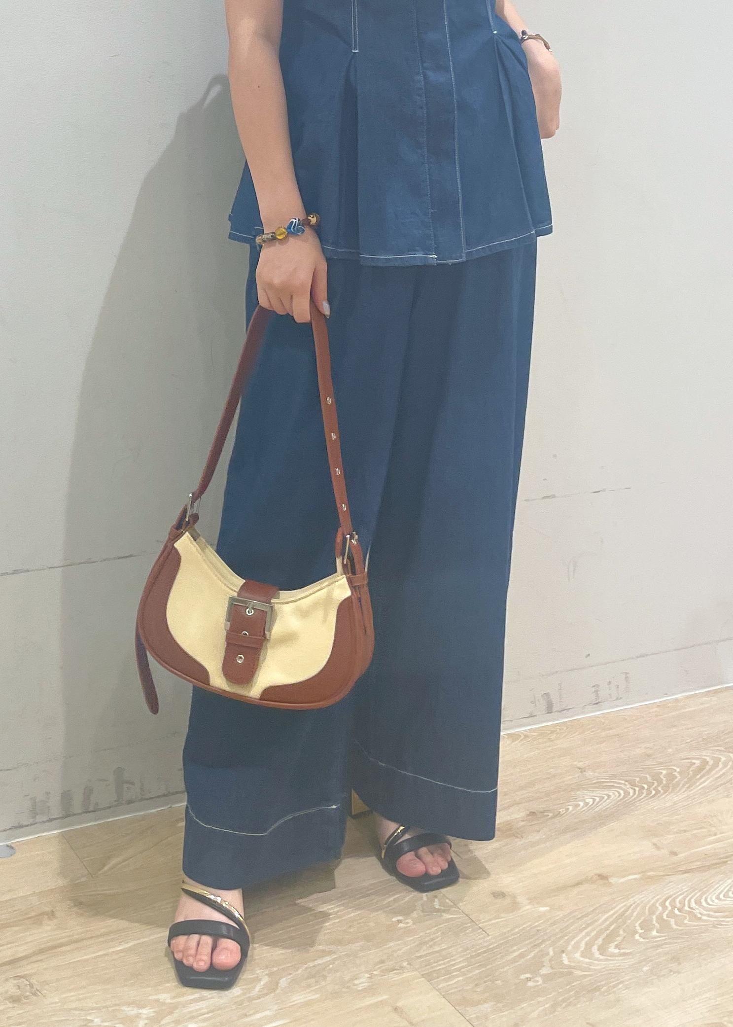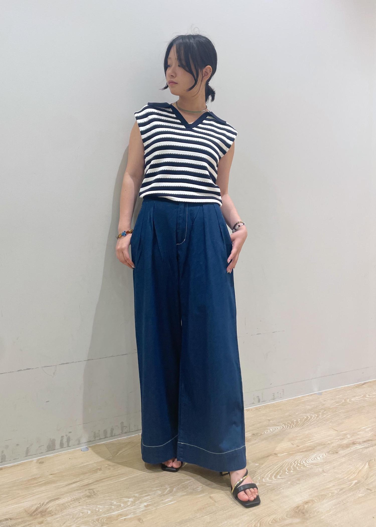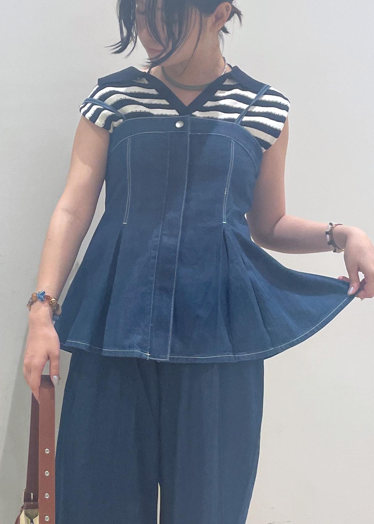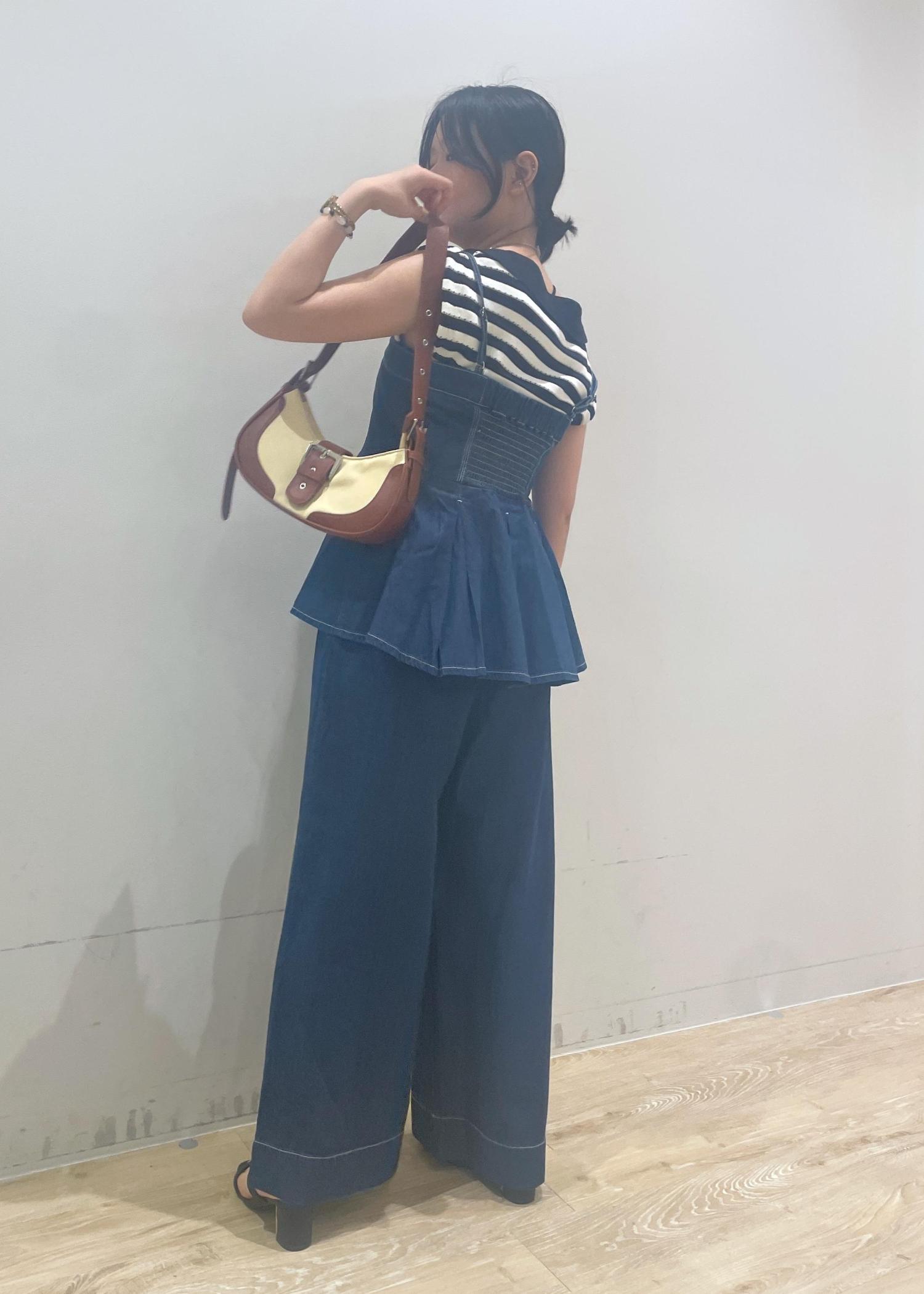 デニム×ボーダーの定番コンビを、フレアトップスでフェミニンに格上げしています!ゆるワイドパンツがリラクシーなムードもプラスしてくれます!
