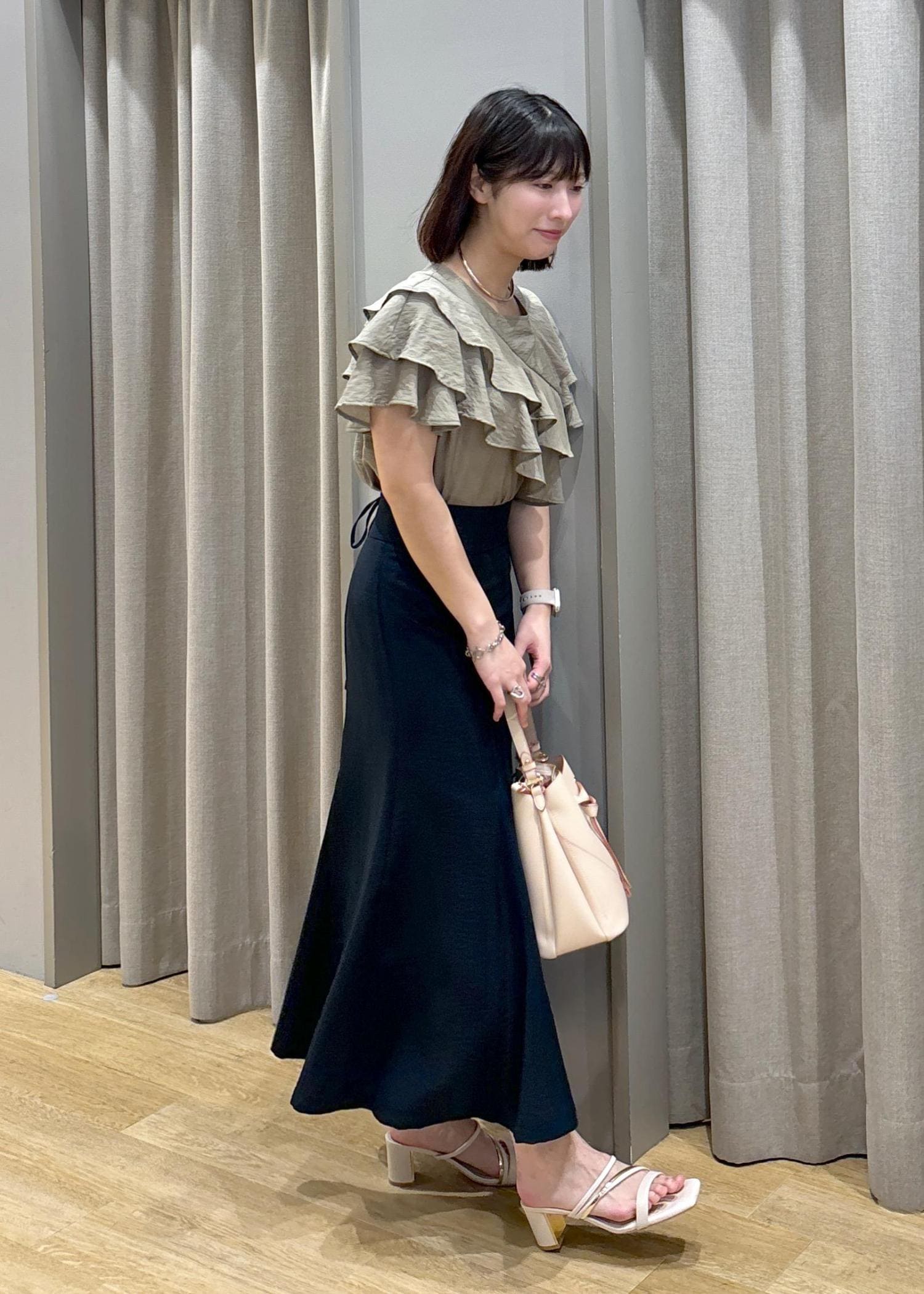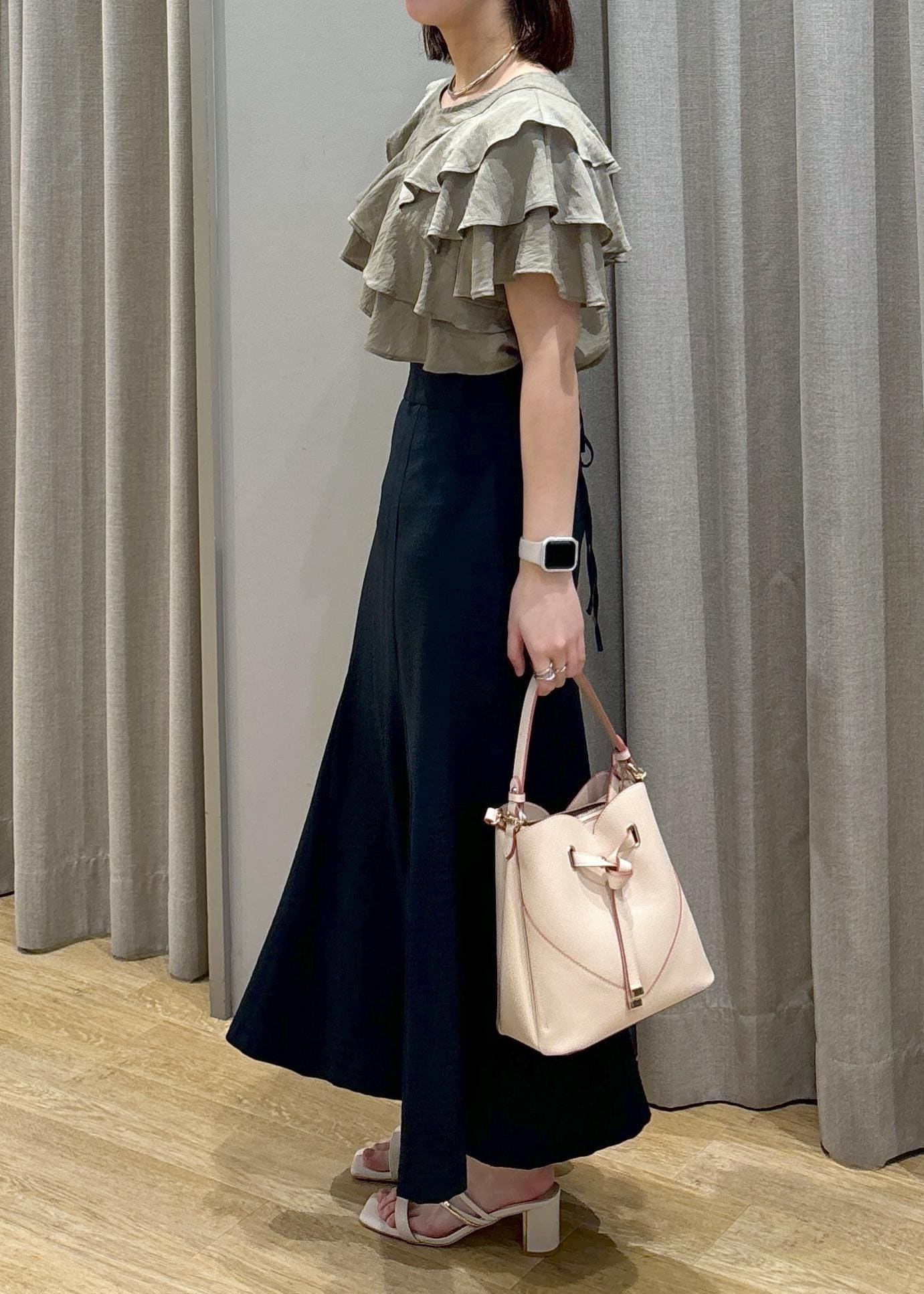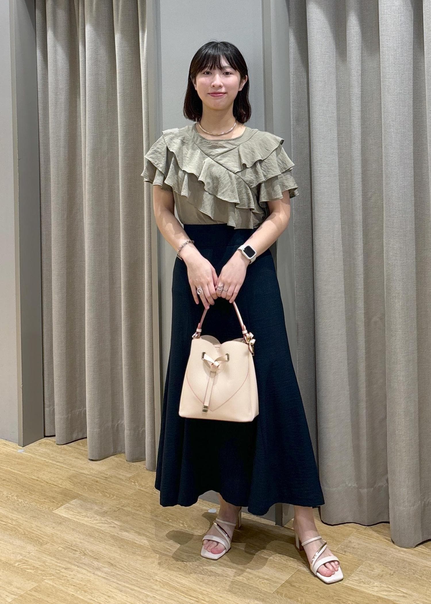 アウトレットVISフリルティアードブラウスカーキ / F¥4,391レビュー身長158cm、Fサイズ着用。
