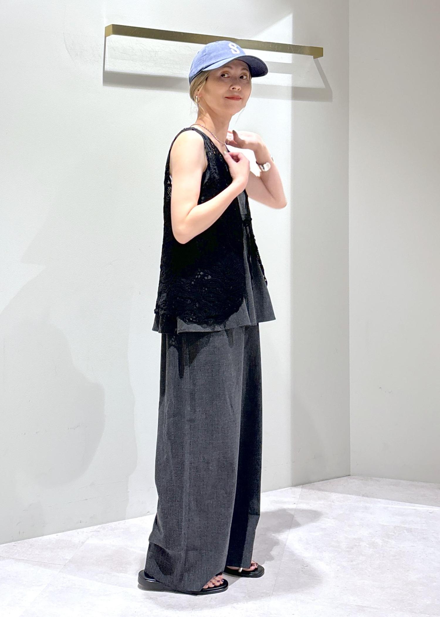 キャミロンパースにレースベストでレイヤードしたスタイルです。シックになりすぎないようにキャップでカジュアルな要素をプラスしました!