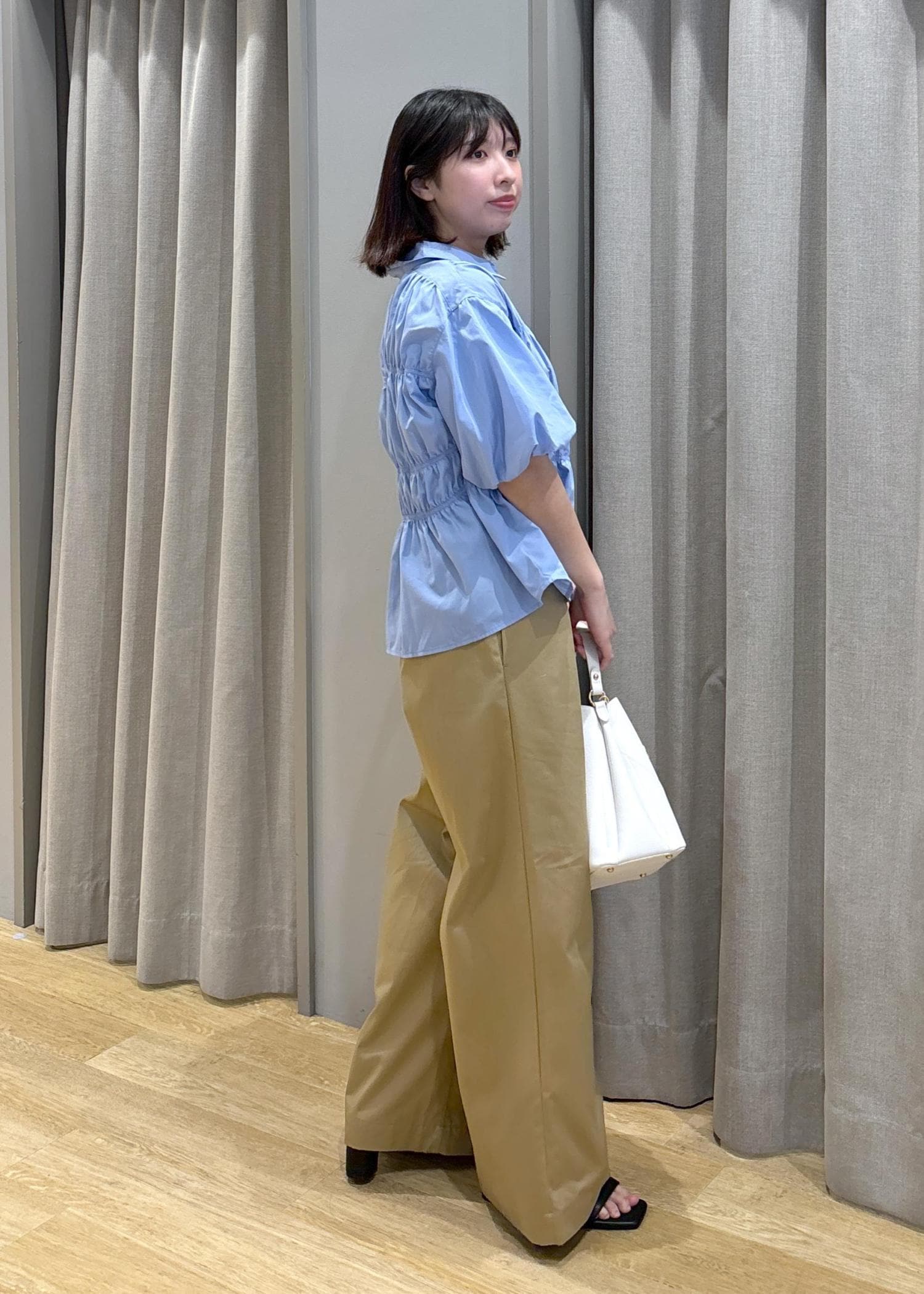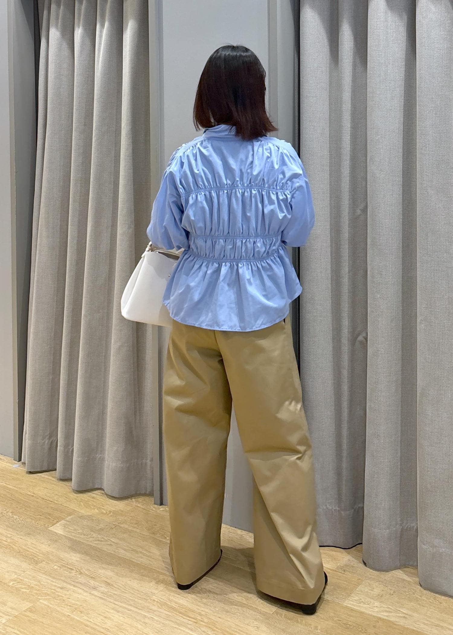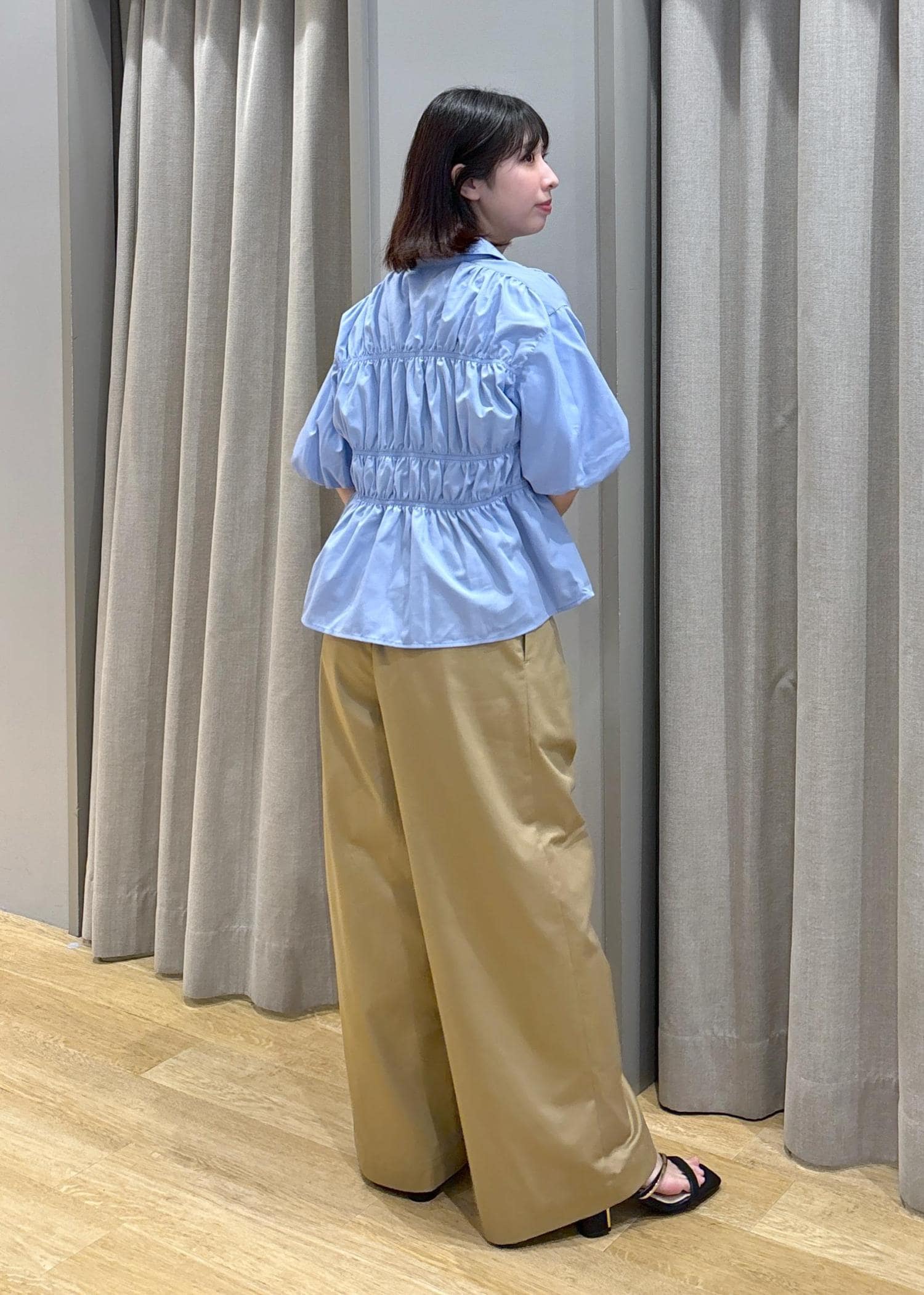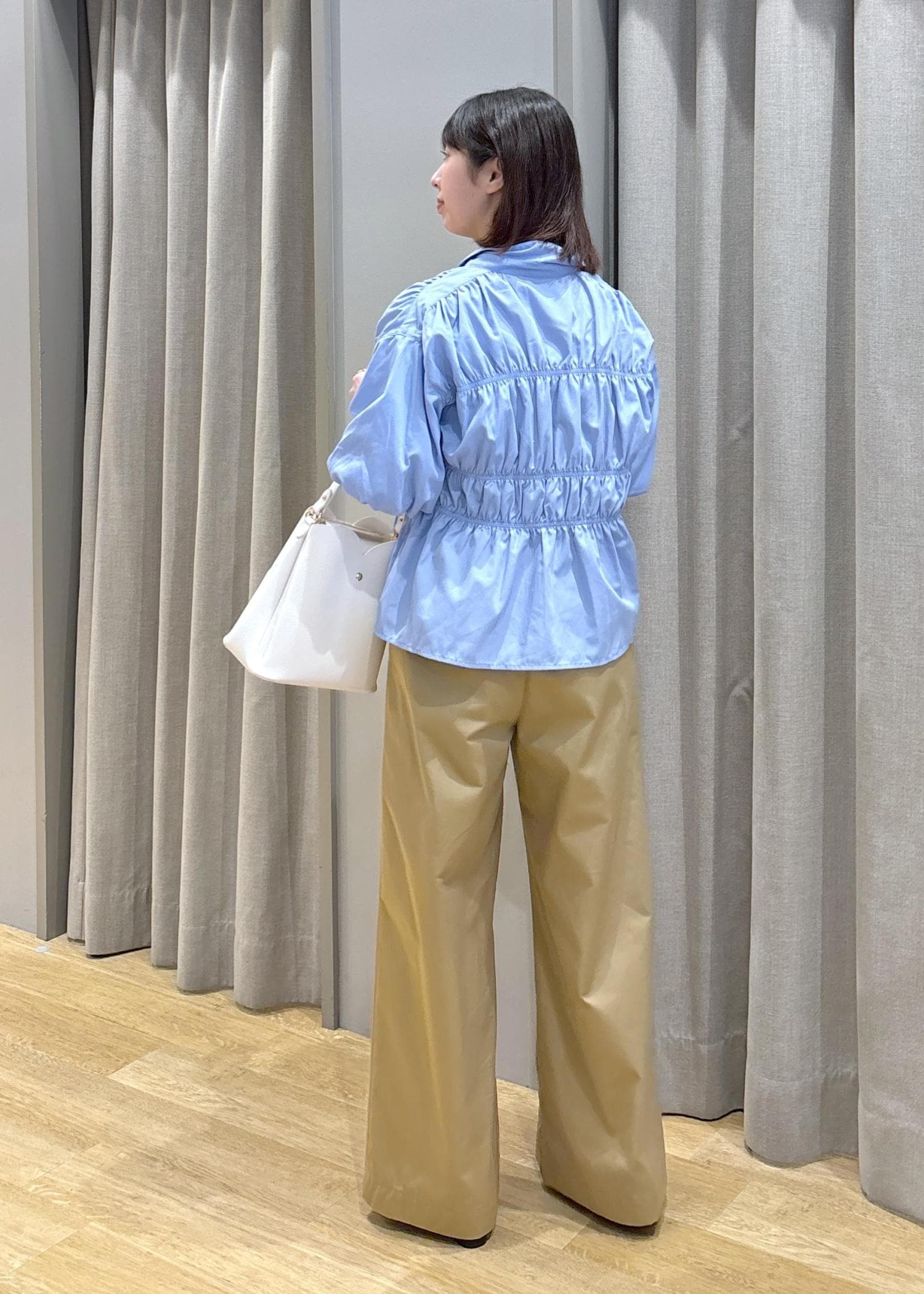 VIS【新色追加】【店頭人気】シャーリングバルーンシャツブルー系 / F¥5,489レビュー身長158cm、Fサイズ着用。