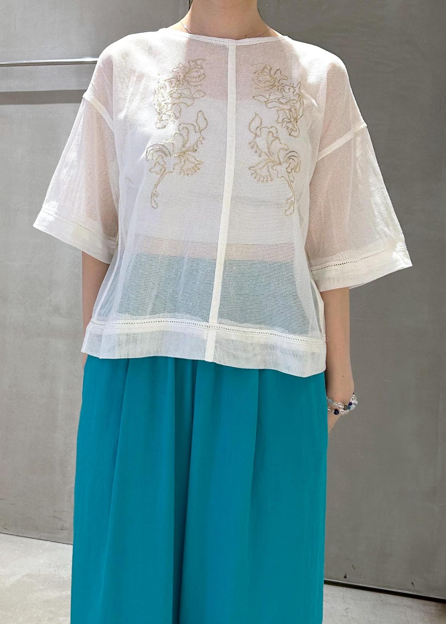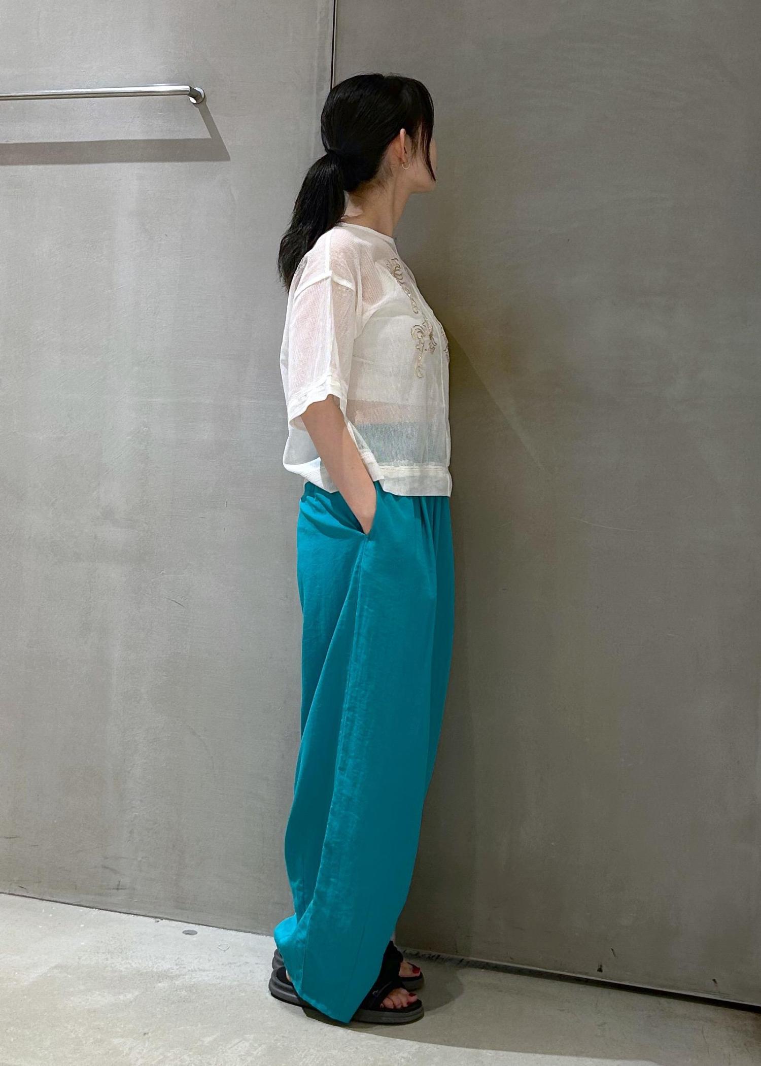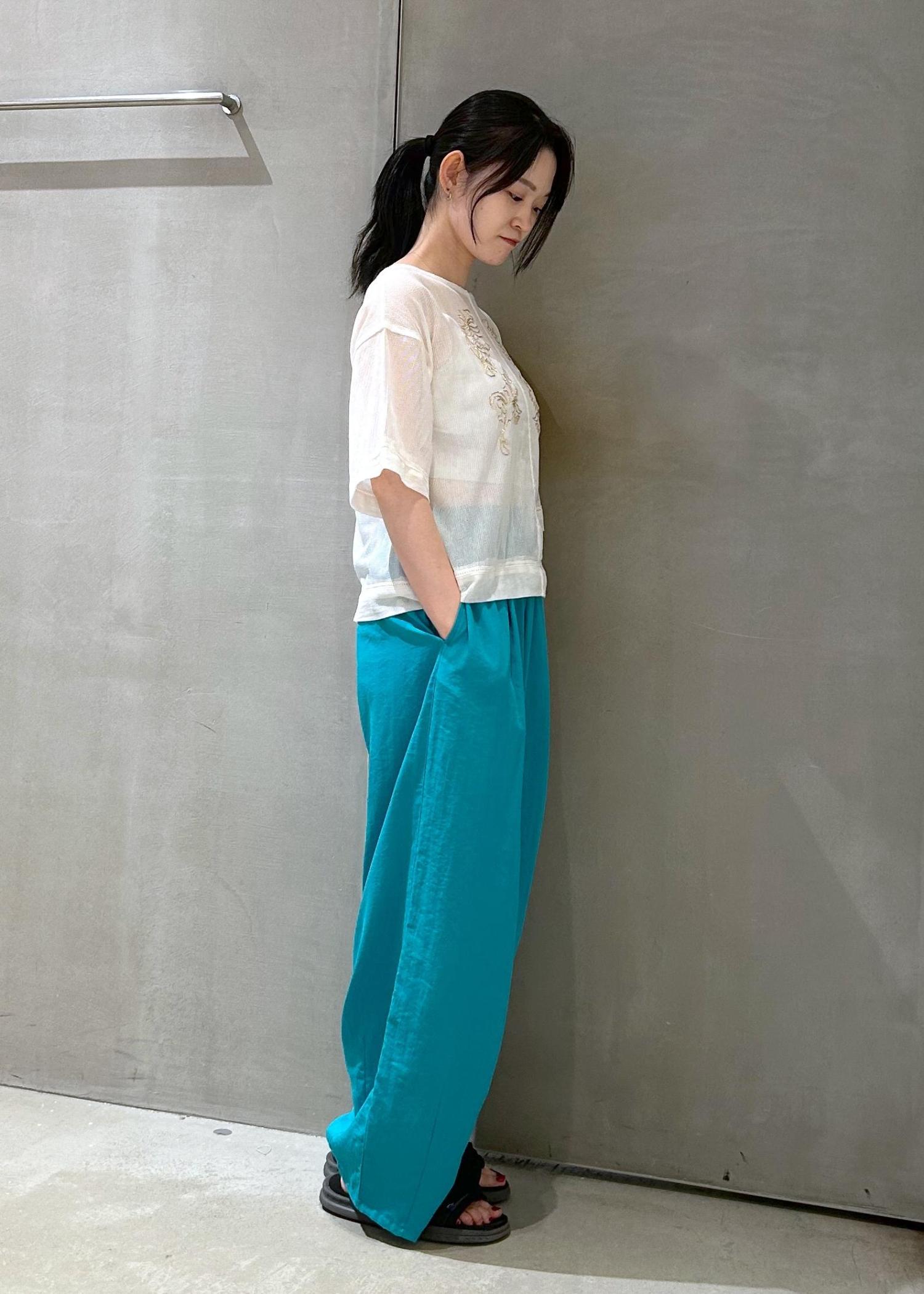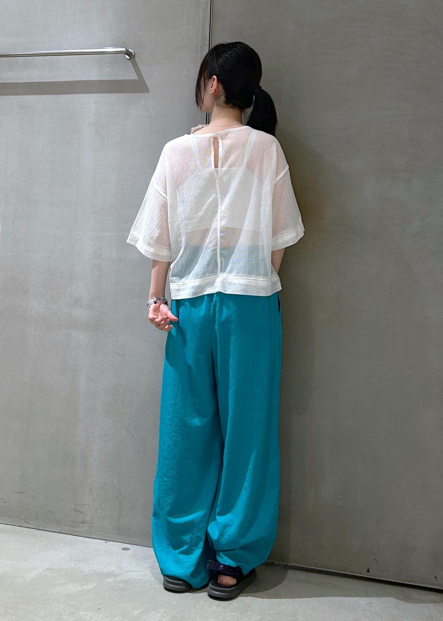 トップスは涼しいシアー素材で、パンツは夏らしい爽やかな色味で合わせてみました!