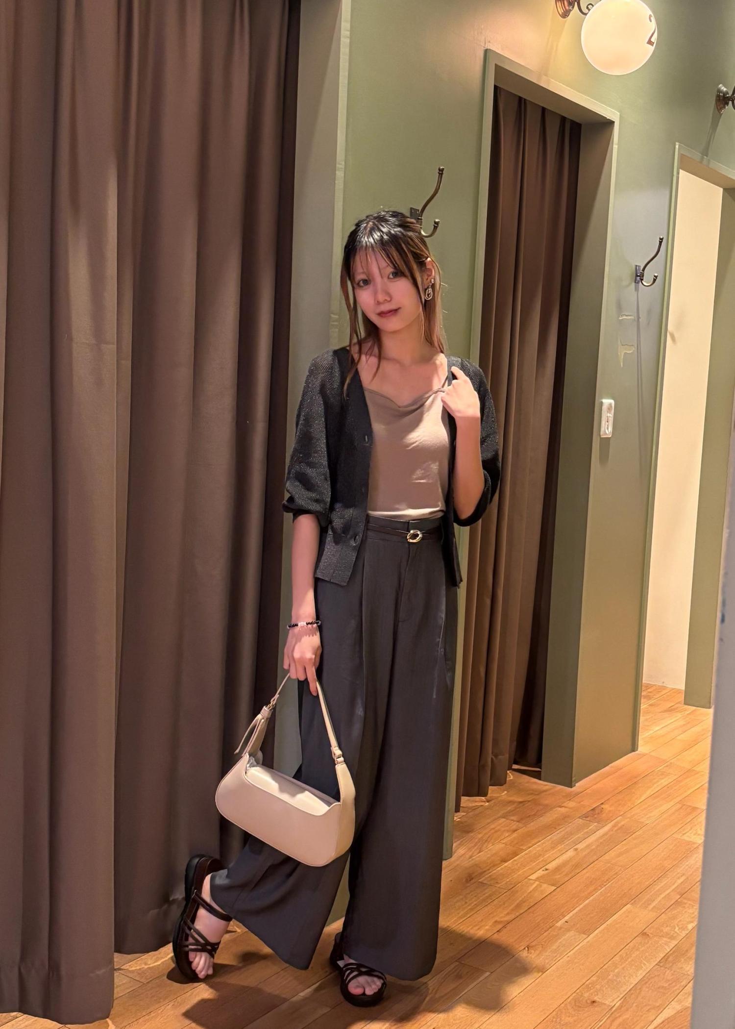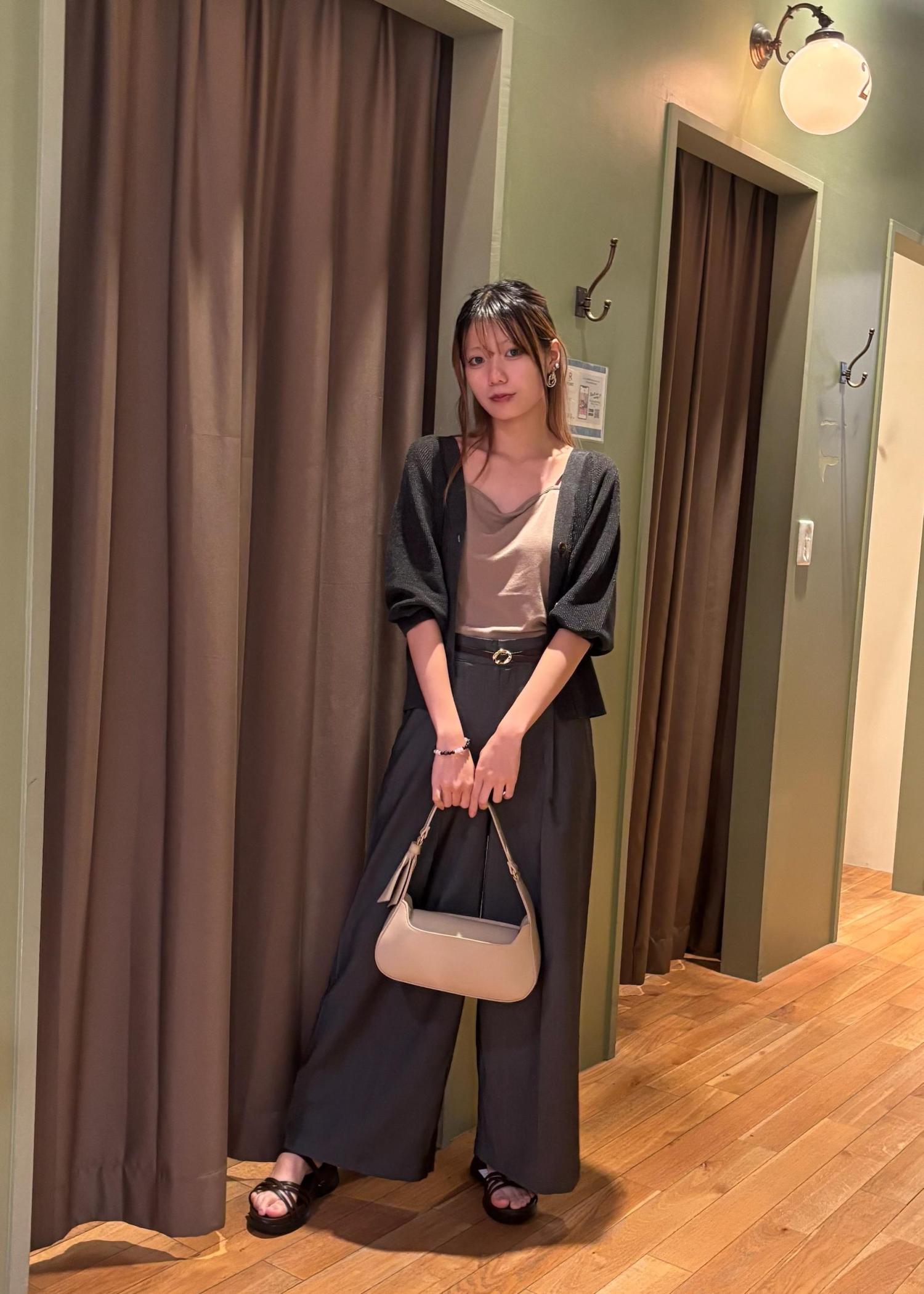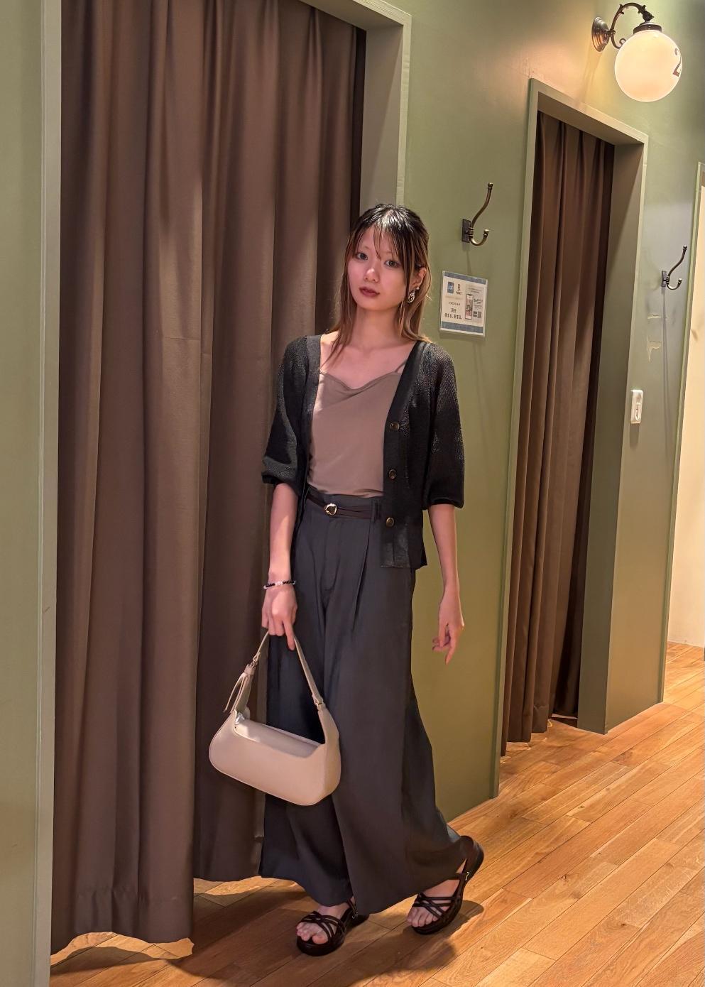 今回のコーデの主役のニットカーディガンは4色展開で種類豊富でシースルーで通気性のある素材なので夏にもピッタリなアイテムです!Tシャツやキャミソールとも相性抜群で程よい肌見せが大人っぽさを引き出してくれます