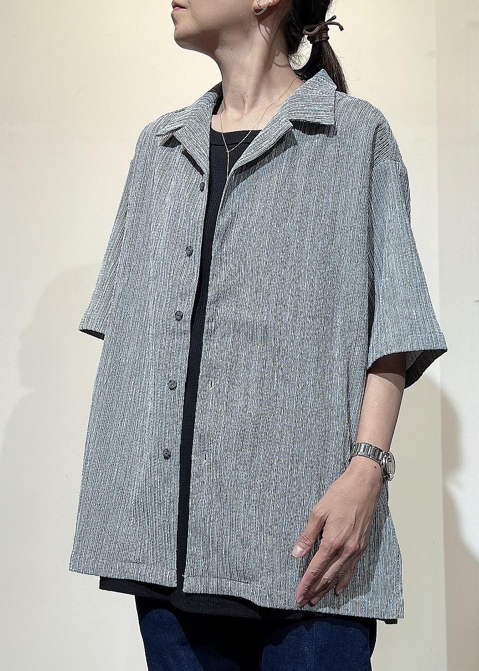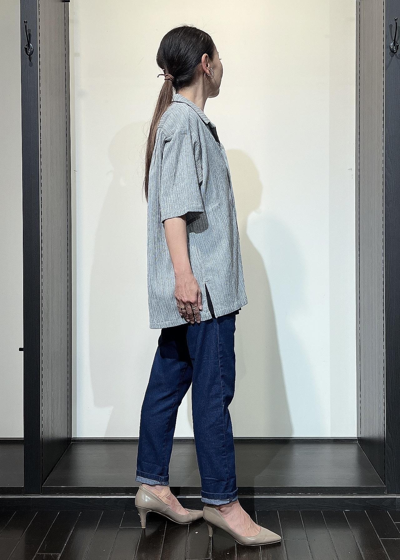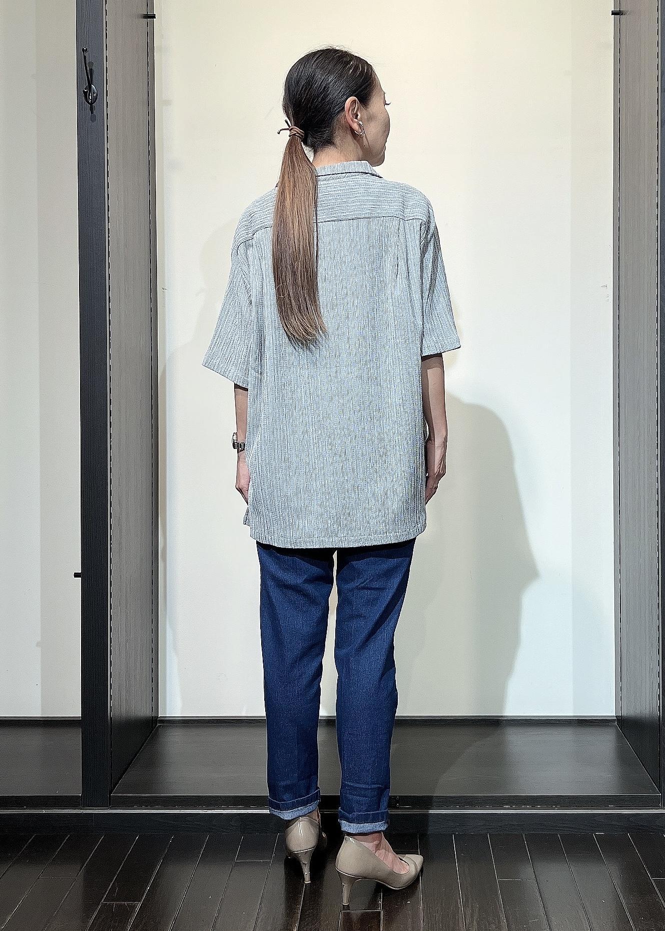 オーバーサイズのオープンカラーシャツにエコデニムスリムパンツを合わせてきれいめスタイルにしました。