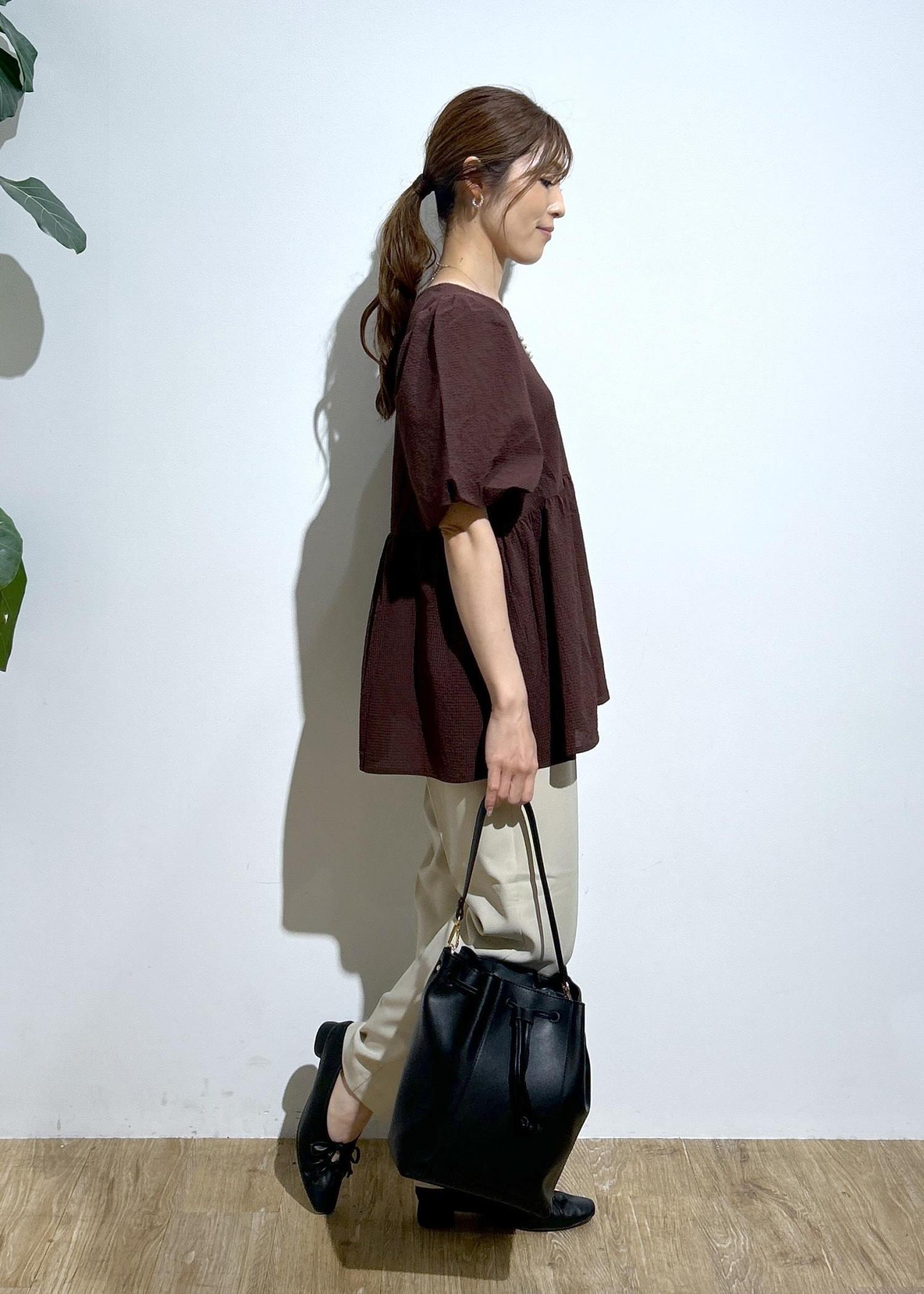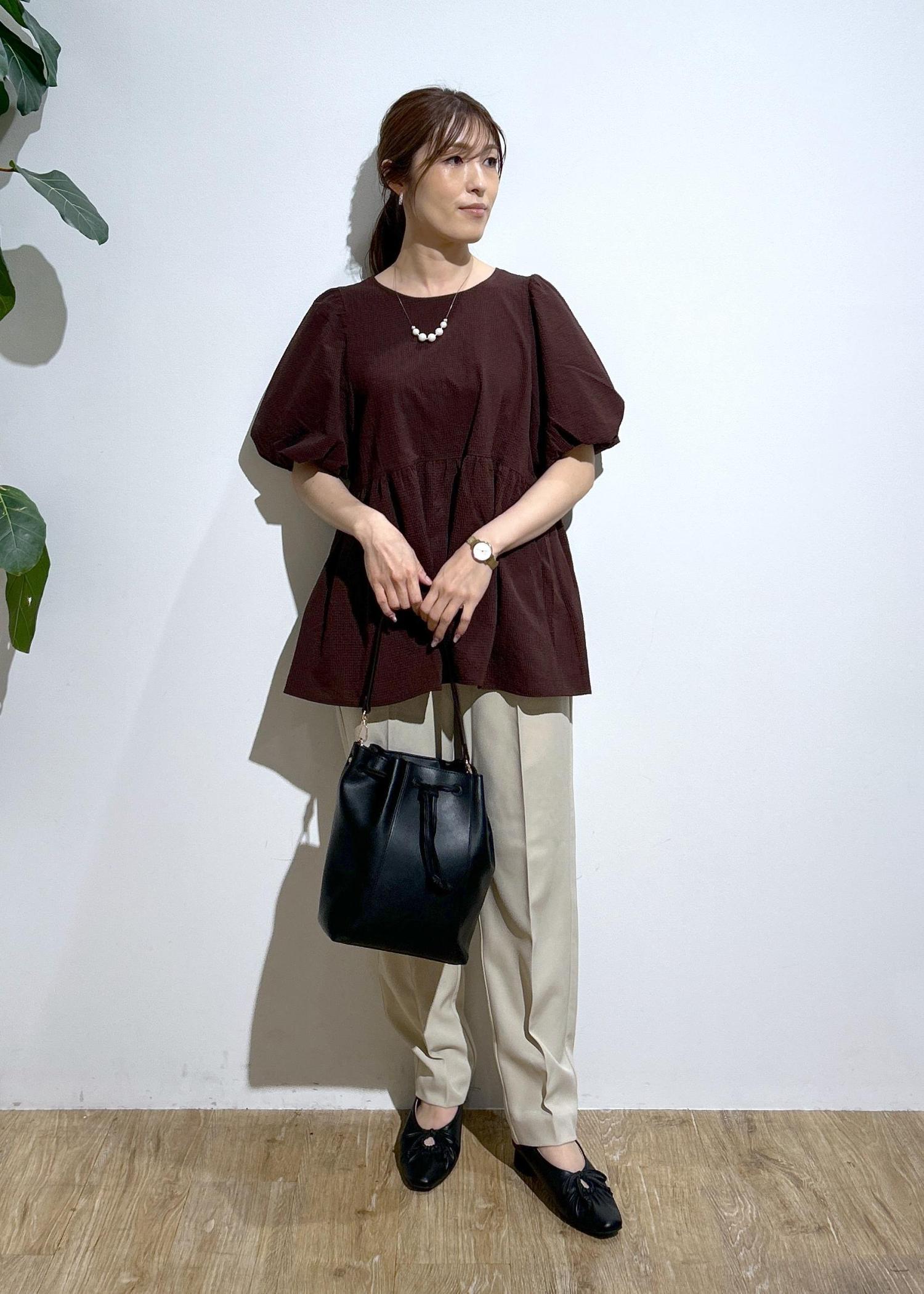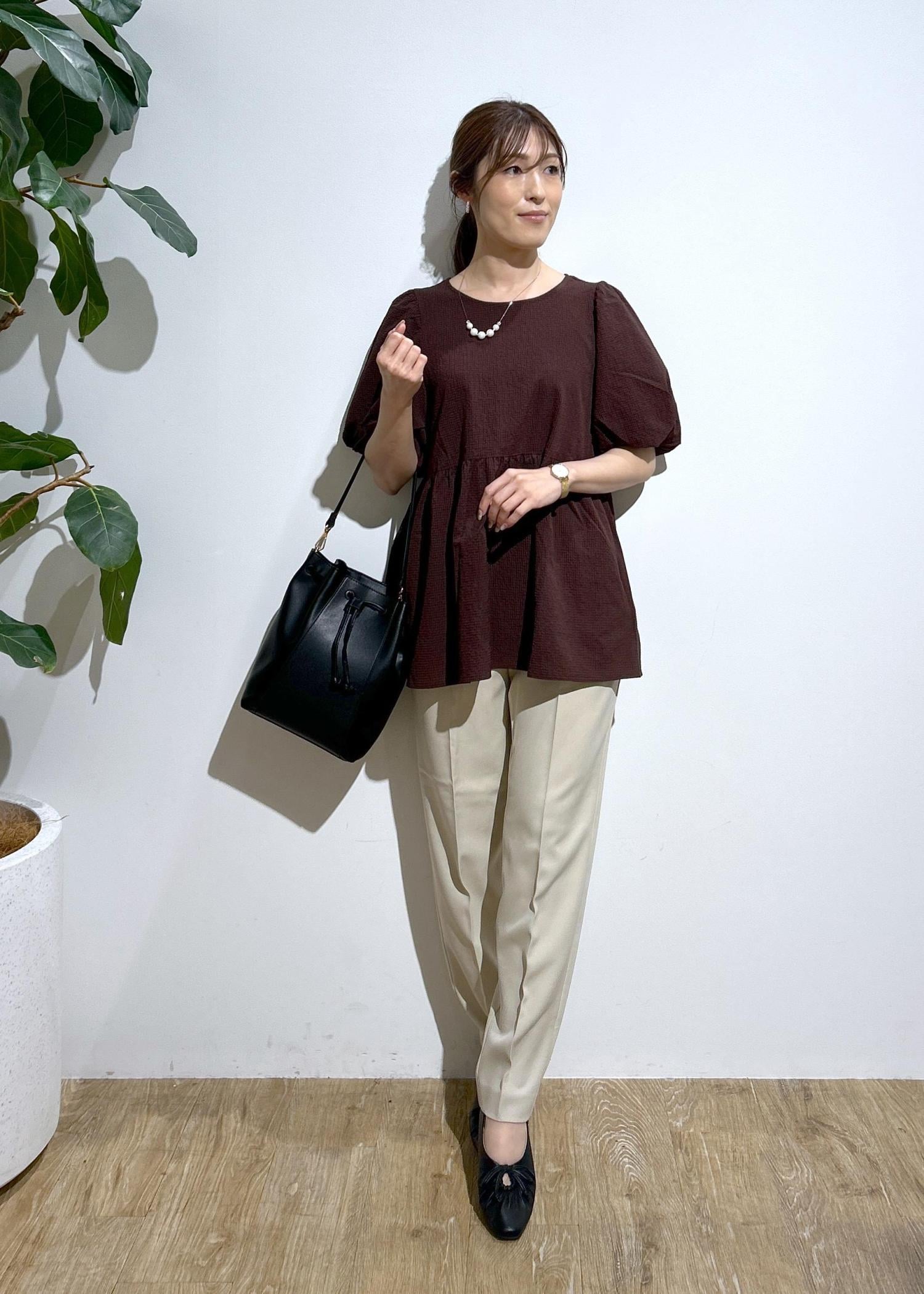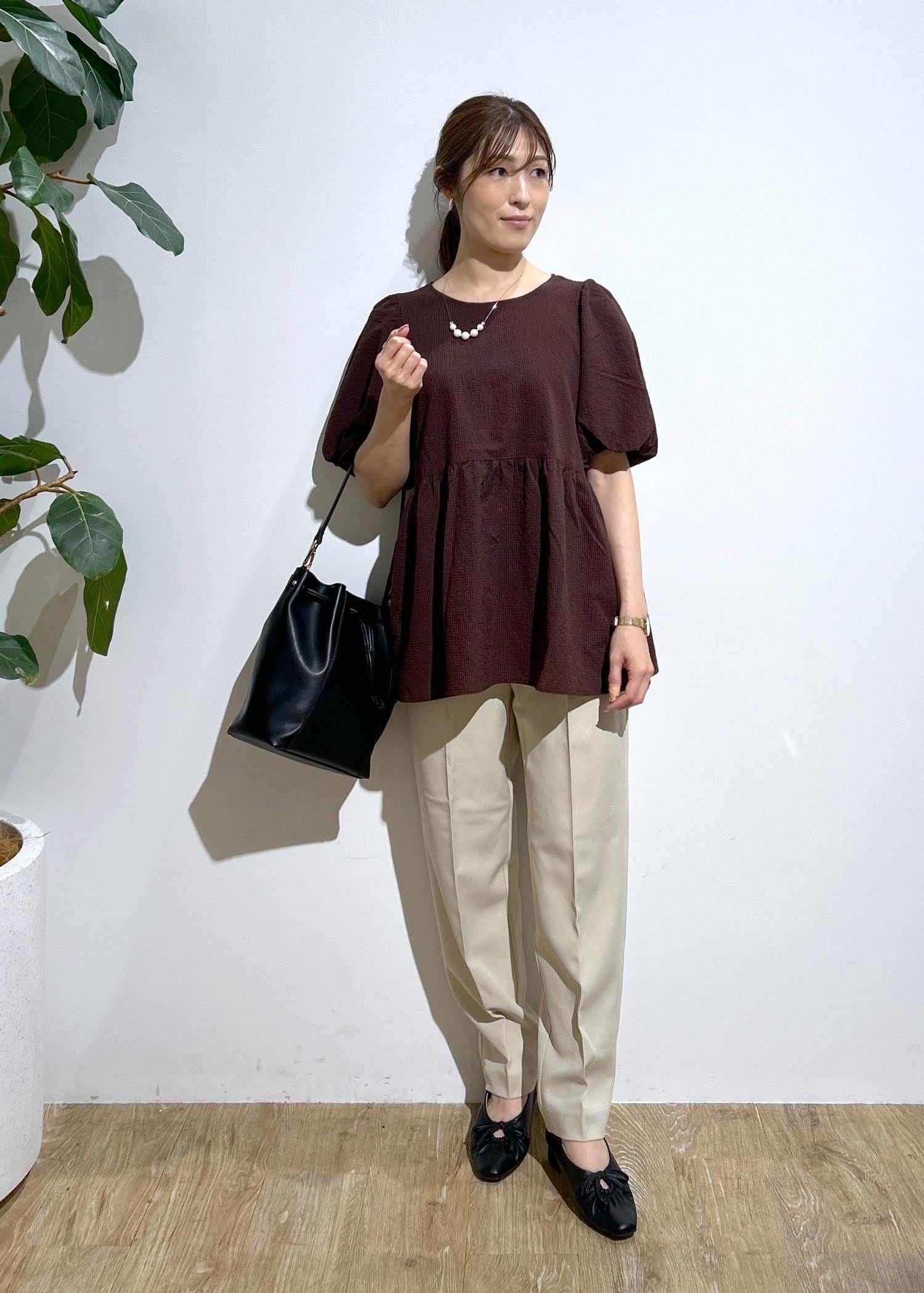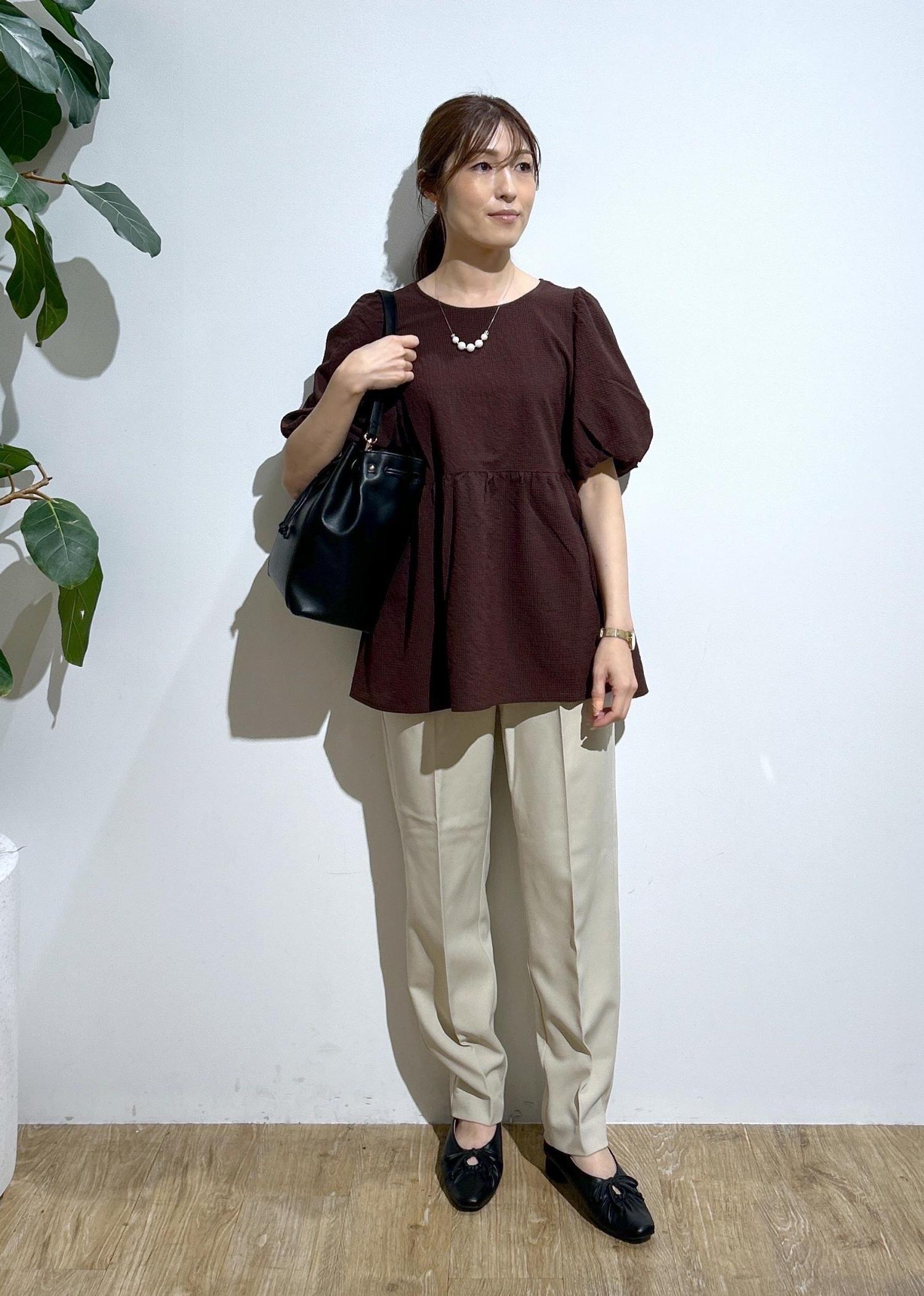 秋を感じさせるブラウンのブラウス×ベージュパンツ。