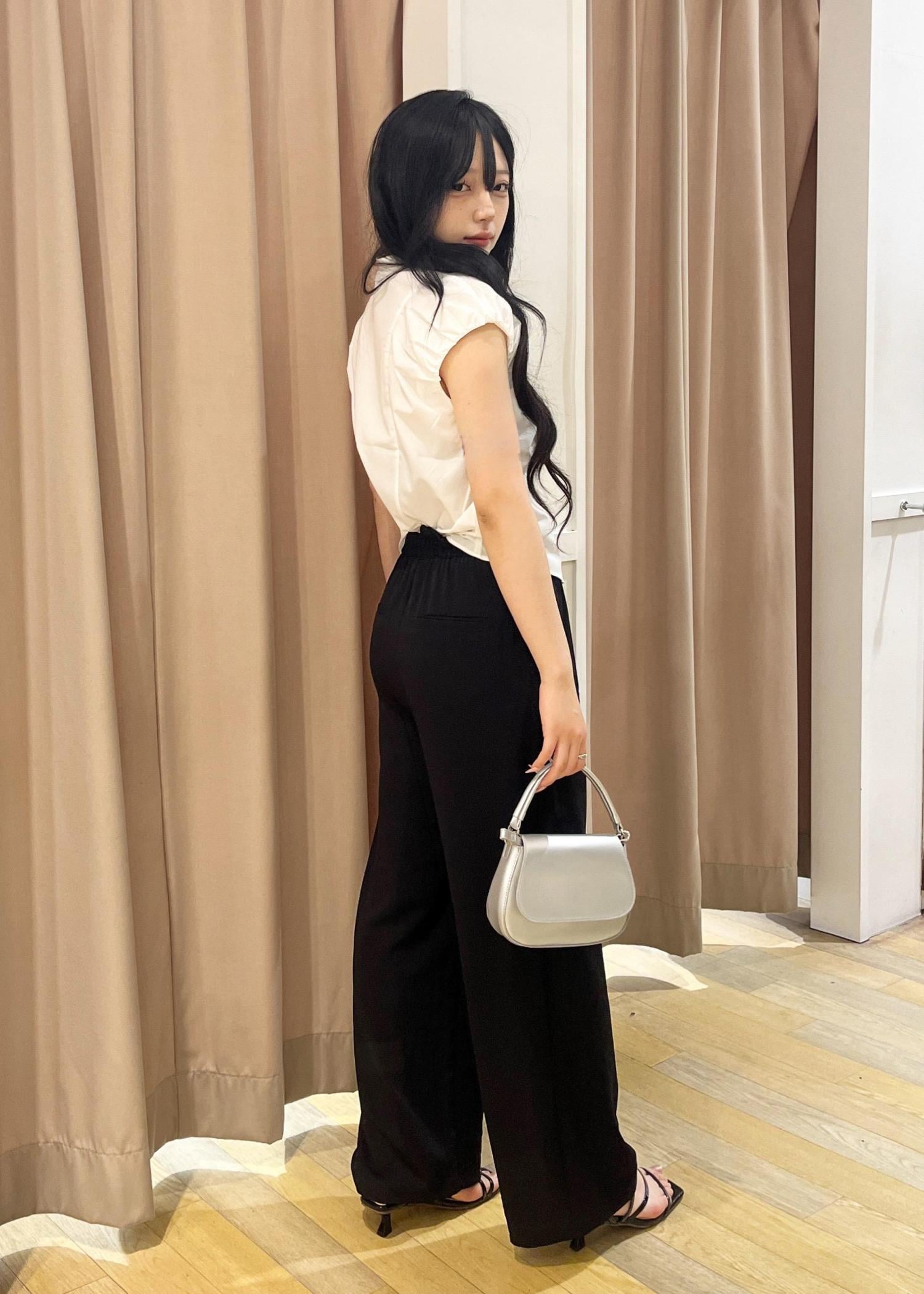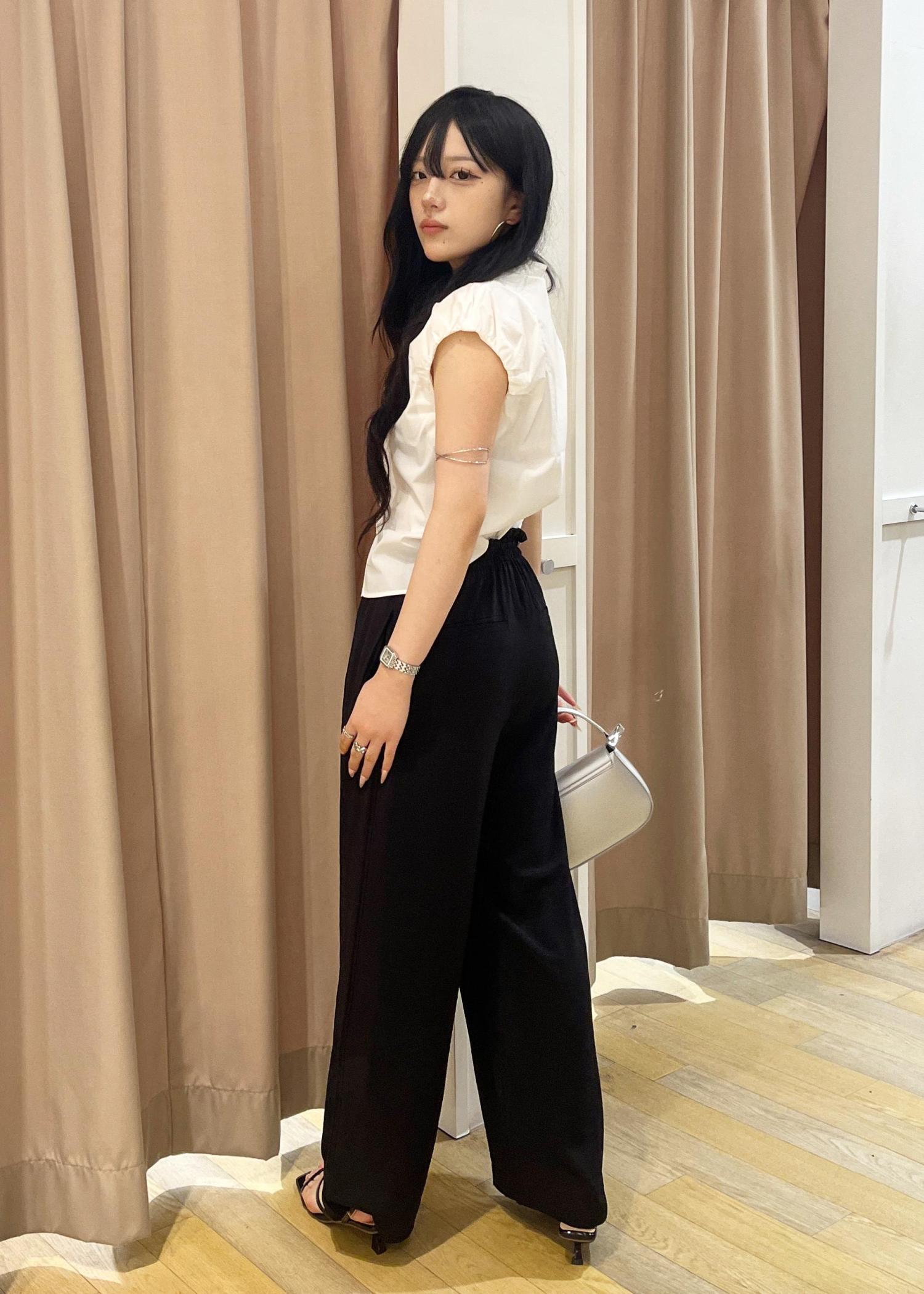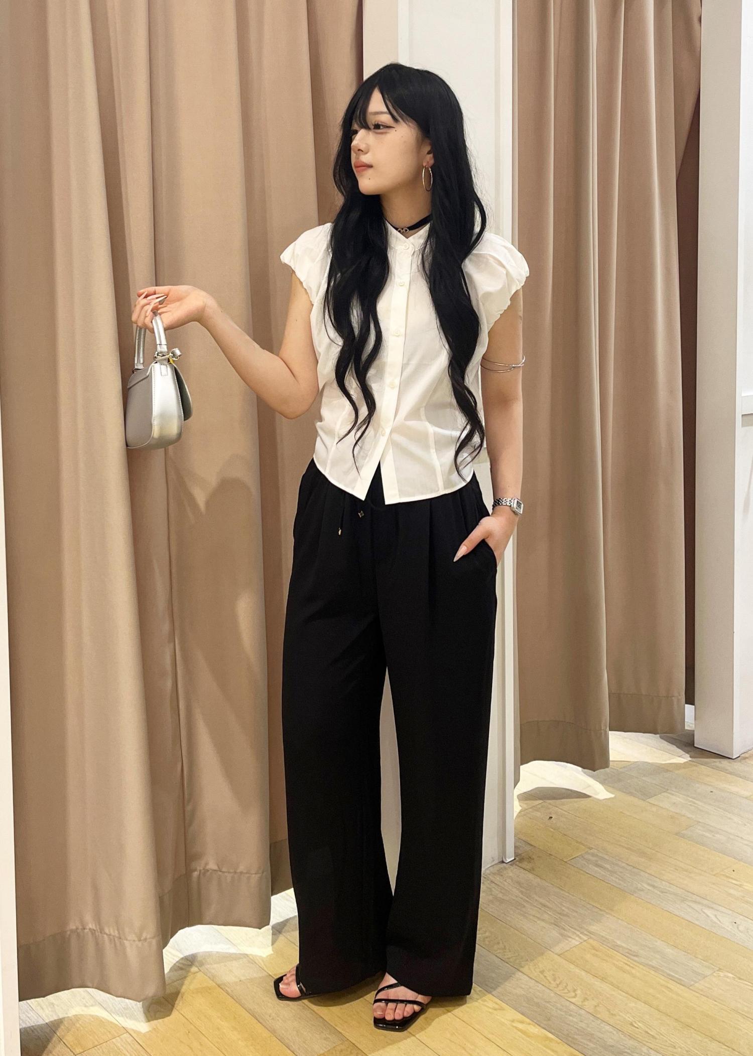 白ブラウスの爽やかさと黒パンツの落ち感で、洗練された大人の魅力を演出。ミニバッグと華奢サンダルが女性らしさを引き立て、アクセサリーでさりげない個性をプラスした上品コーデ!