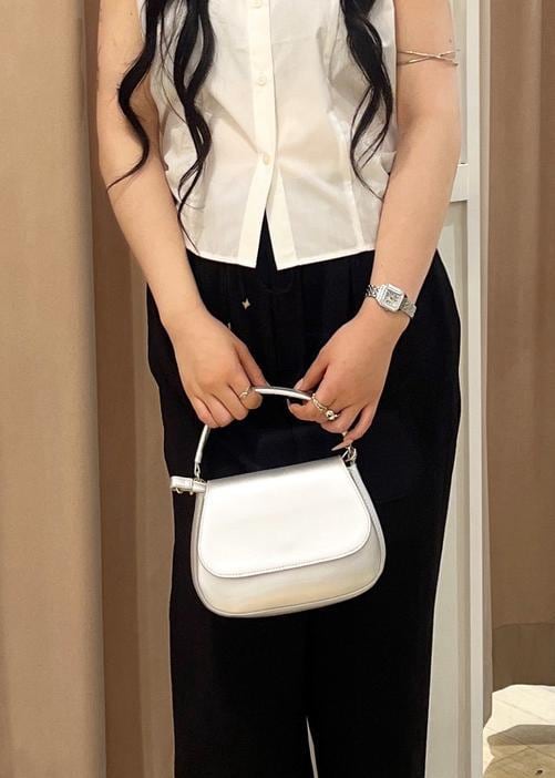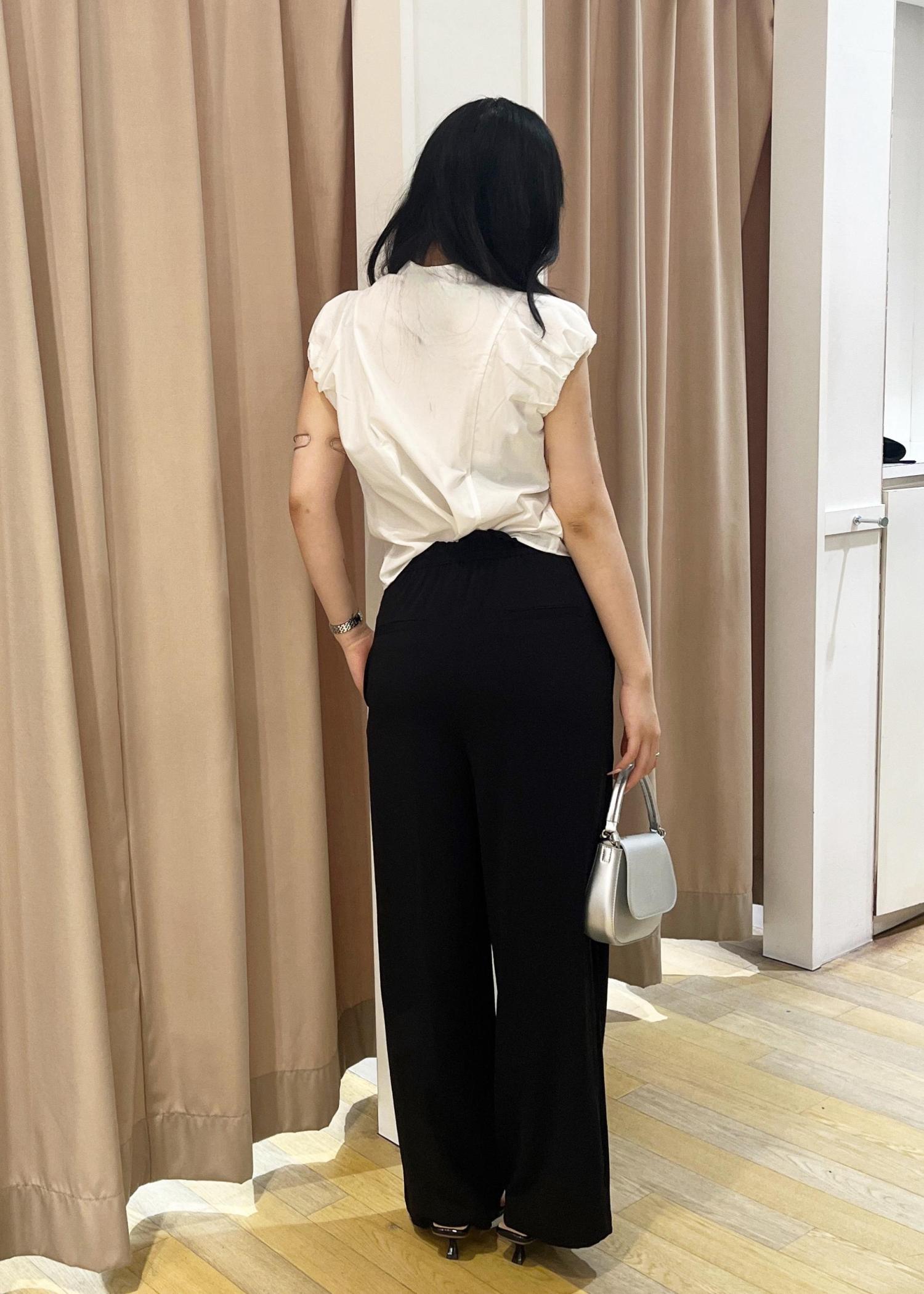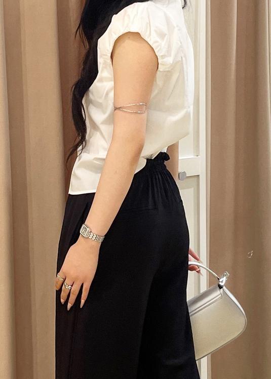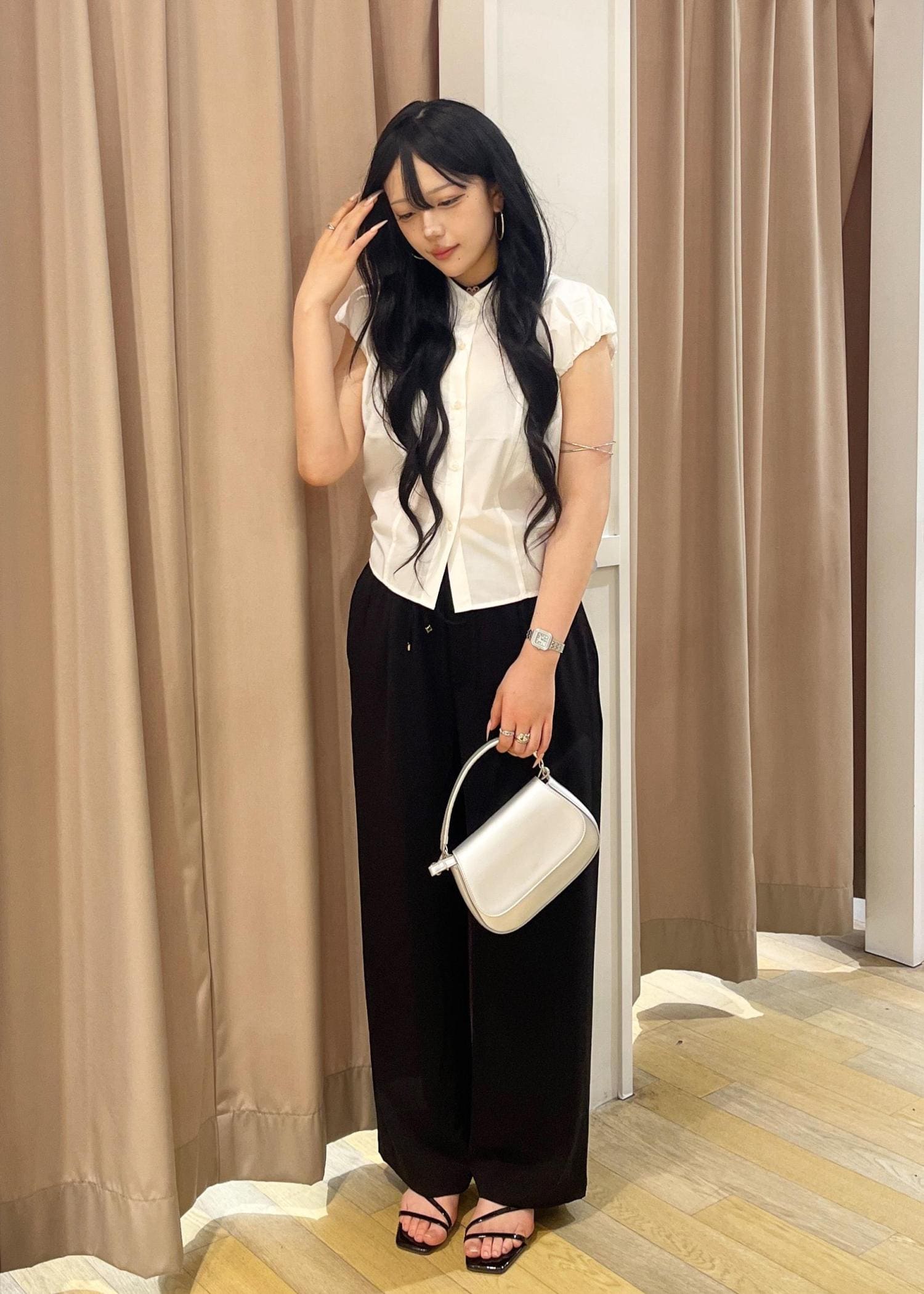 白ブラウスの爽やかさと黒パンツの落ち感で、洗練された大人の魅力を演出。ミニバッグと華奢サンダルが女性らしさを引き立て、アクセサリーでさりげない個性をプラスした上品コーデ!