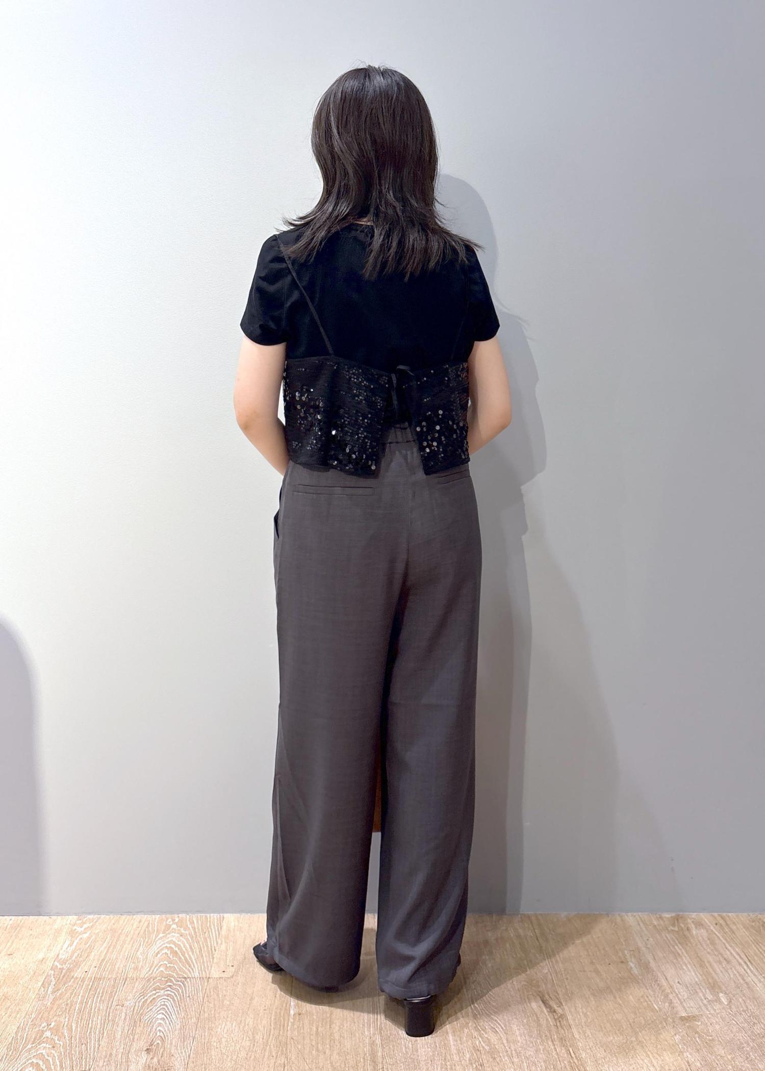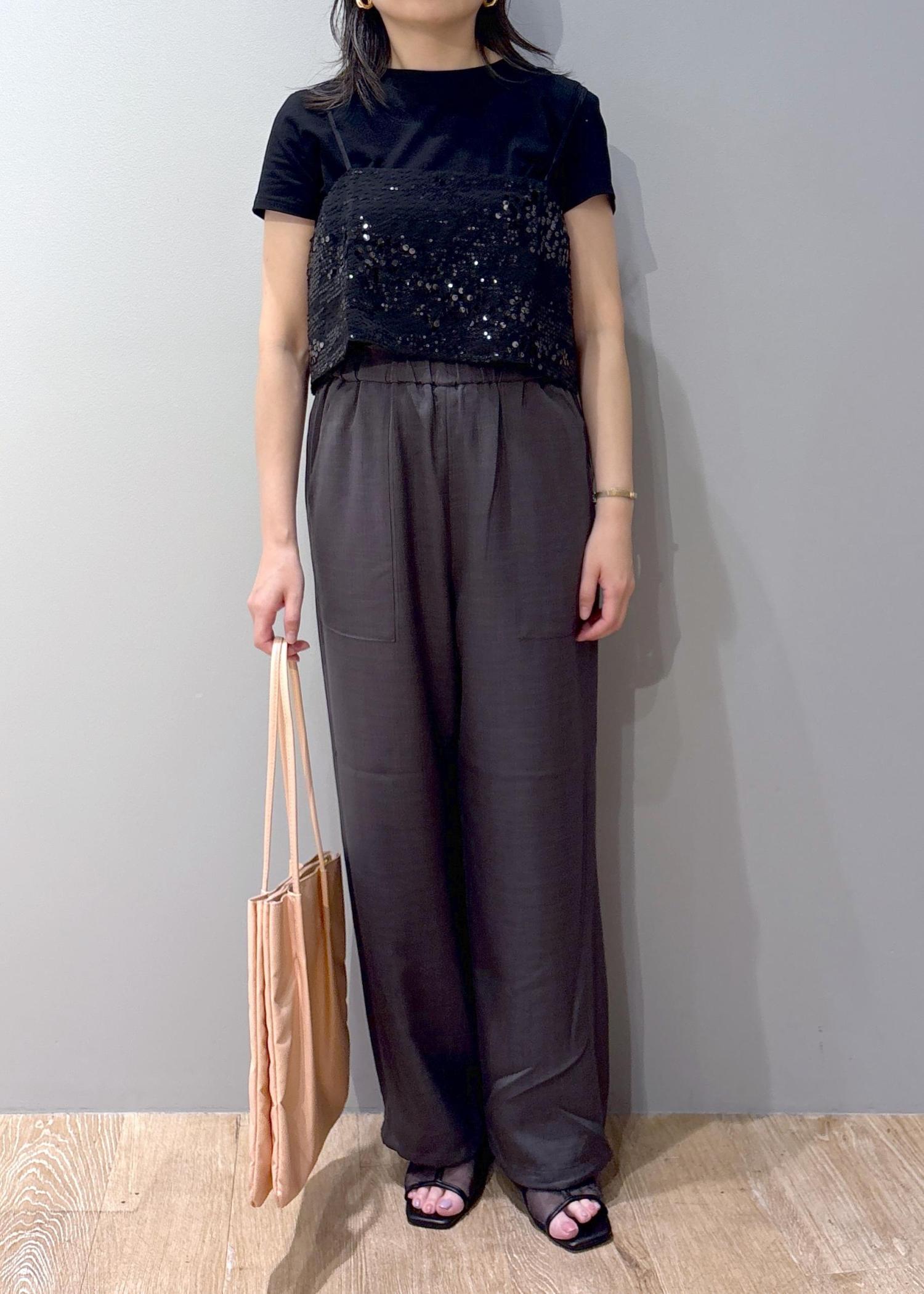 キラキラ映えるスパンコールビスチェを使った大人カジュアルコーディネート。