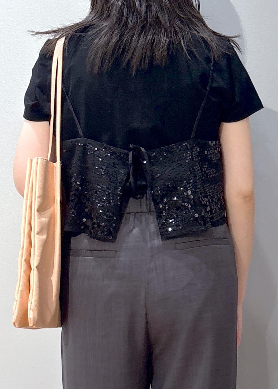 キラキラがしっかり映えるスパンコールビスチェは、後ろに結んだリボンもおしゃれです。