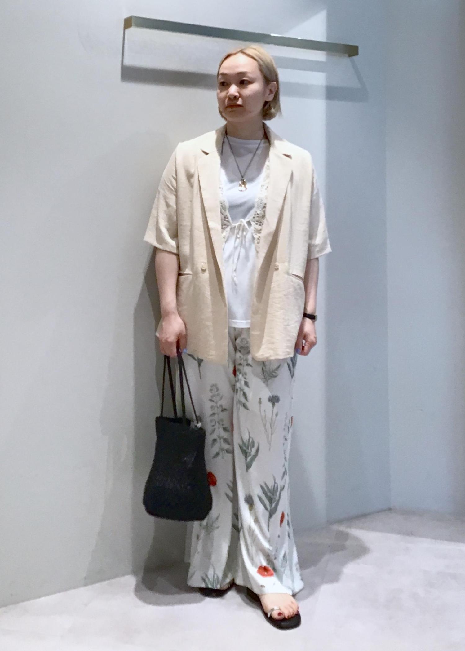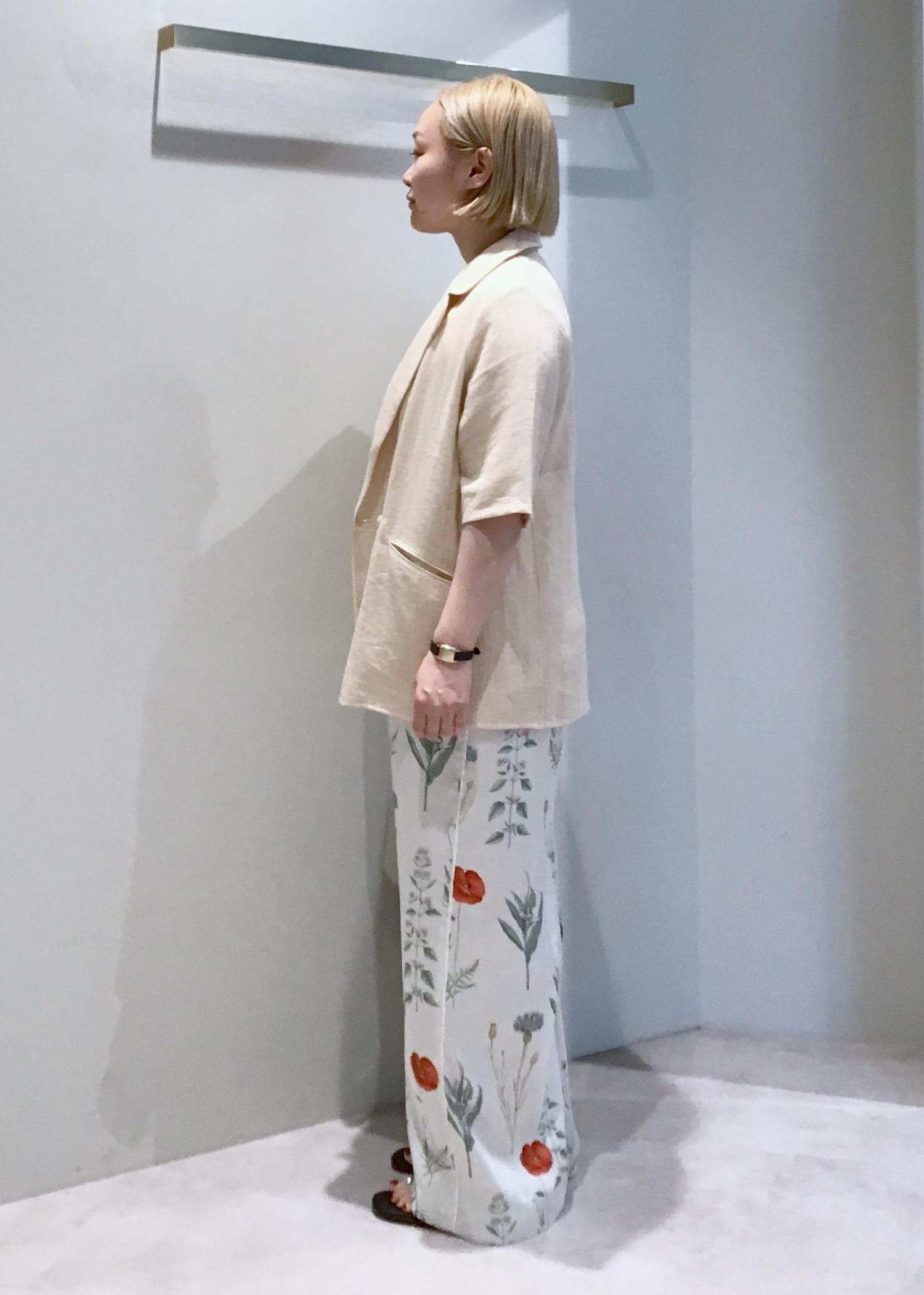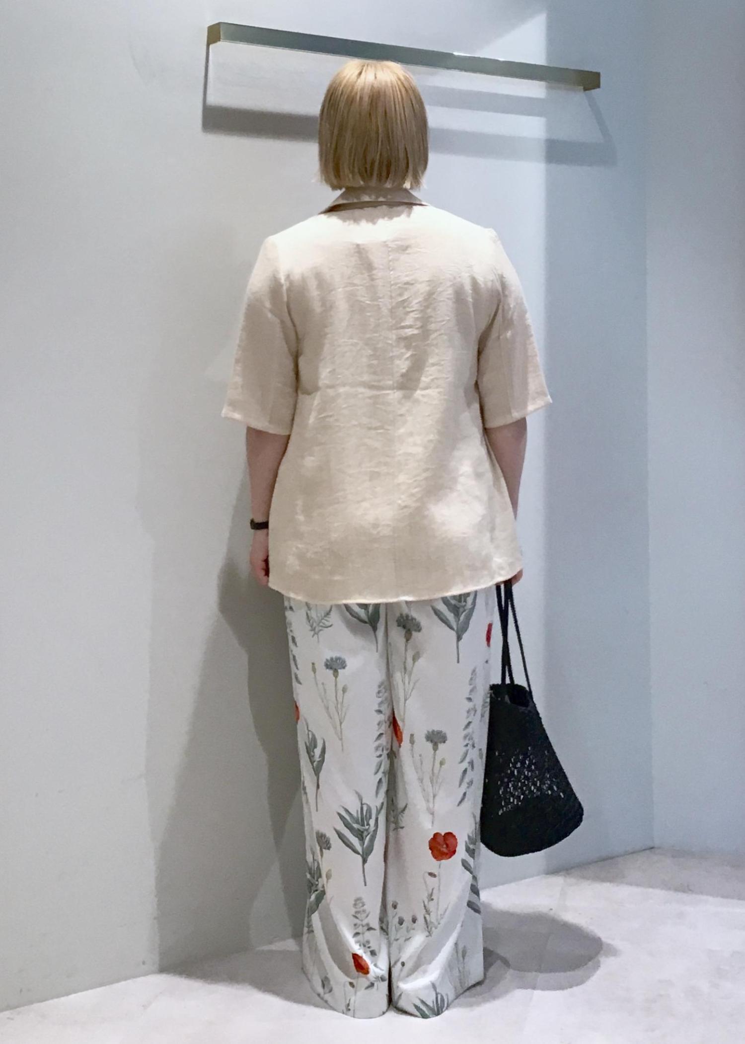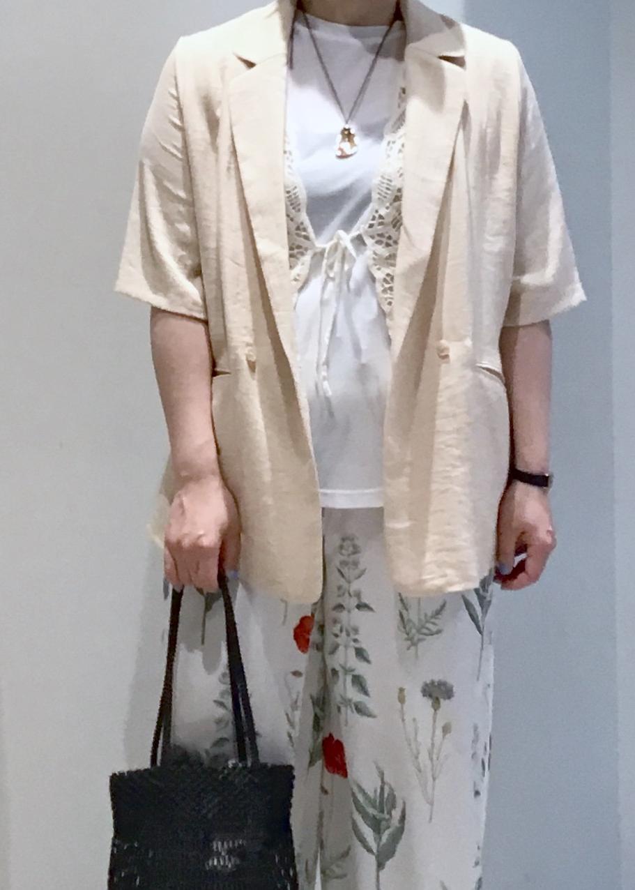 落ち感のあるシルエットときれい見えする素材で、麻調ジャケットと楽ちんに合わせても上品にまとまります。