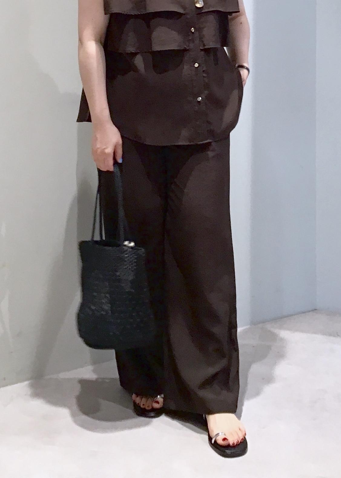LE CERCLE par ropé【セットアップ対応】タンブラーブッチャーワイドパンツダークブラウン / F¥9,790レビューウエストゴムで楽ちんな着心地。さらりと肌離れする生地で清涼感のある素材です。155cmでフルレングスの丈感です。