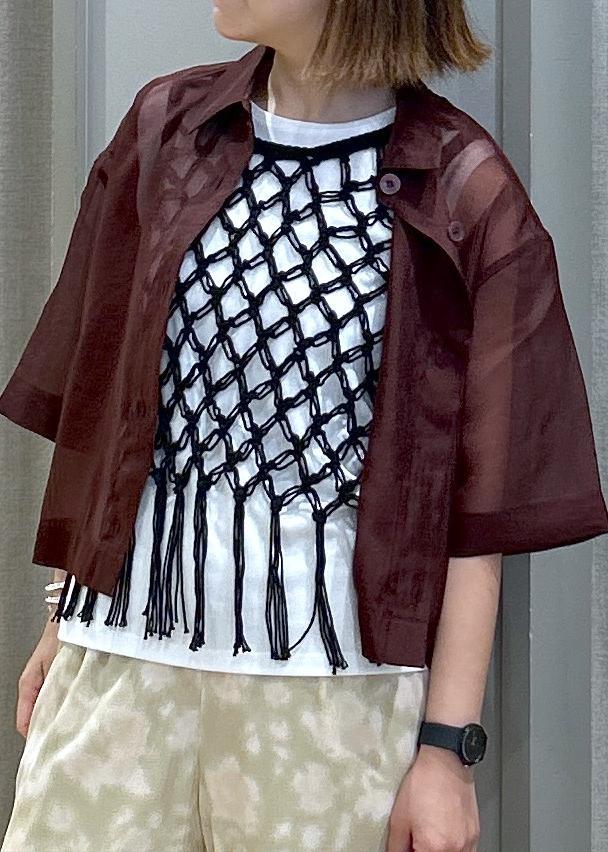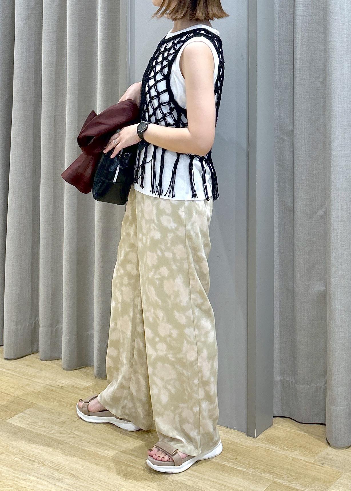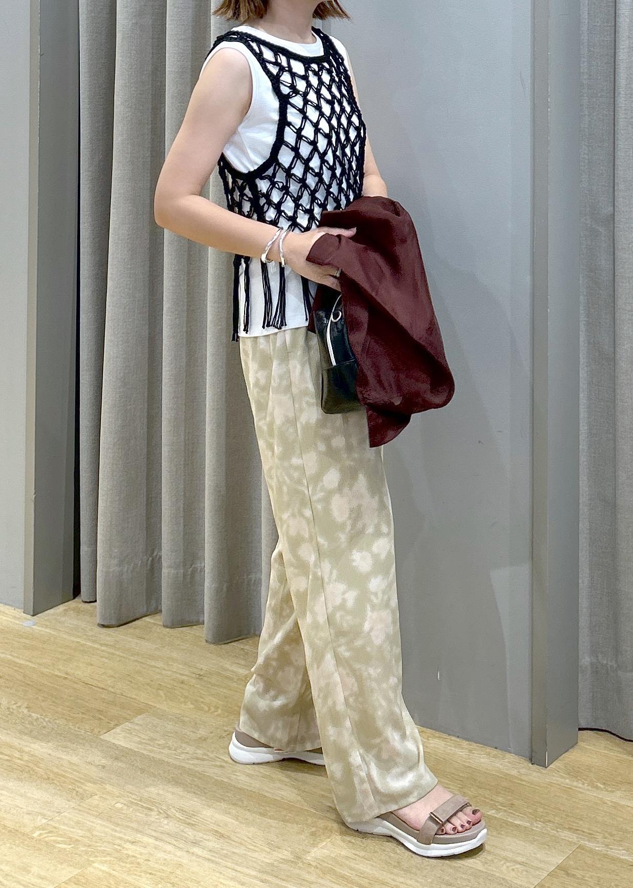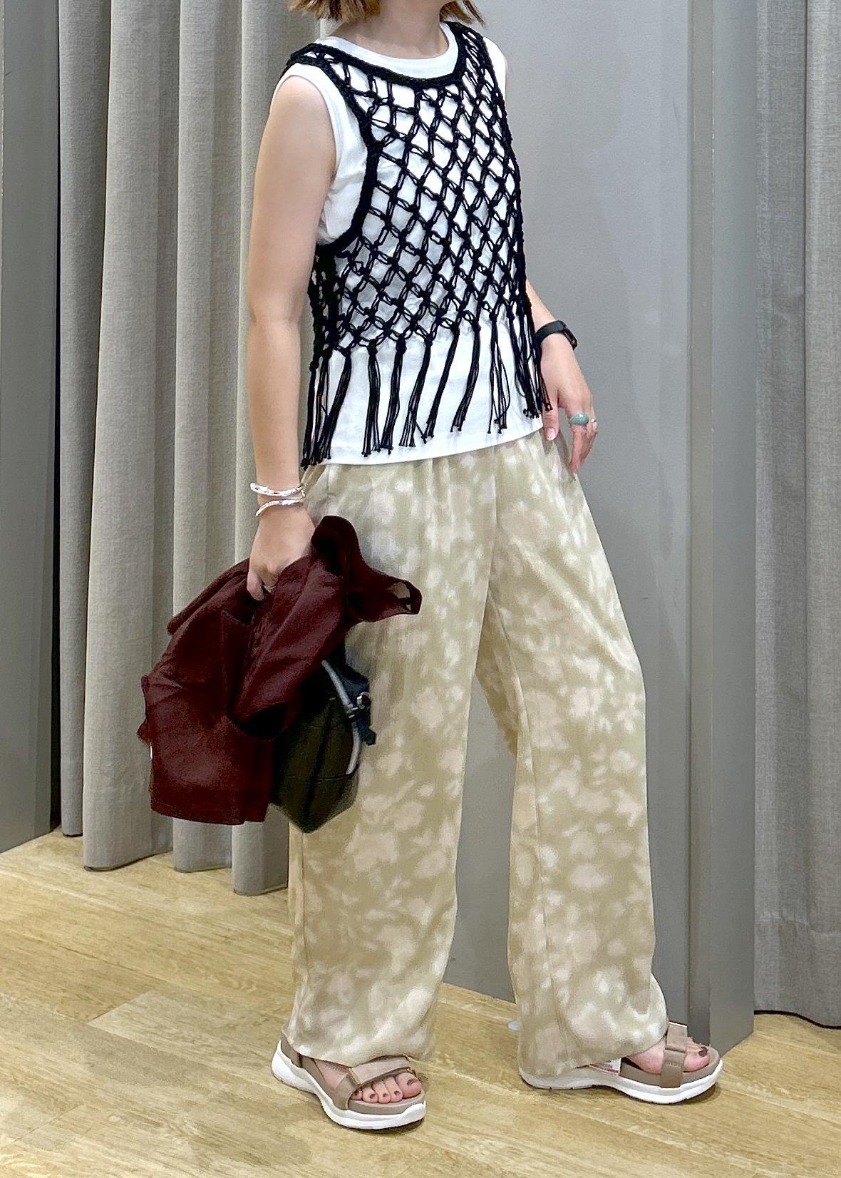 柄物パンツでも茶色やベージュで落ち着いたトーンに