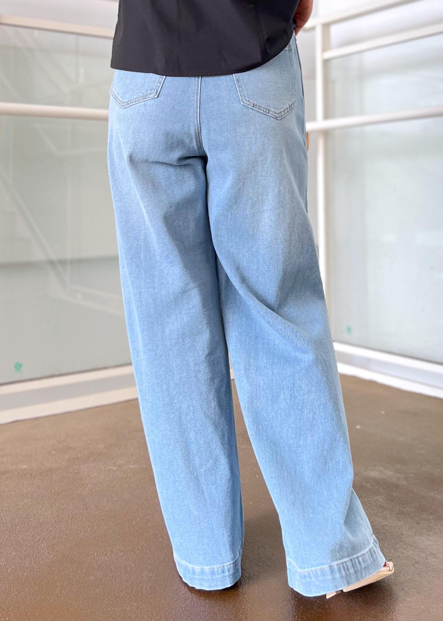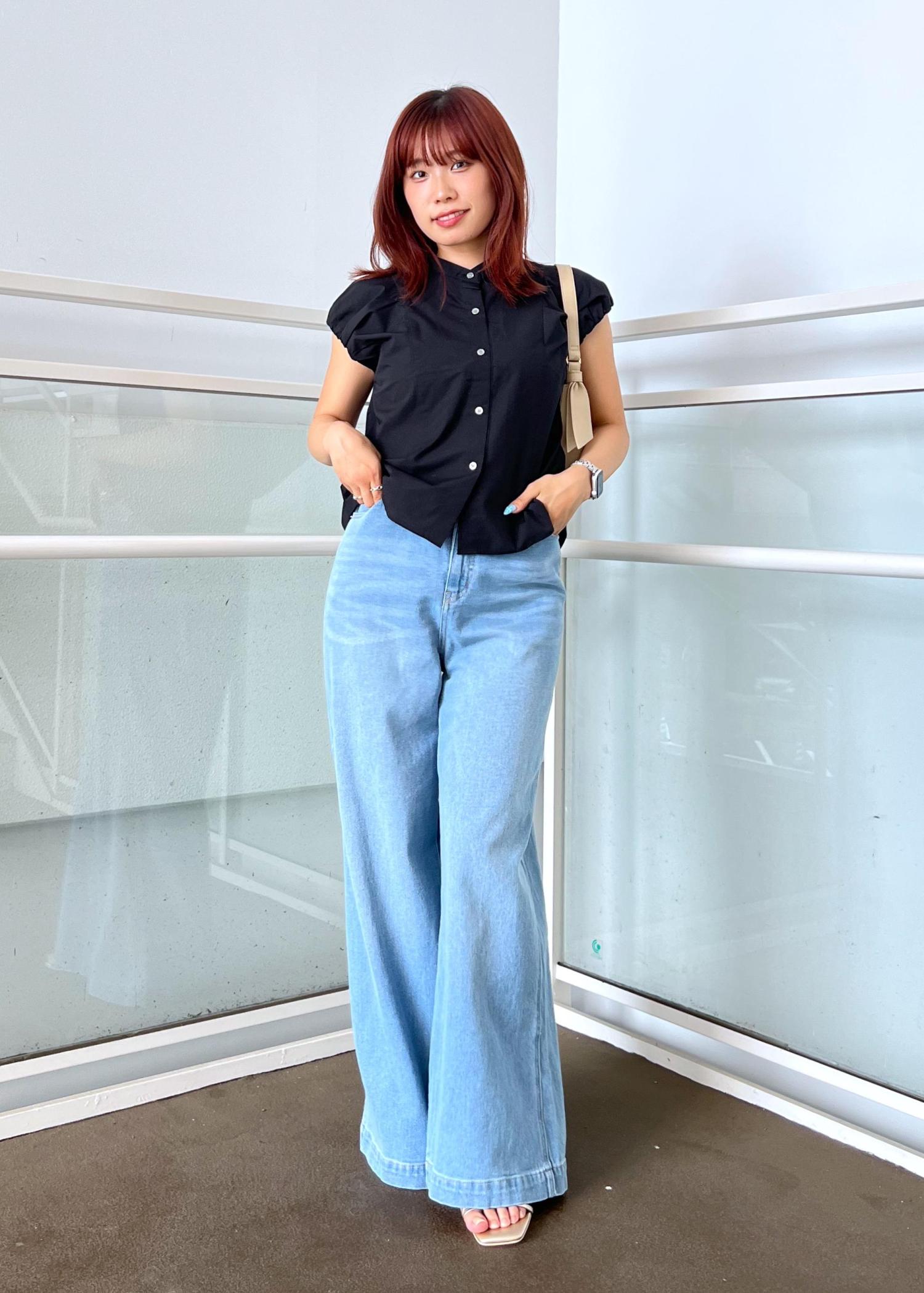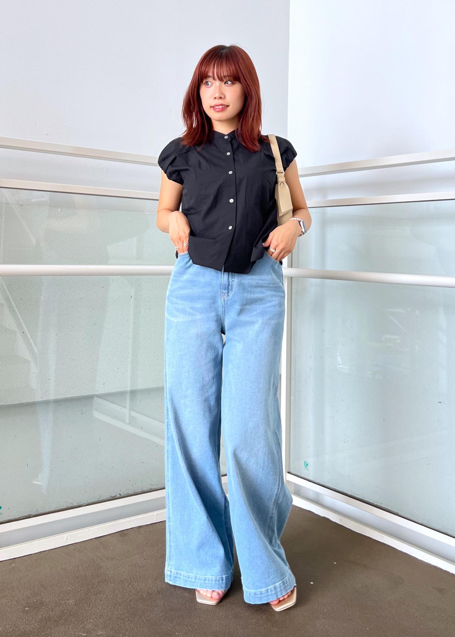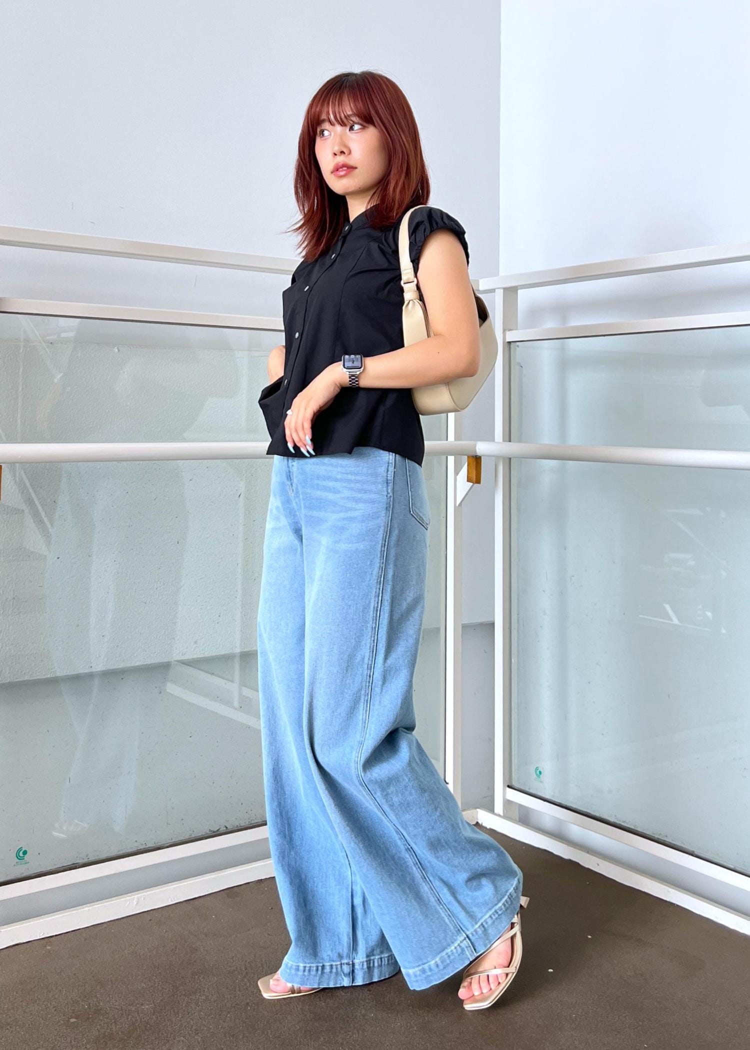 ワイドデニム一緒に合わせて、ミニマムでお洒落なスタイリングを組みました。小物はゴールドのシューズ、くすみイエローのバッグで統一感 を出しています。