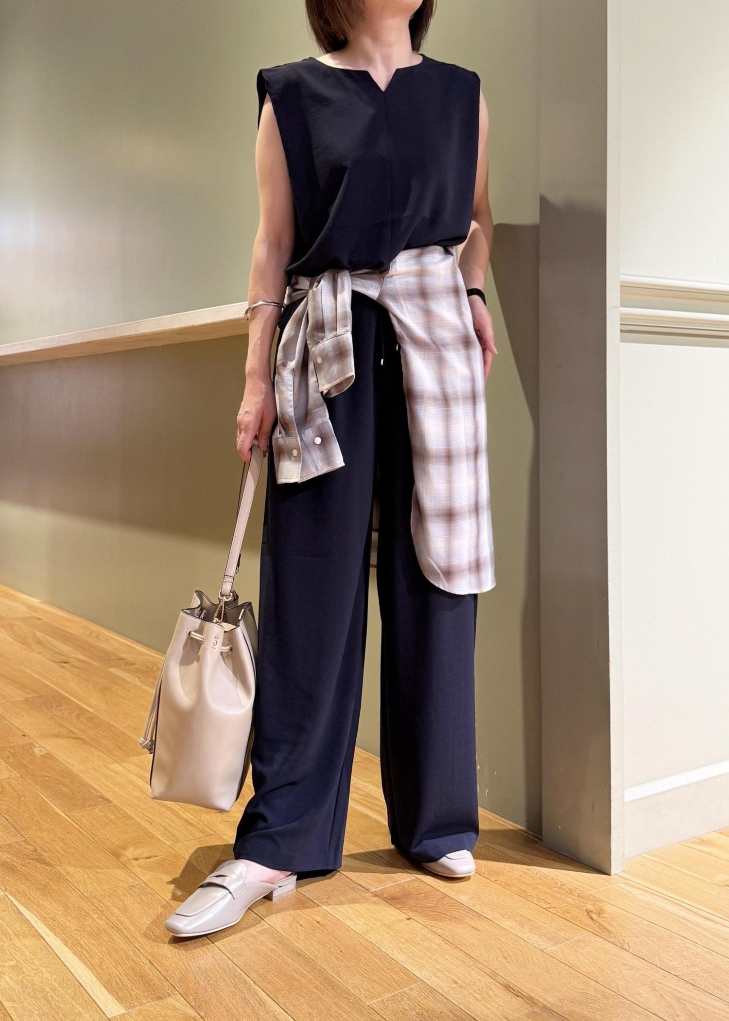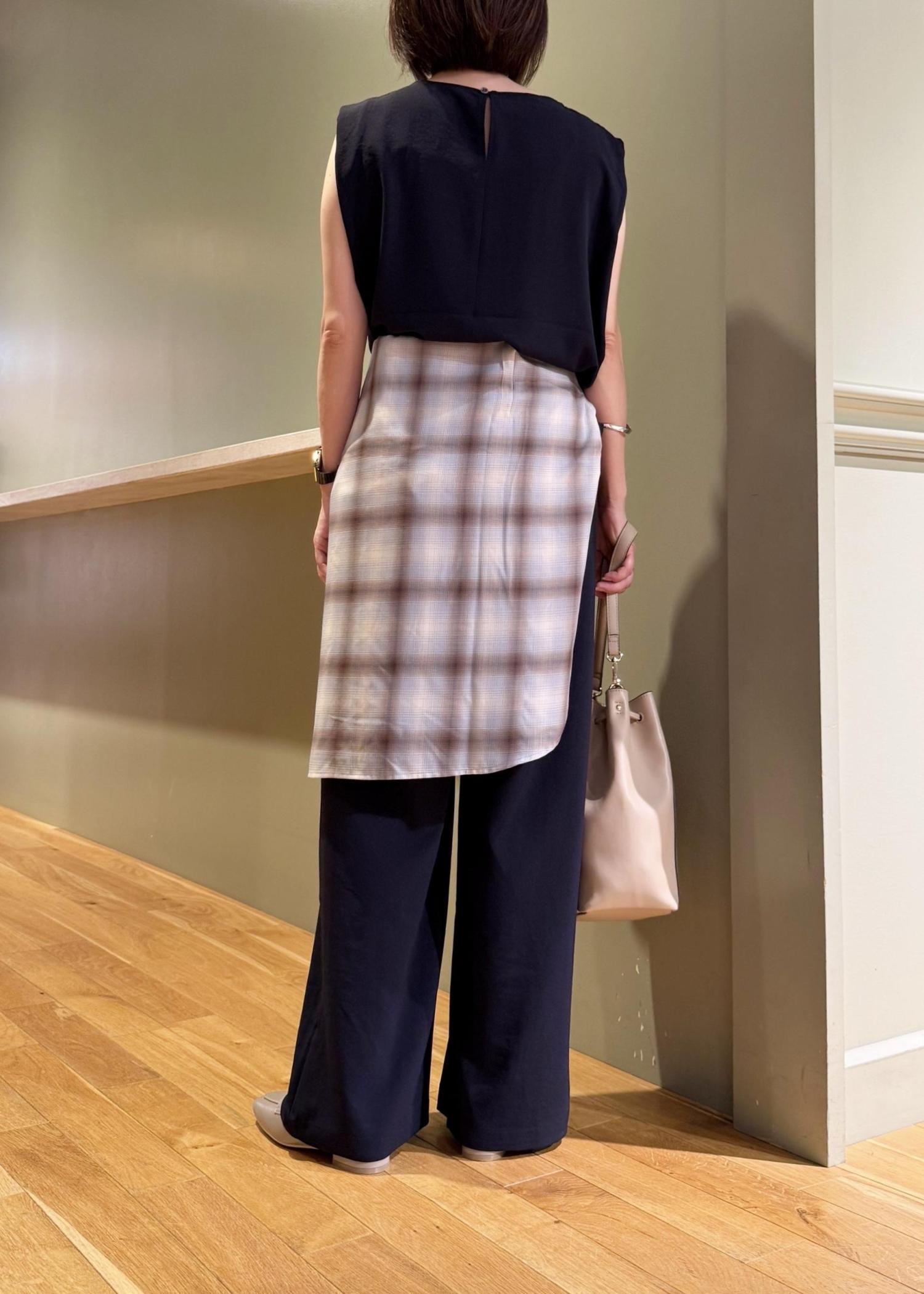 キレイめでも使えるジョーゼットのノースリーブセットアップをチェックシャツをアクセントにカジュアルオフしました。