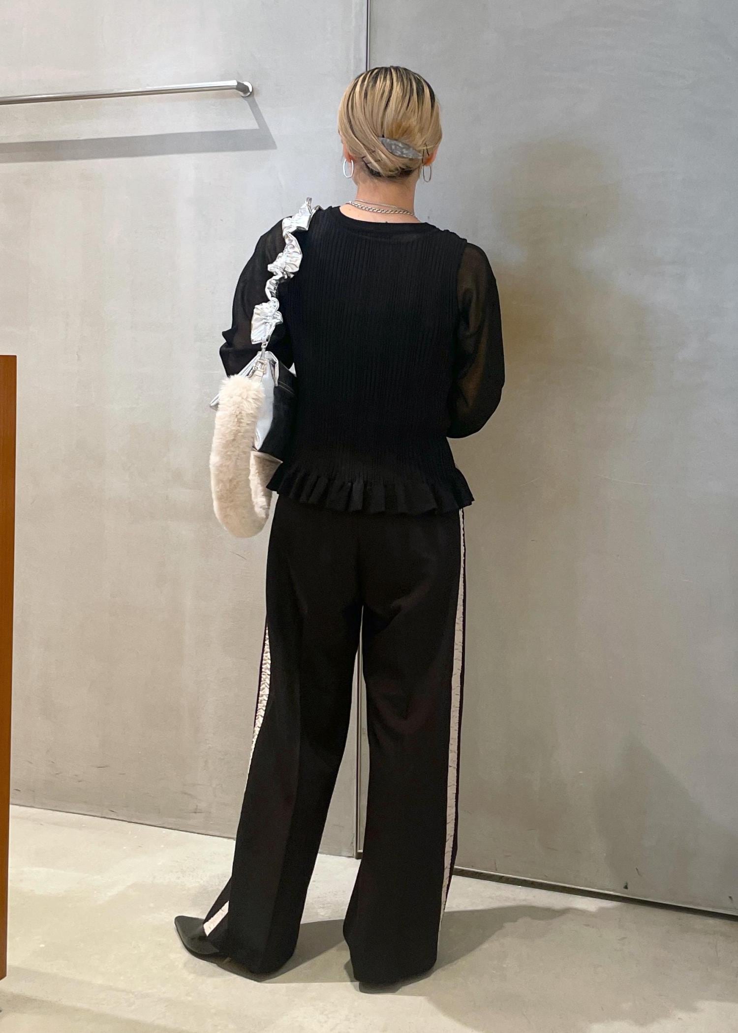 カーディガンよりも少し長めな丈感のタンクトップは、裾がフリルになっていてレイヤードに可愛らしさが感じます。