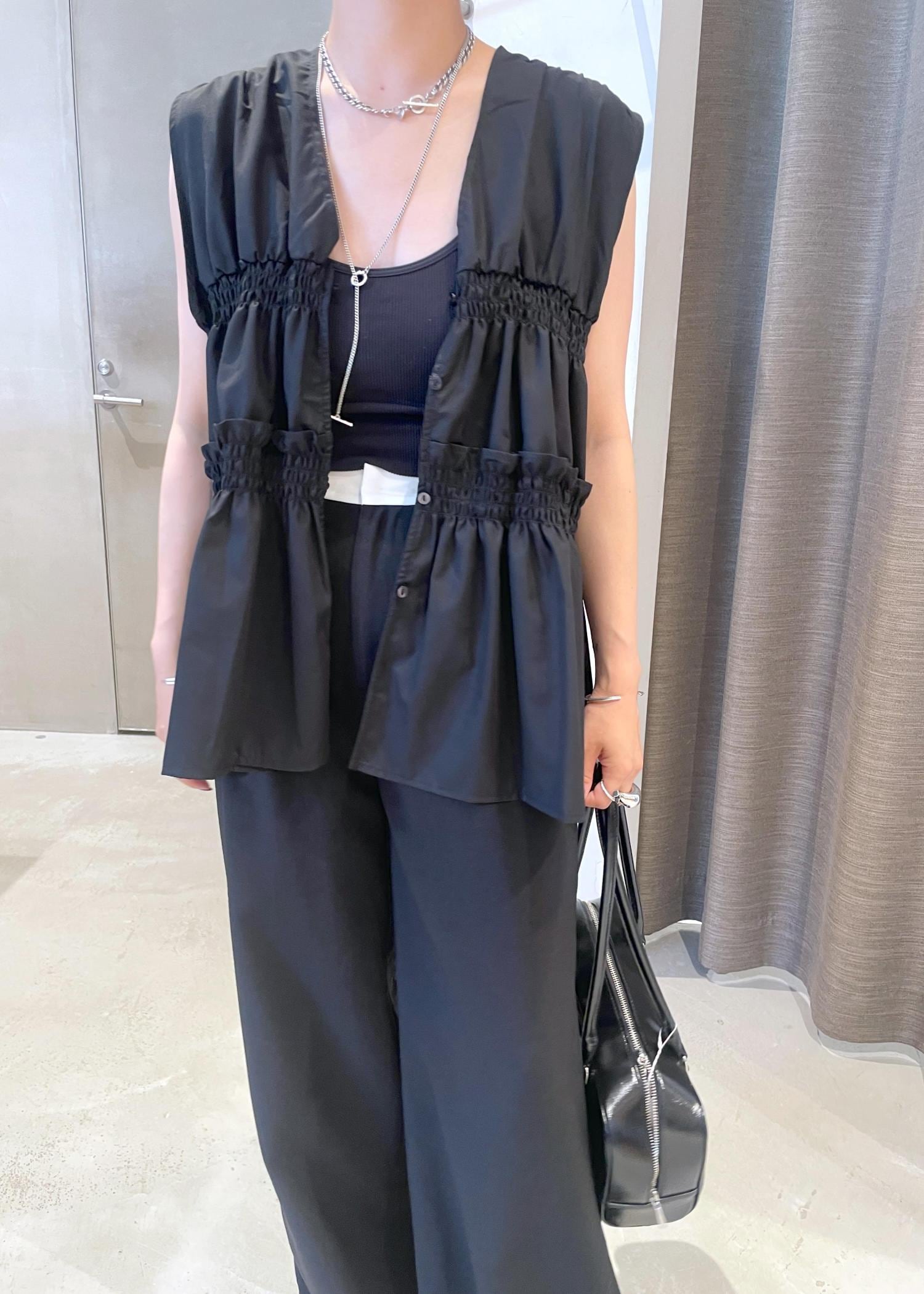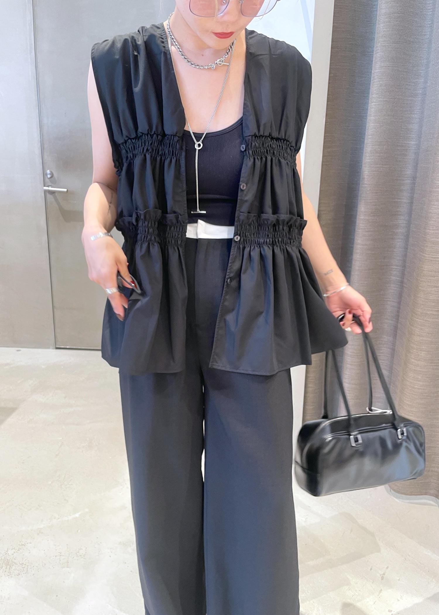 トップスは軽く羽織れるギャザーたっぷりフェミニンなブラウスで涼しく、